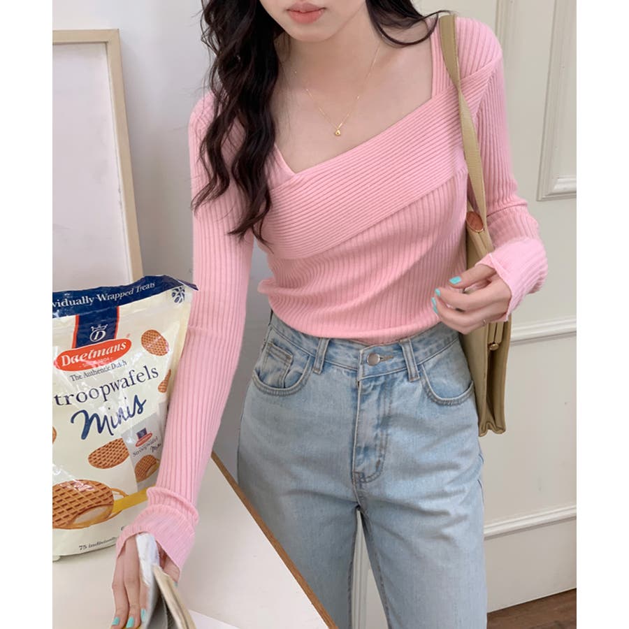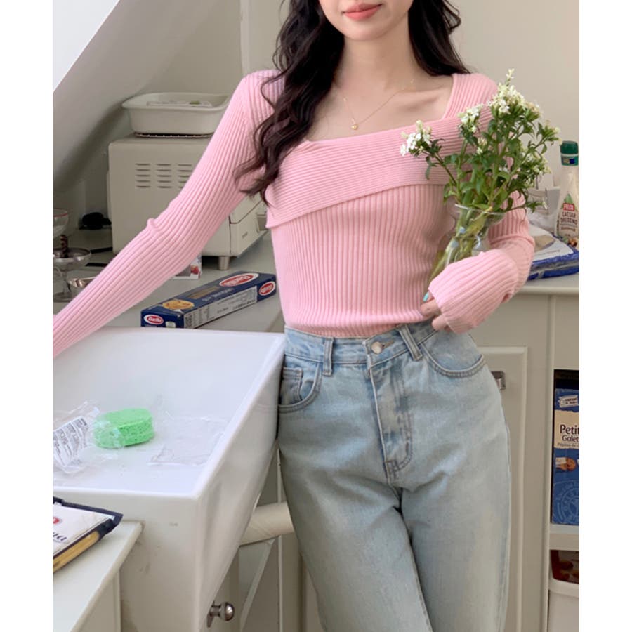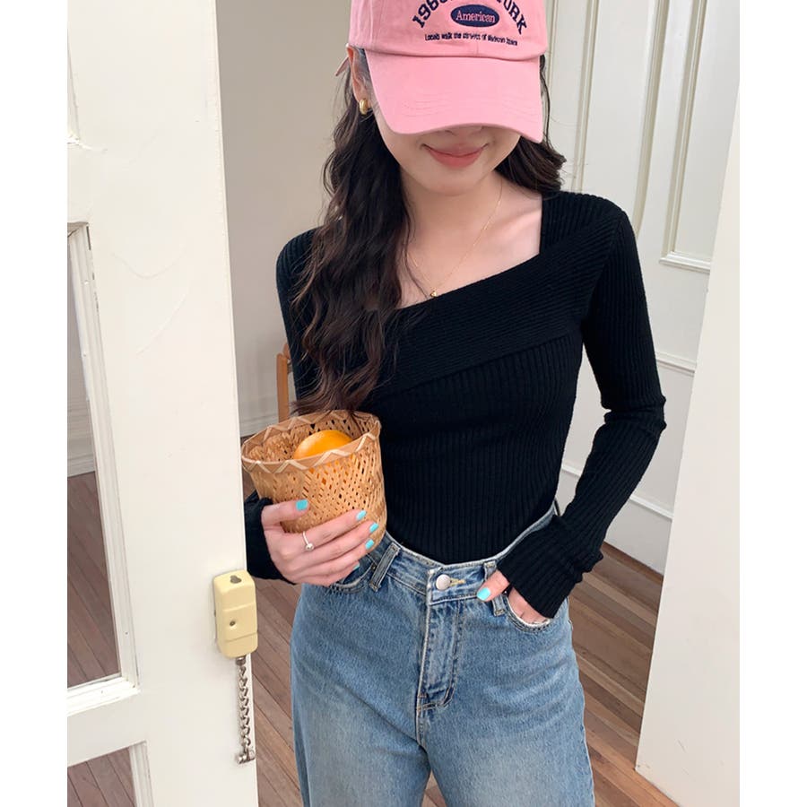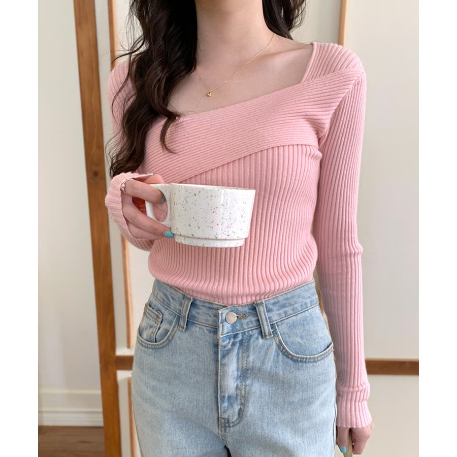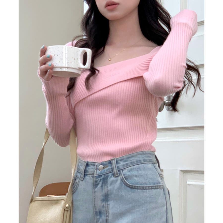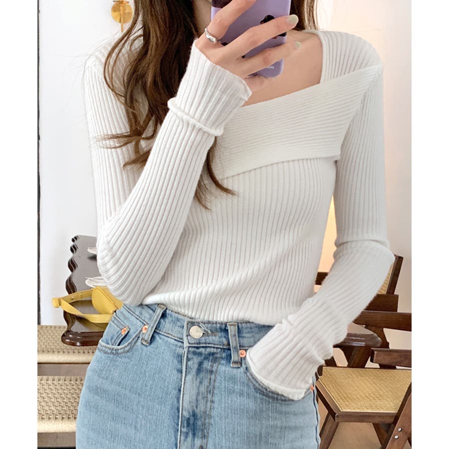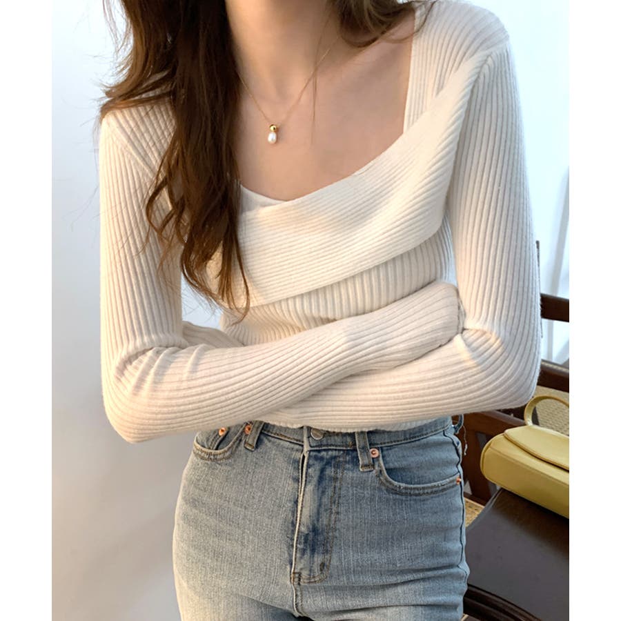 着回し力抜群のデコルテ見せデザインニット。
