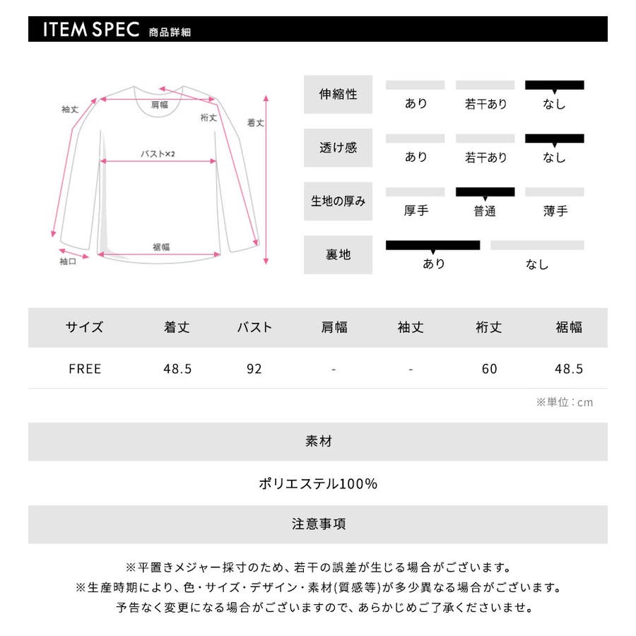 着丈:48.5cm / バスト:92cm / 裄丈:60cm / 裾幅:48.5cm