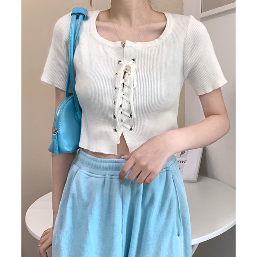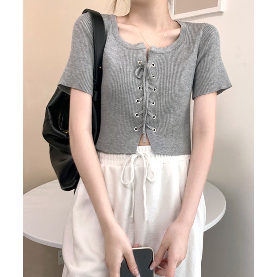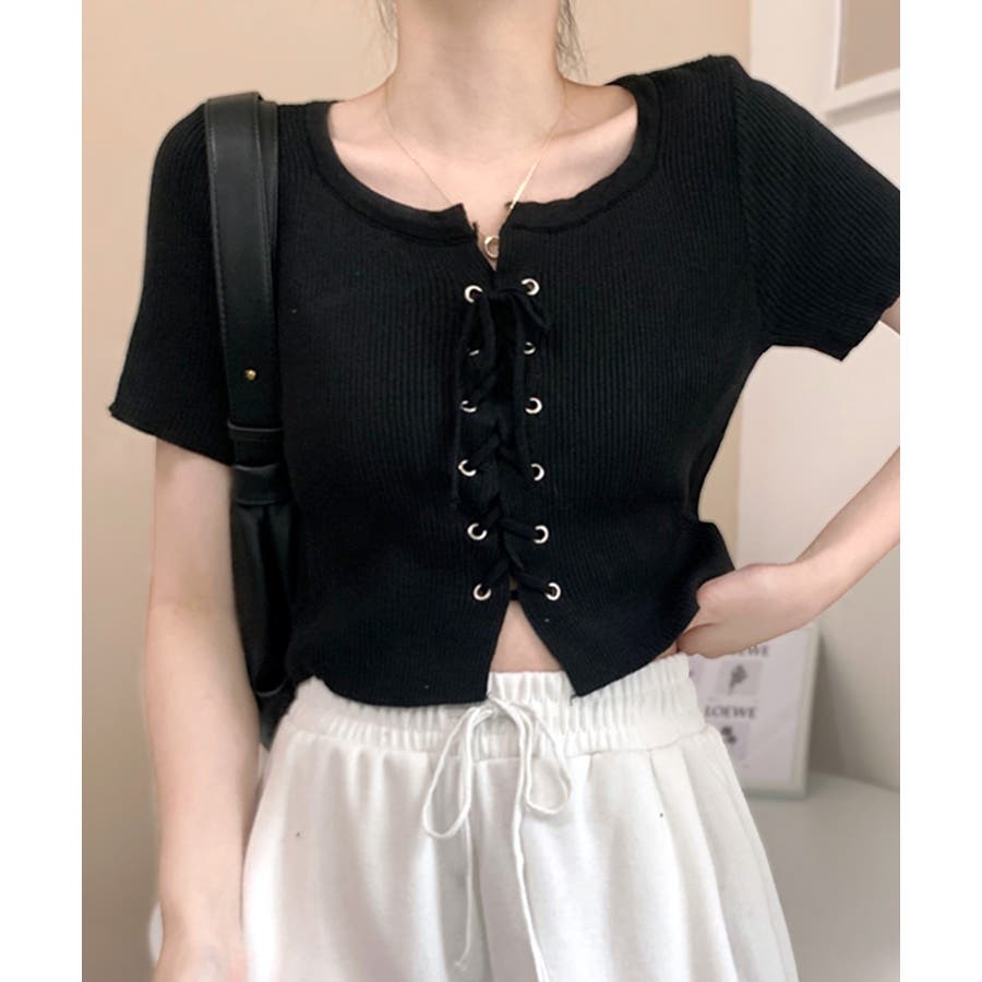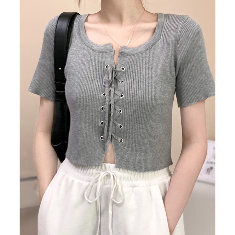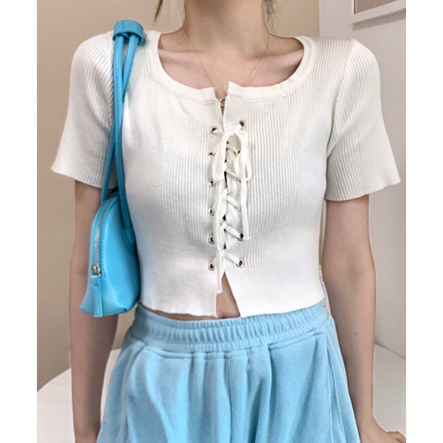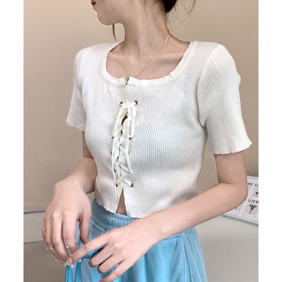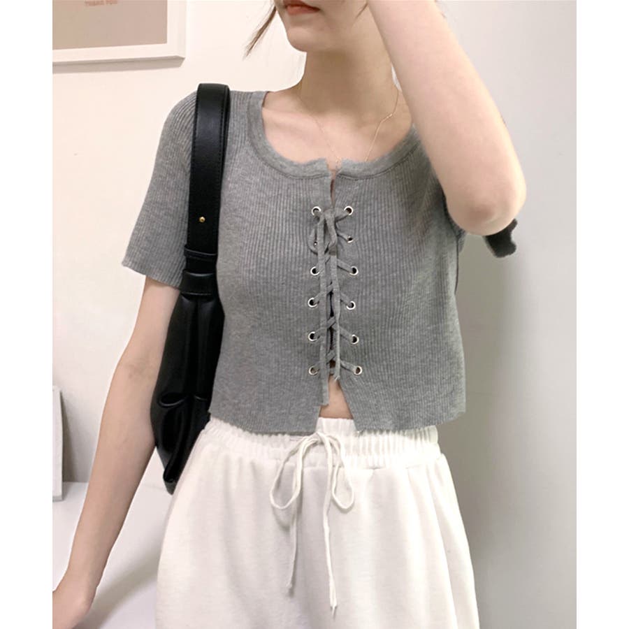 レースアップ半袖リブニット クロップド丈 リブ編み