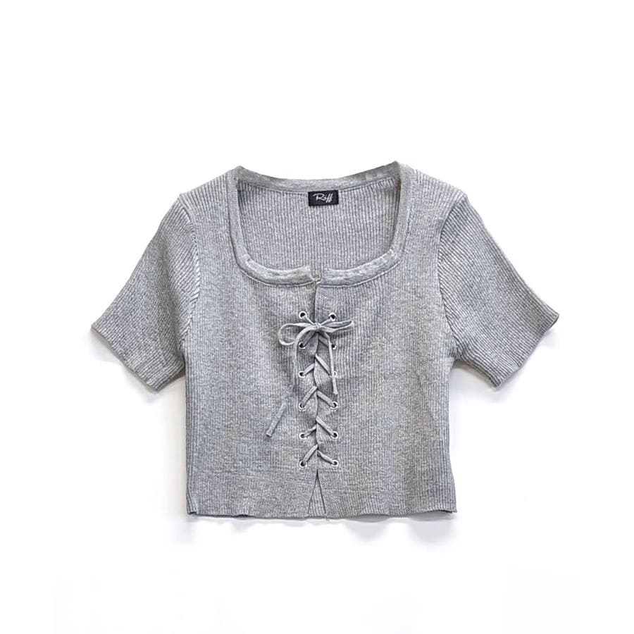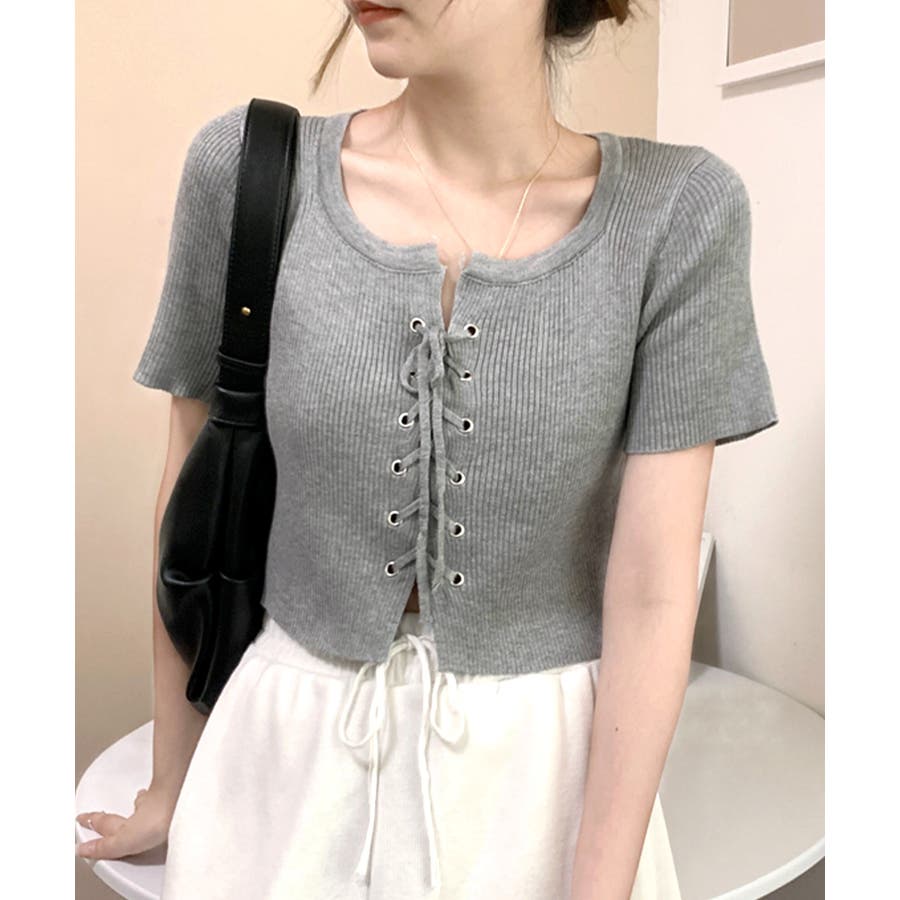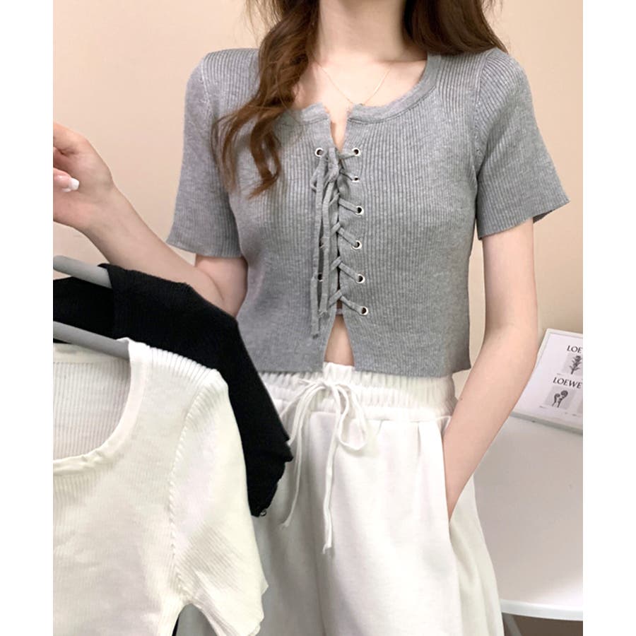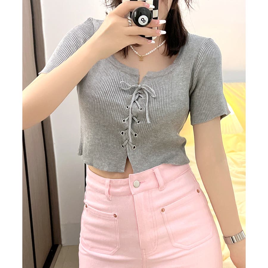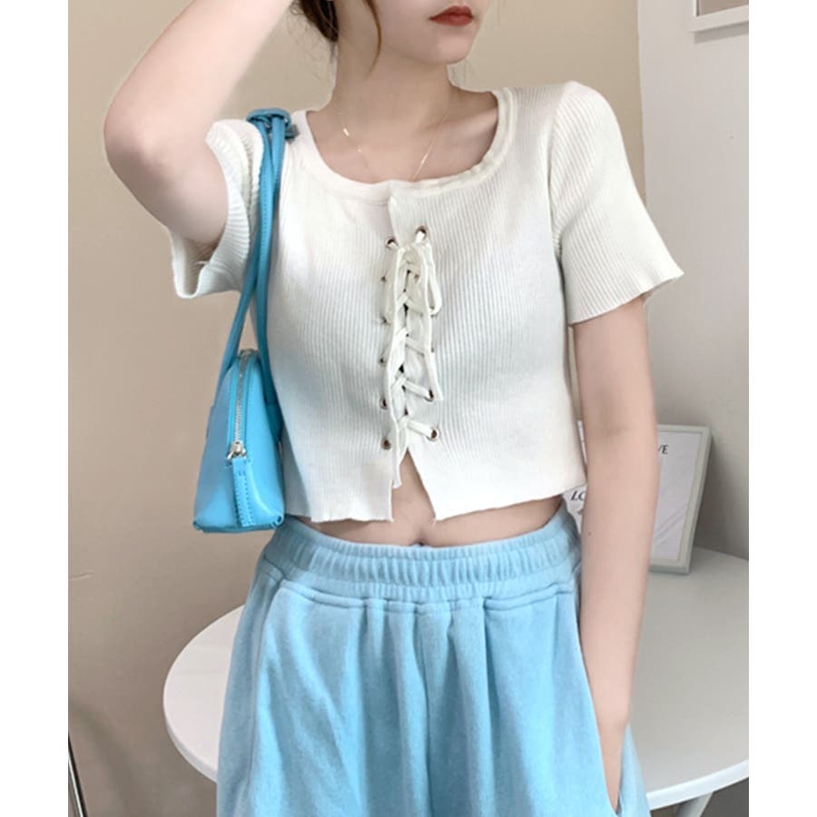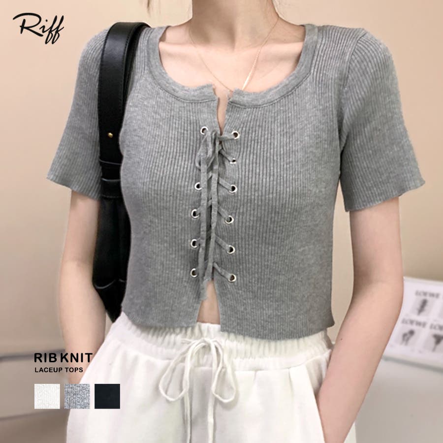 レースアップ半袖リブニット クロップド丈 リブ編み