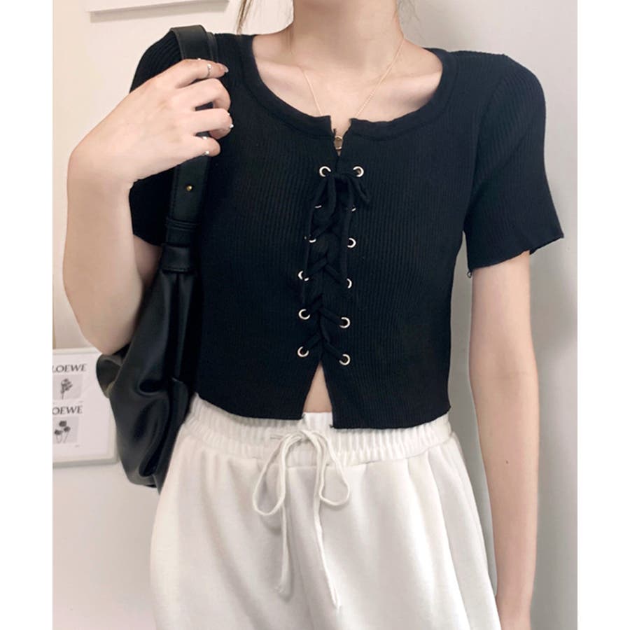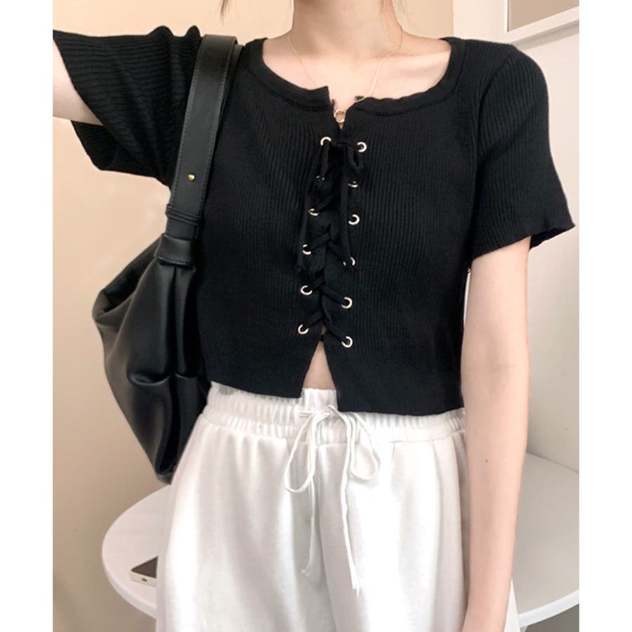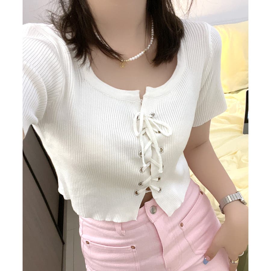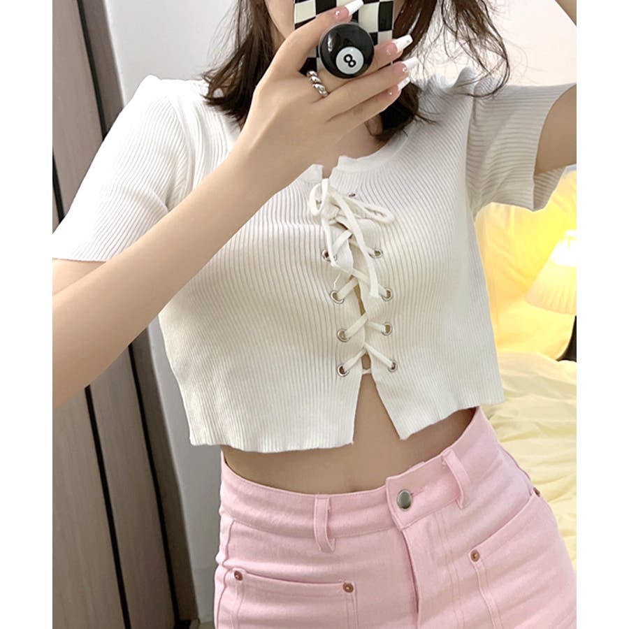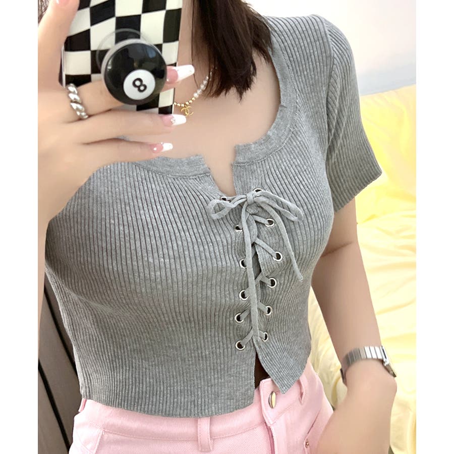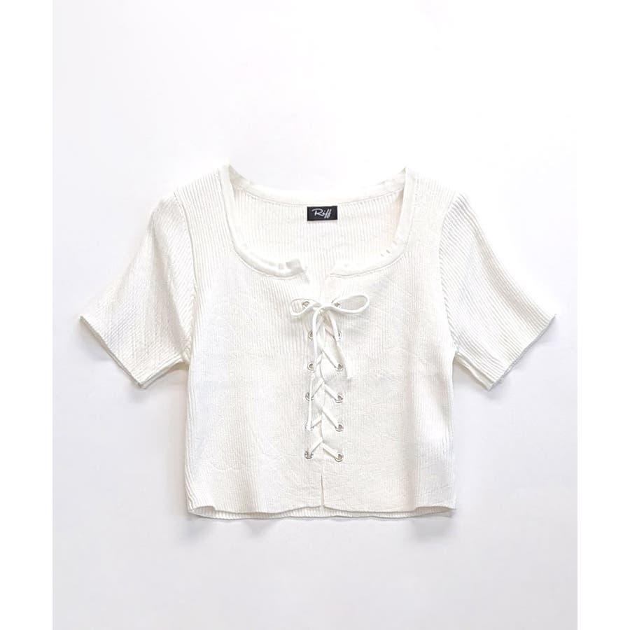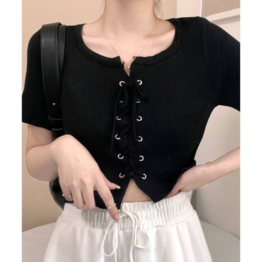 レースアップ半袖リブニット クロップド丈 リブ編み