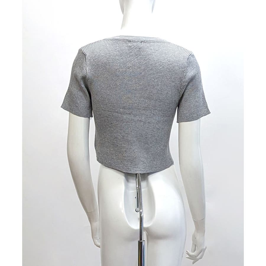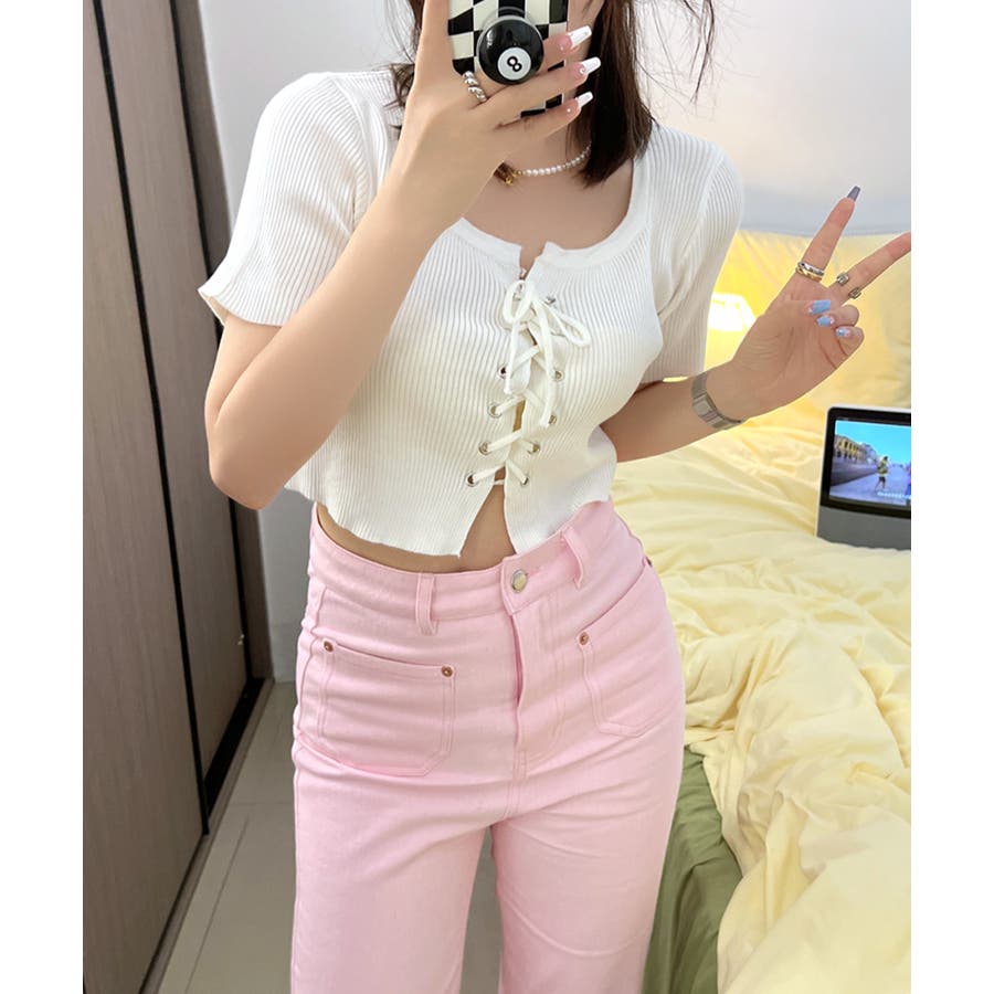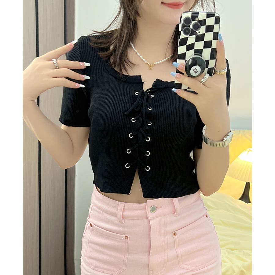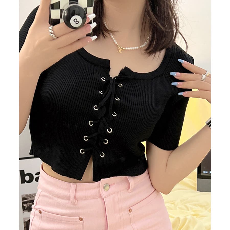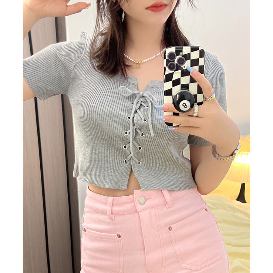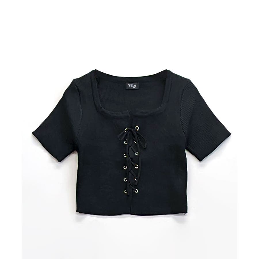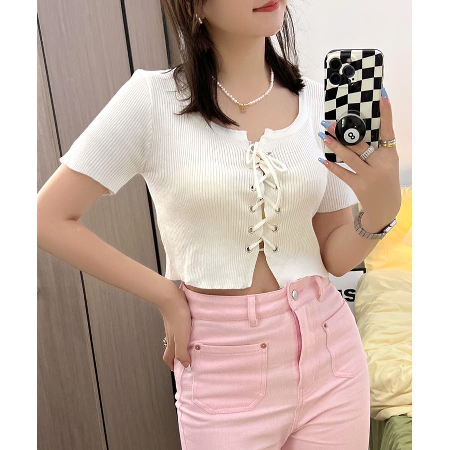 レースアップ半袖リブニット クロップド丈 リブ編み