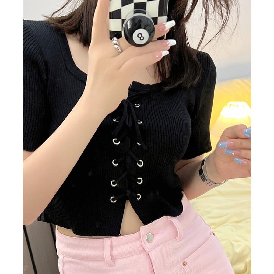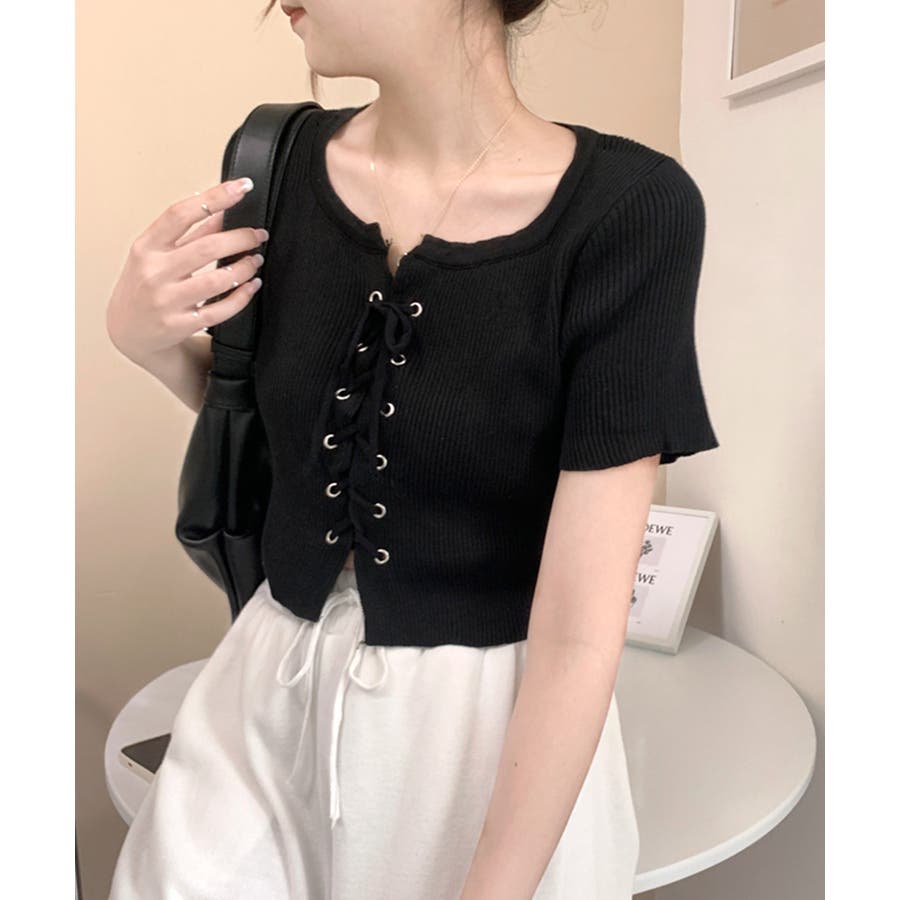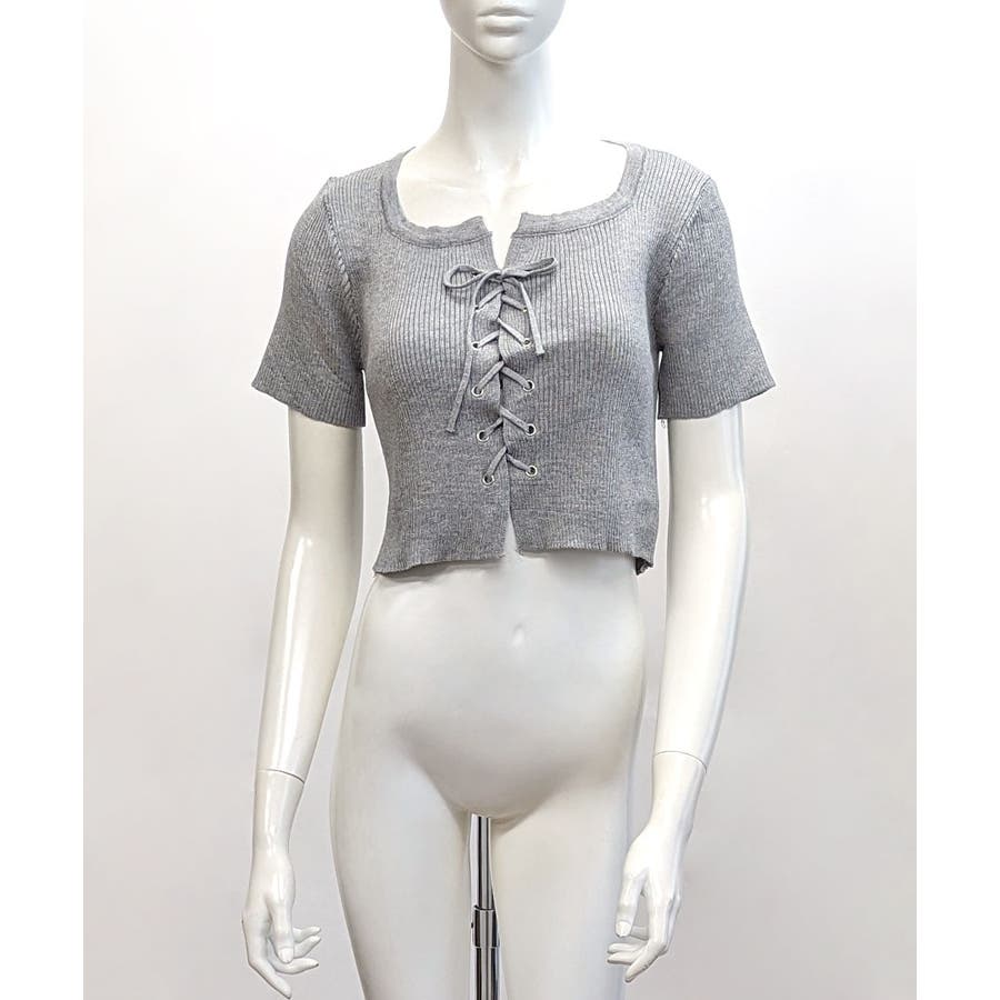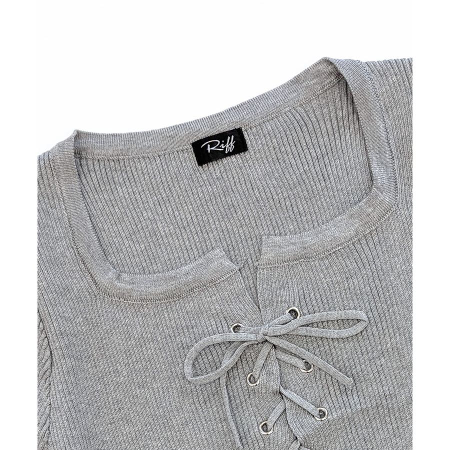 レースアップ半袖リブニット
