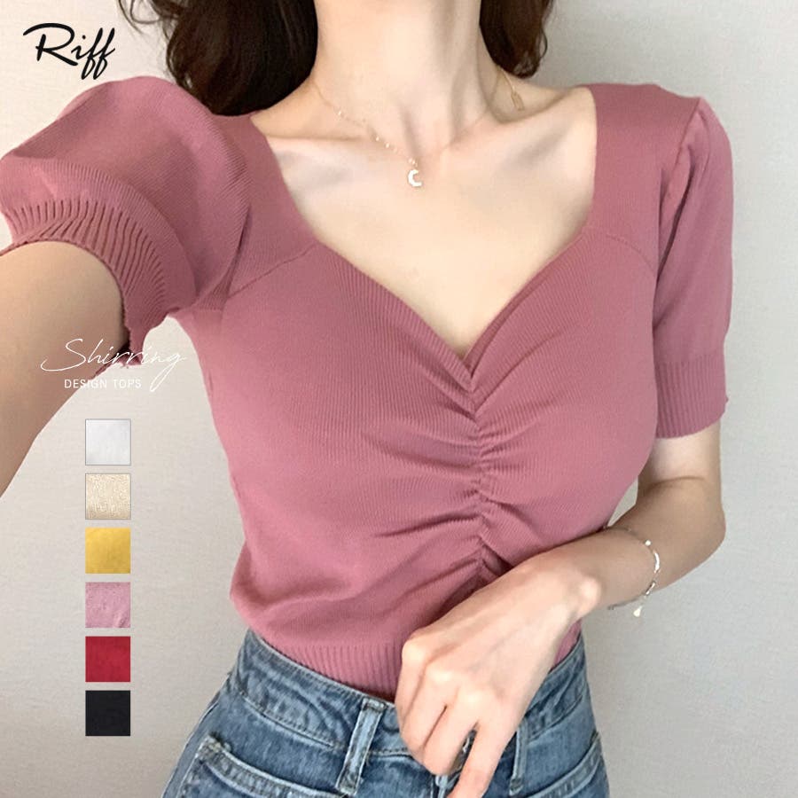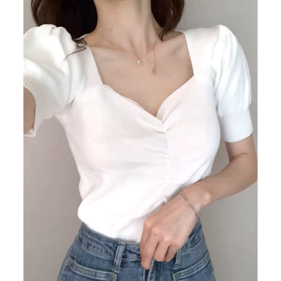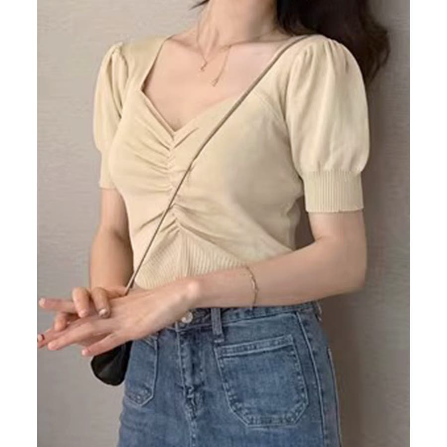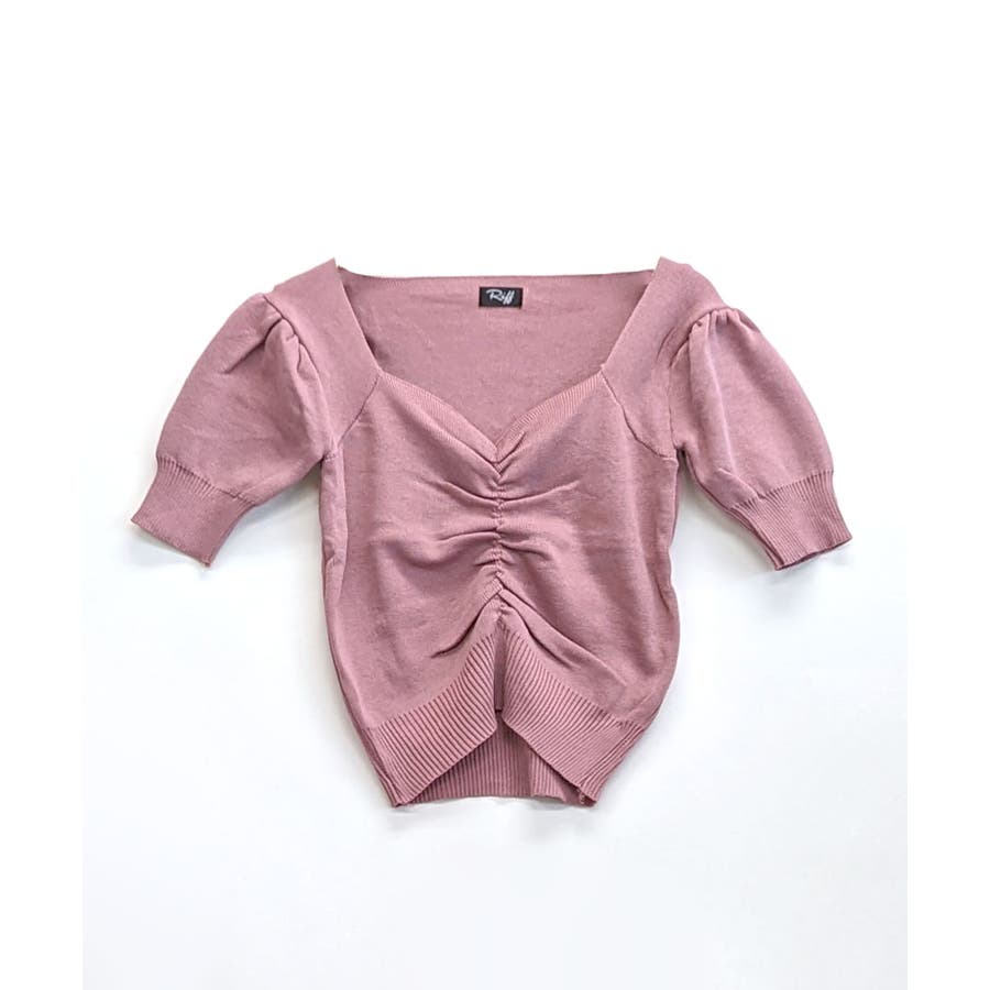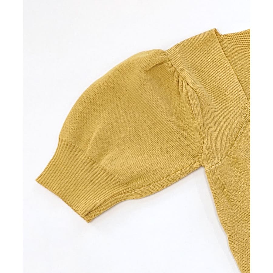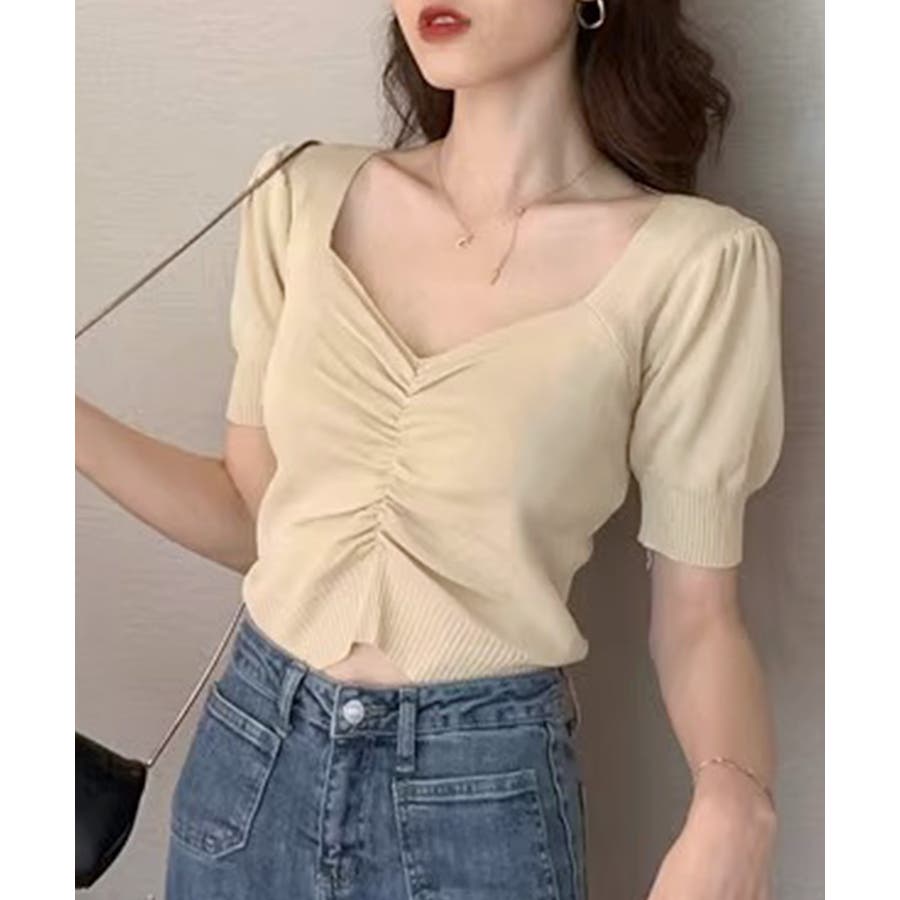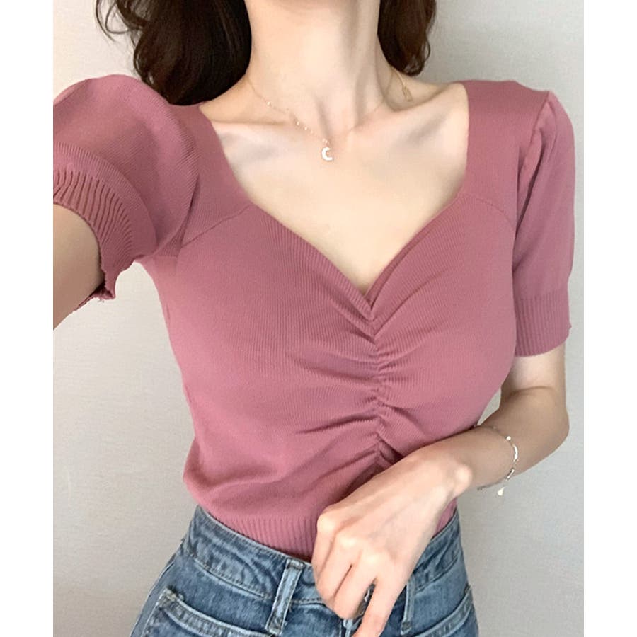 シャーリング半袖サマーニット ハートネック パフスリーブ