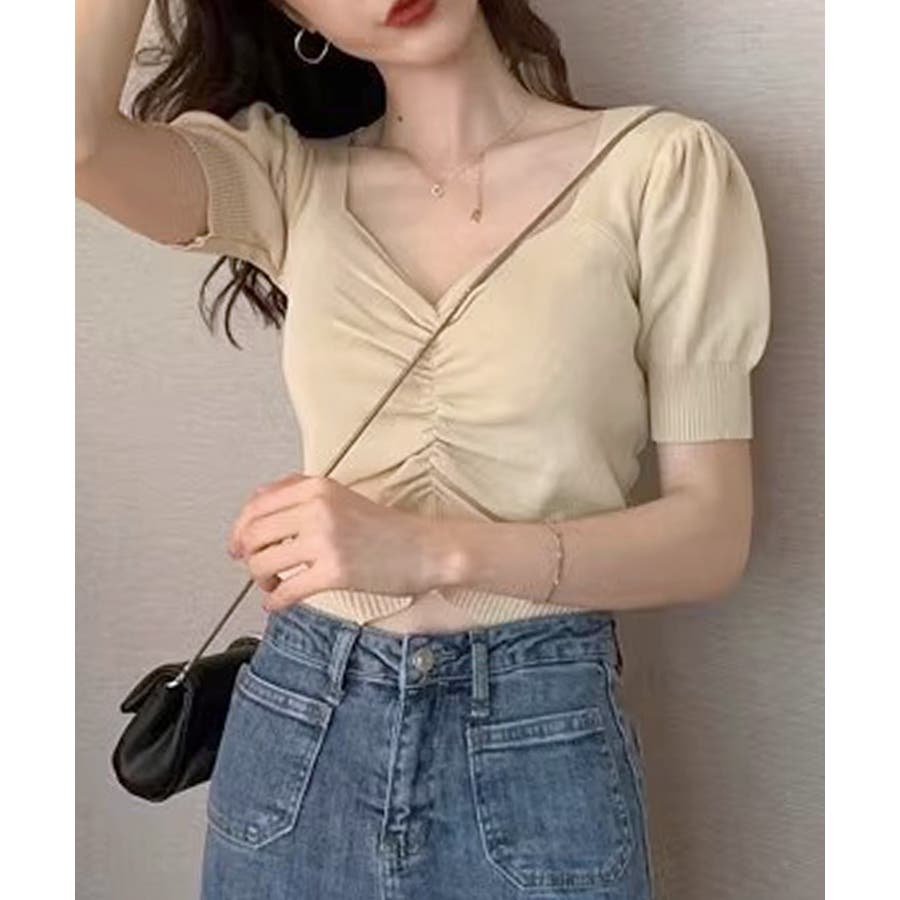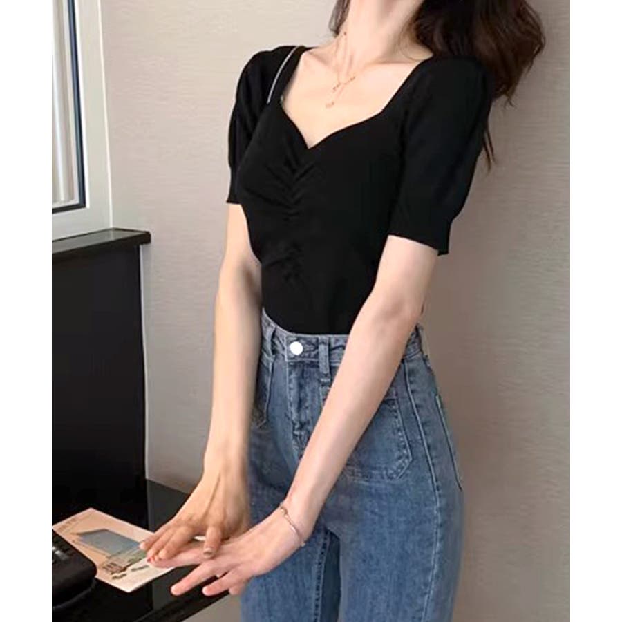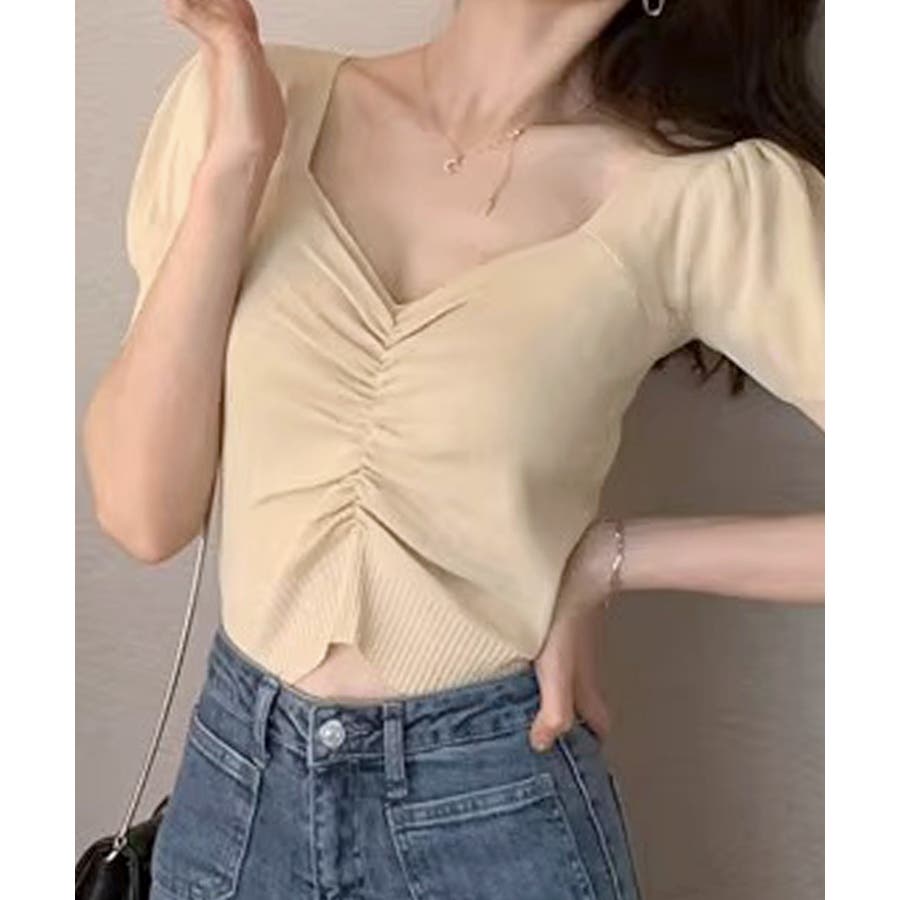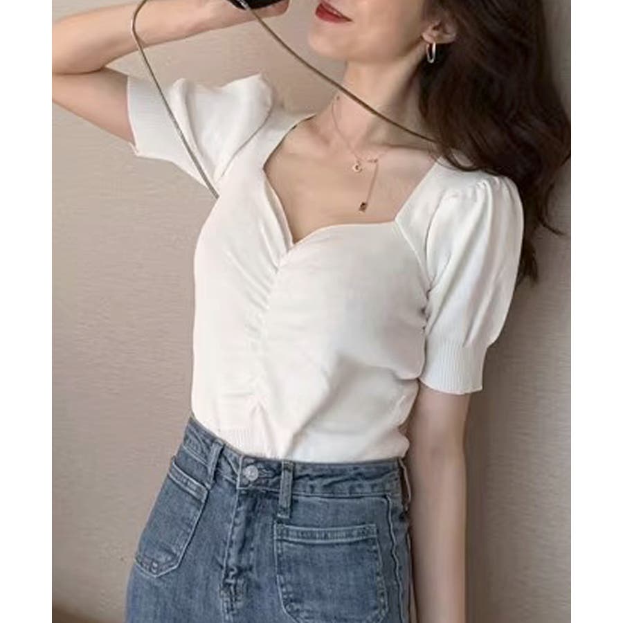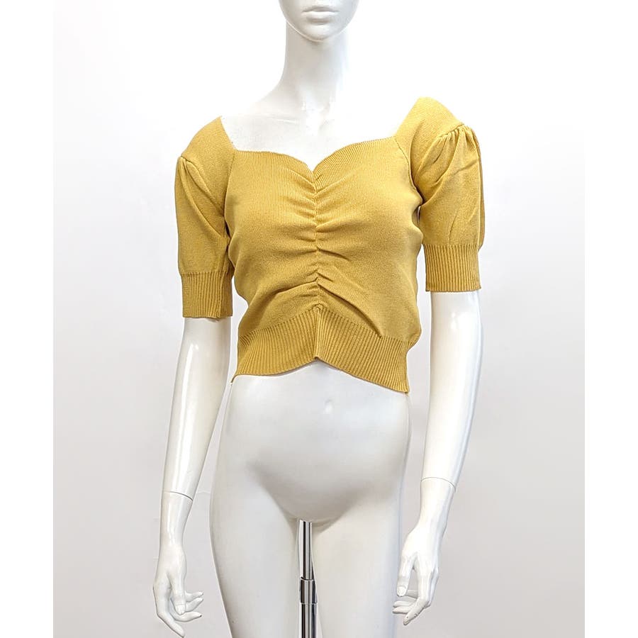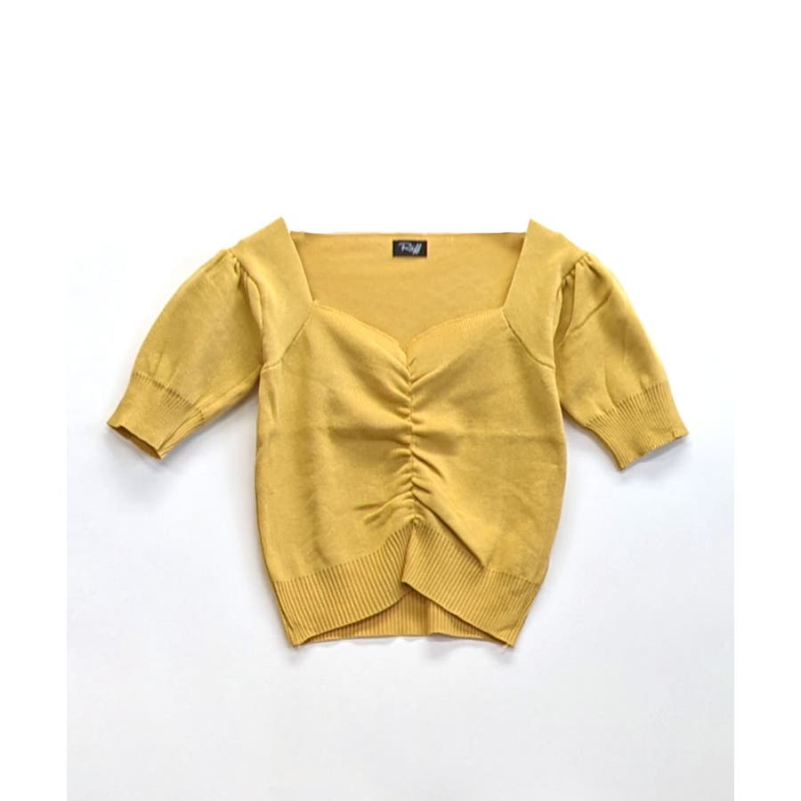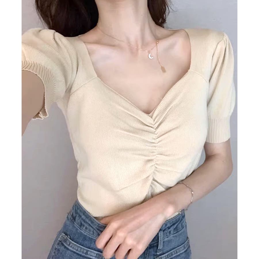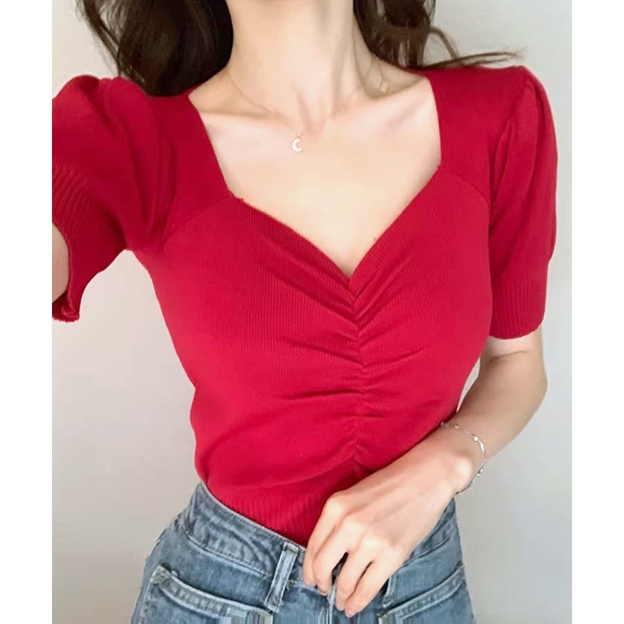 シャーリング半袖サマーニット ハートネック パフスリーブ