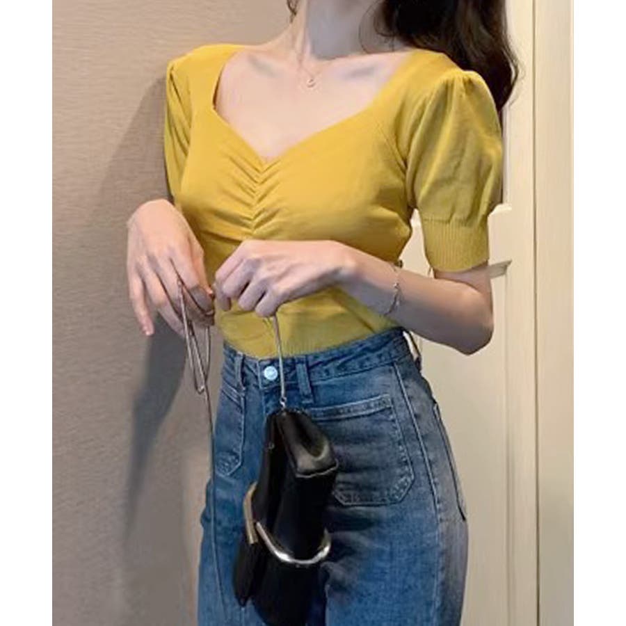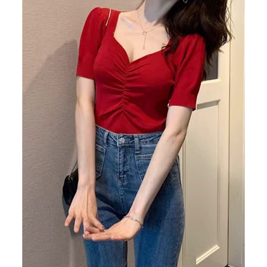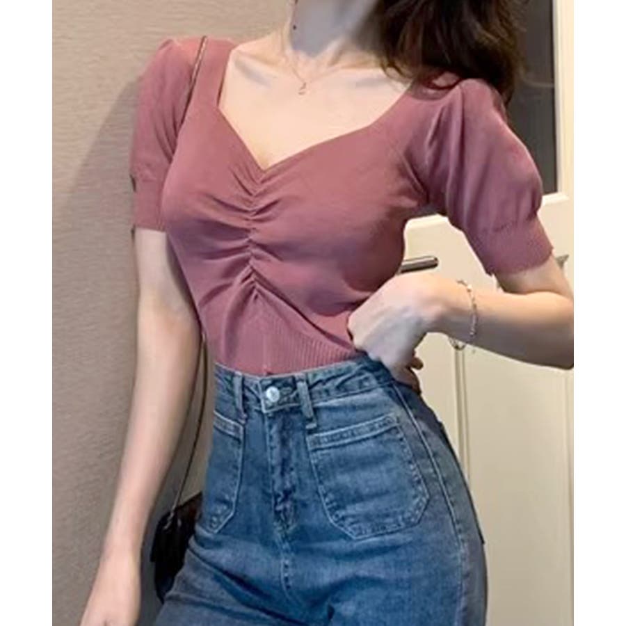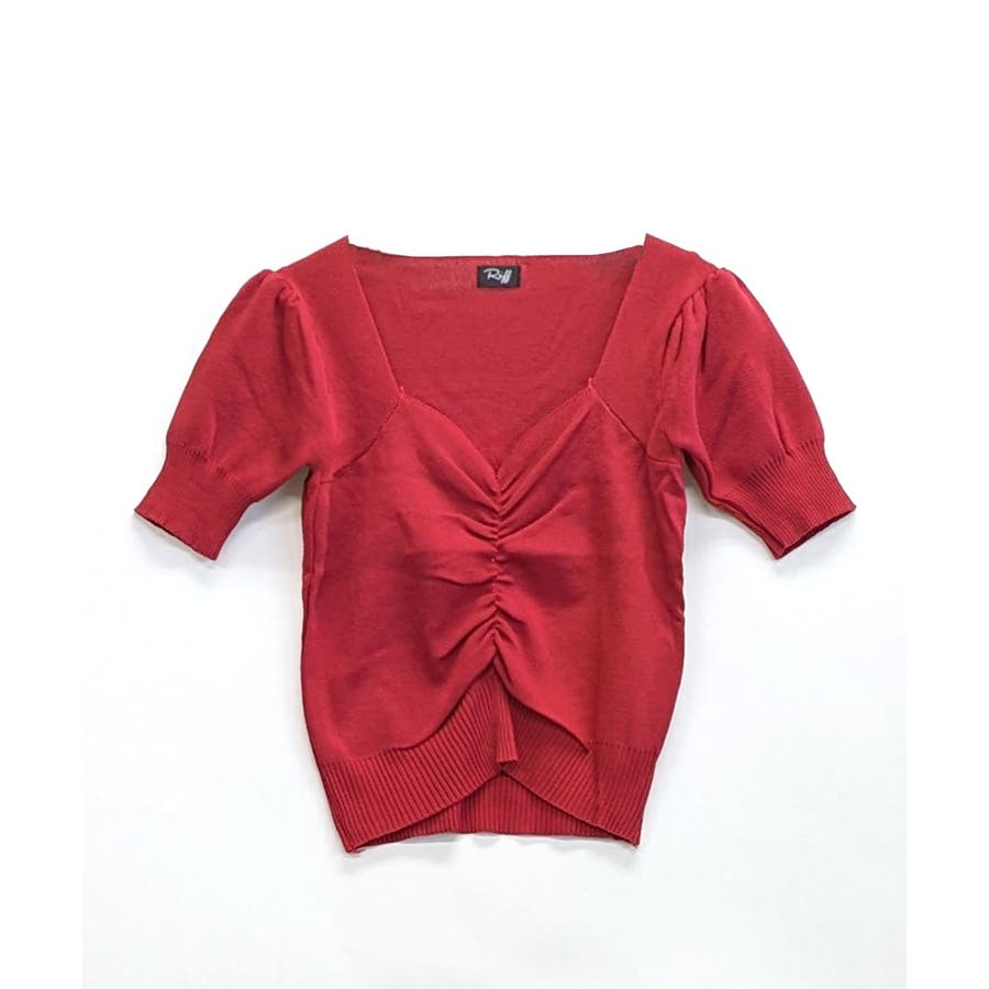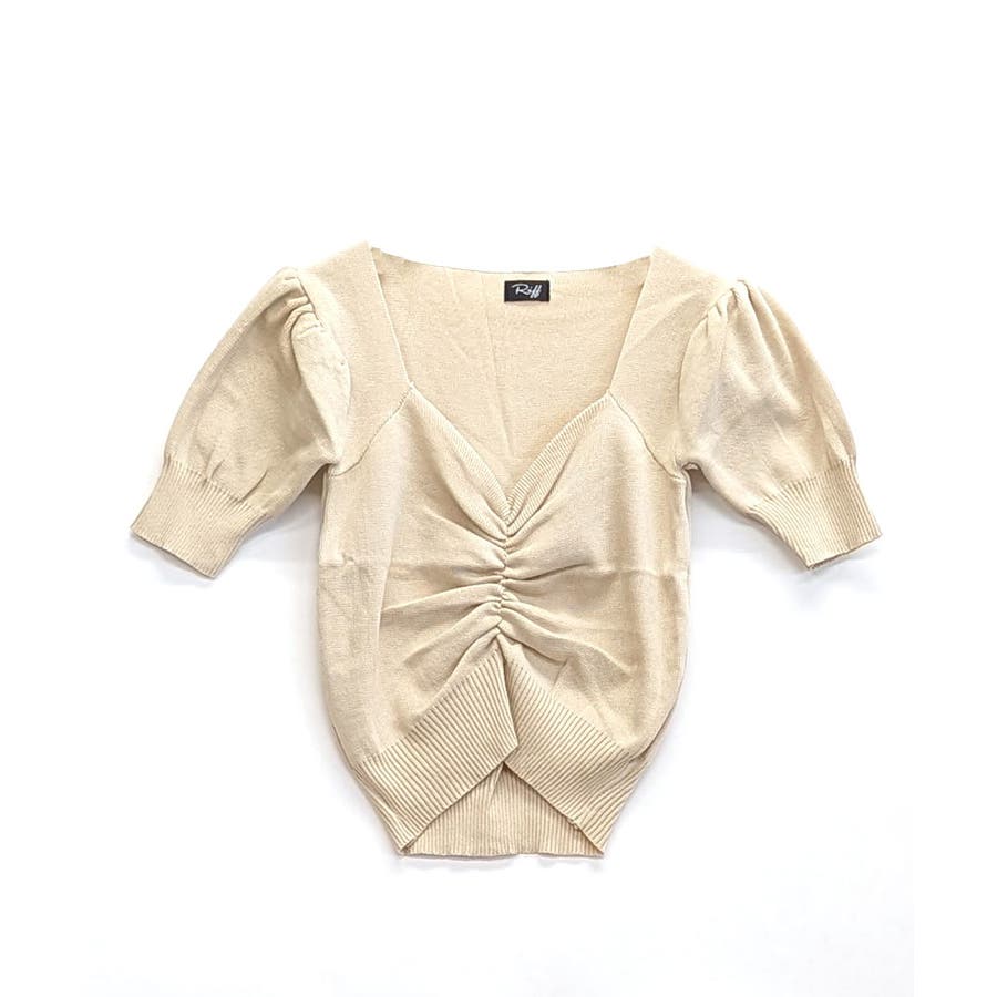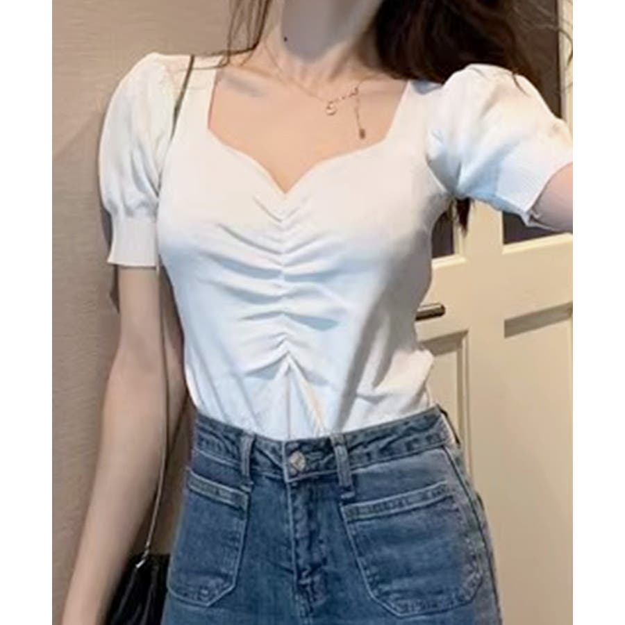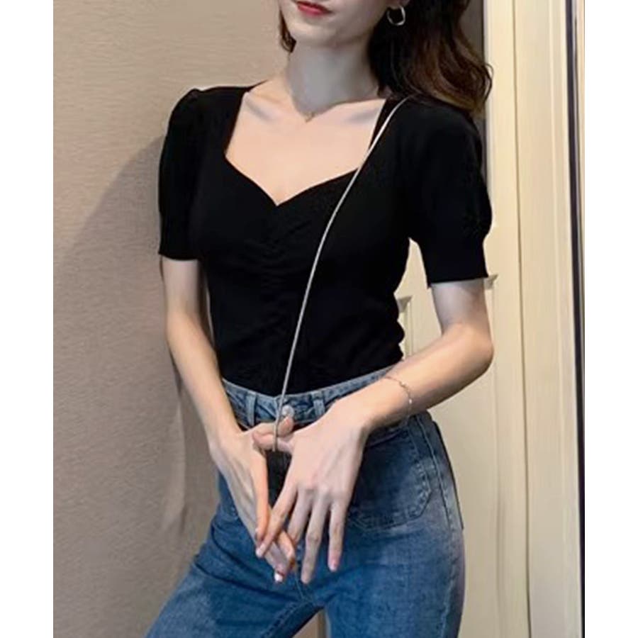シャーリング半袖サマーニット ハートネック パフスリーブ