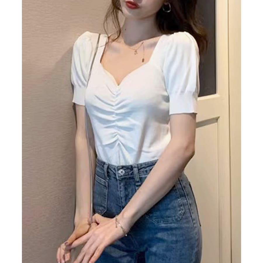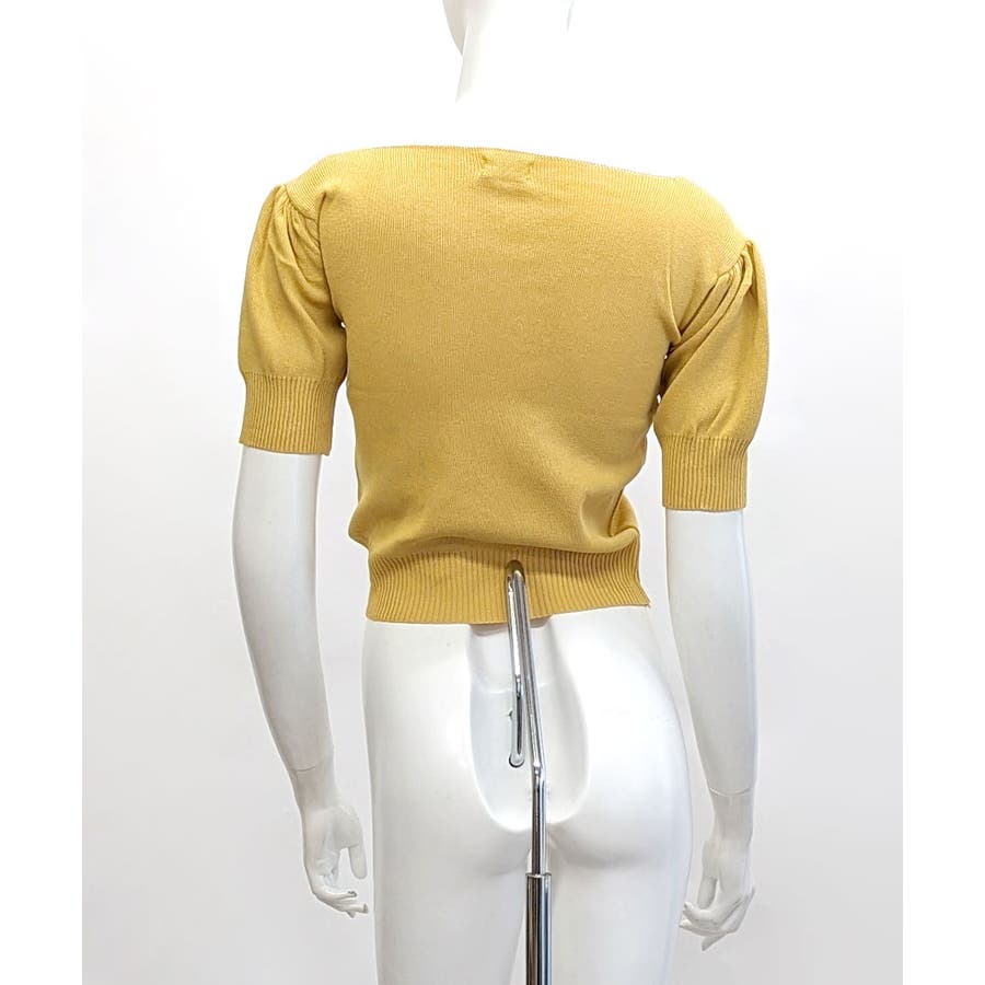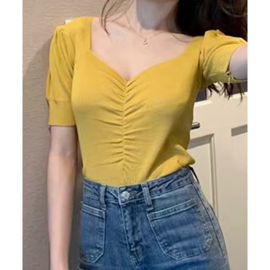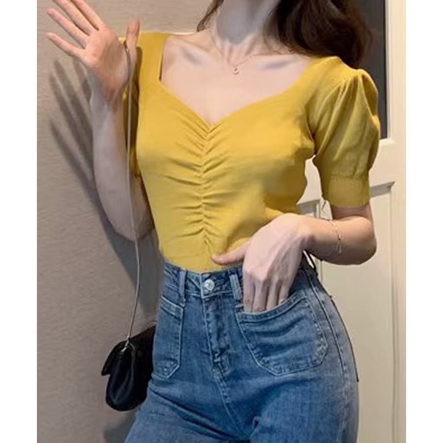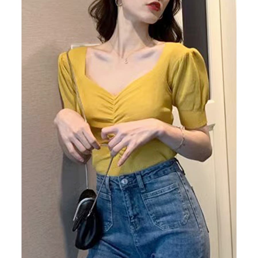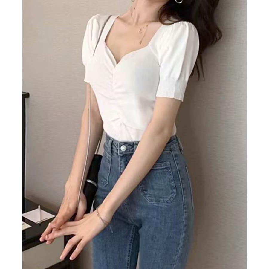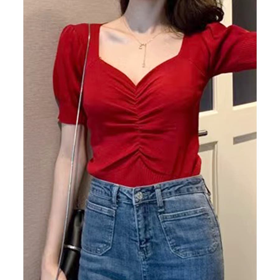 シャーリング半袖サマーニット ハートネック パフスリーブ