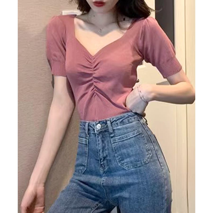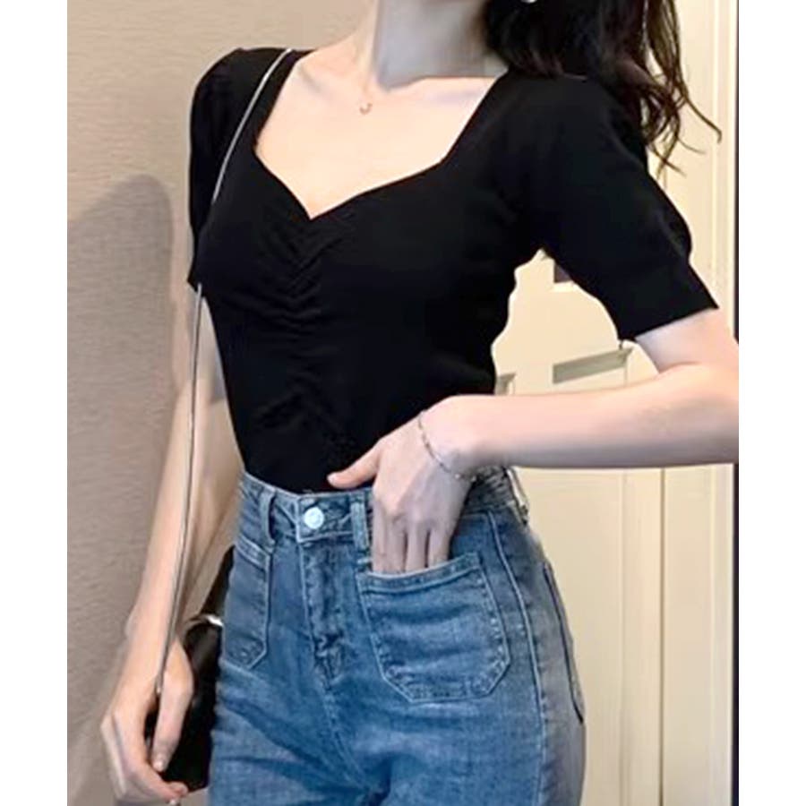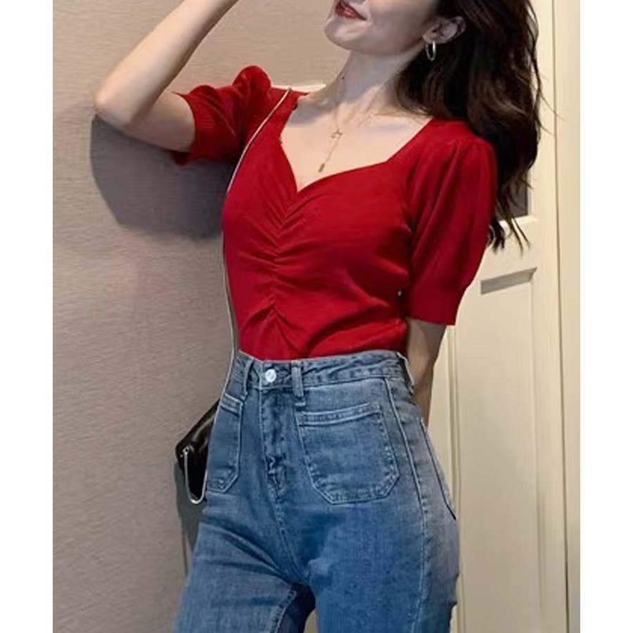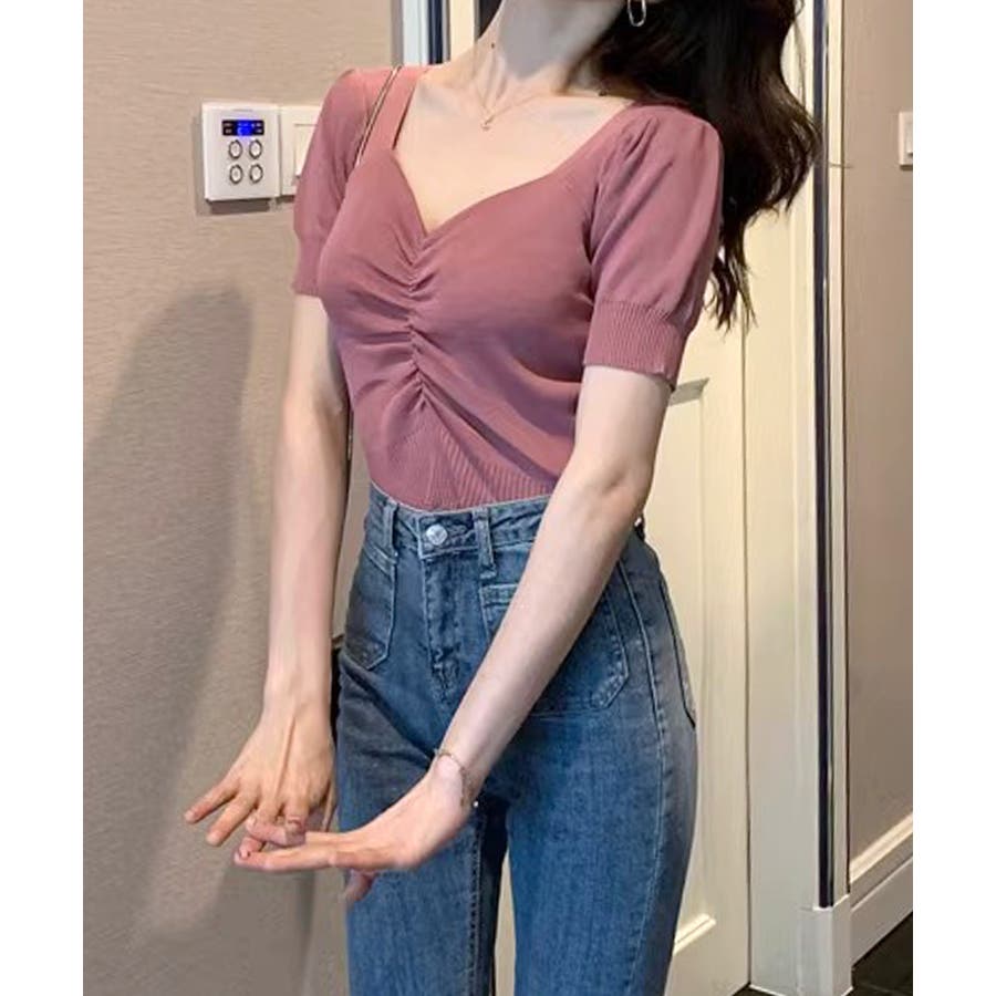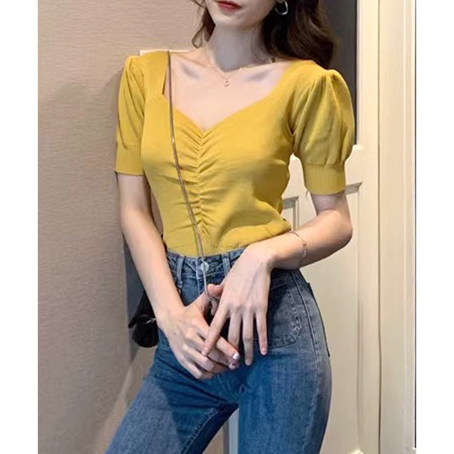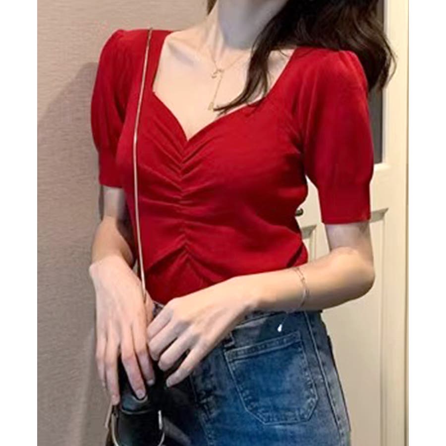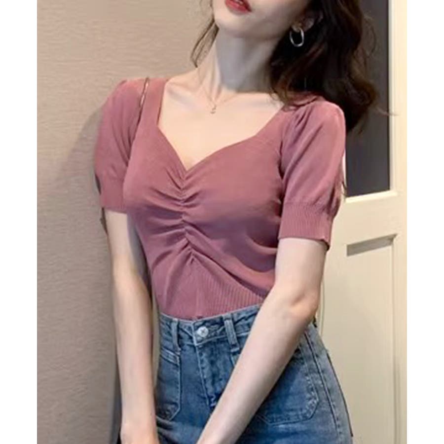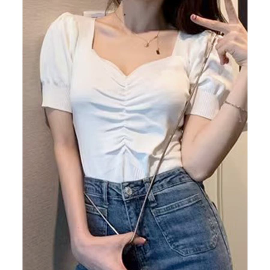 シャーリング半袖サマーニット ハートネック パフスリーブ