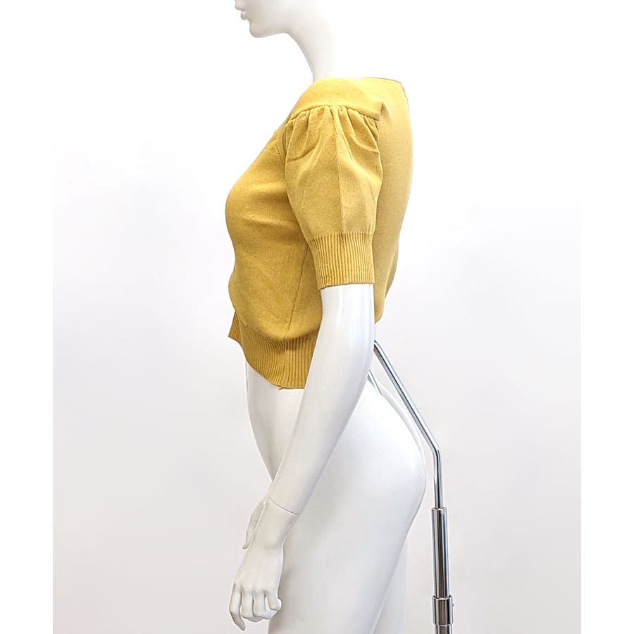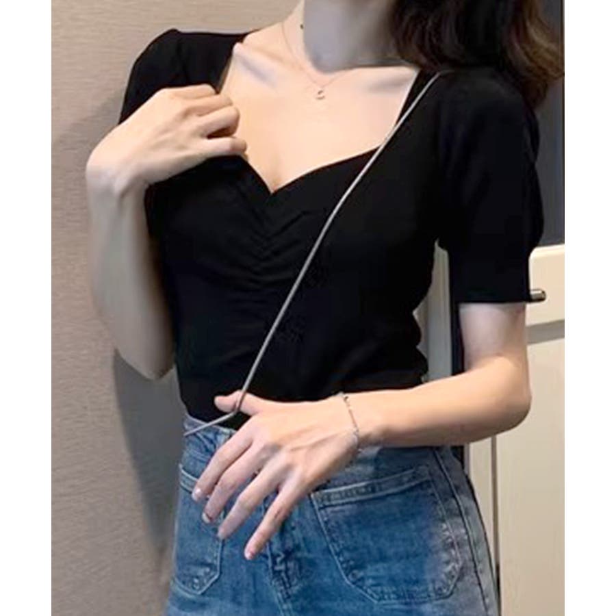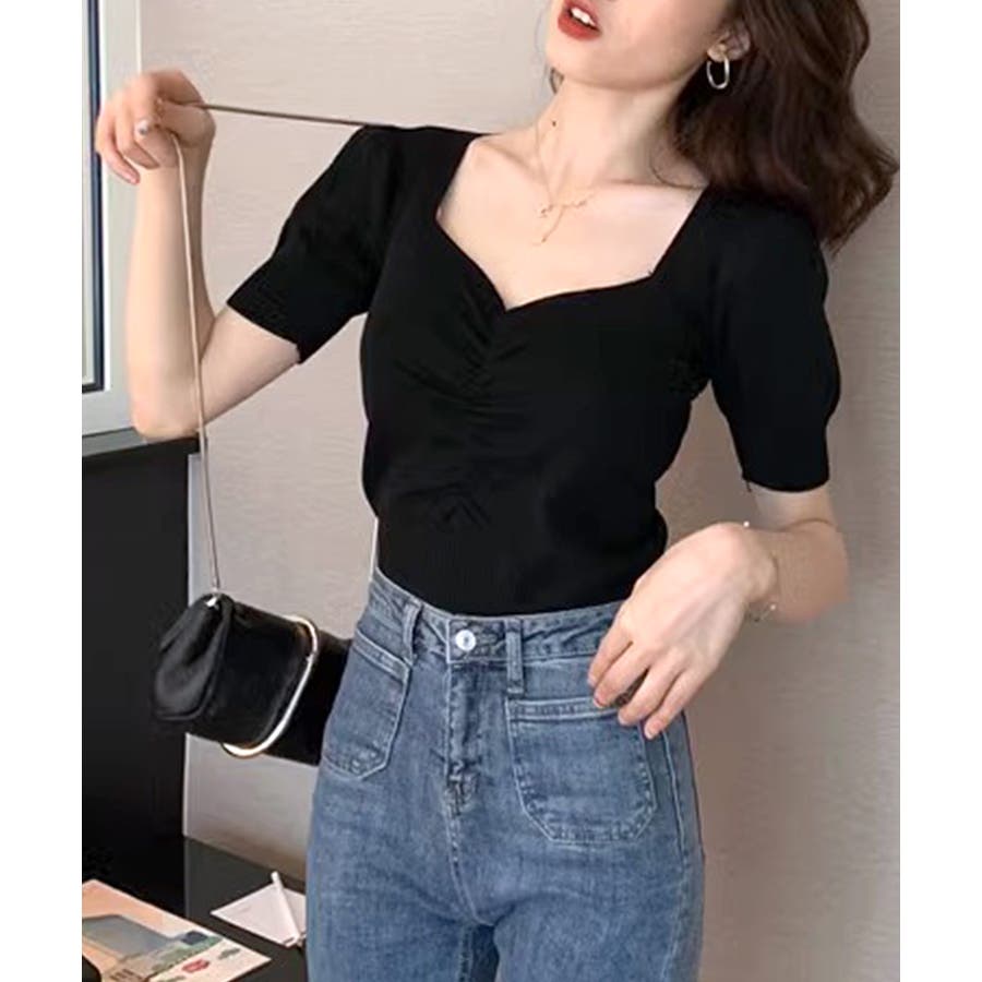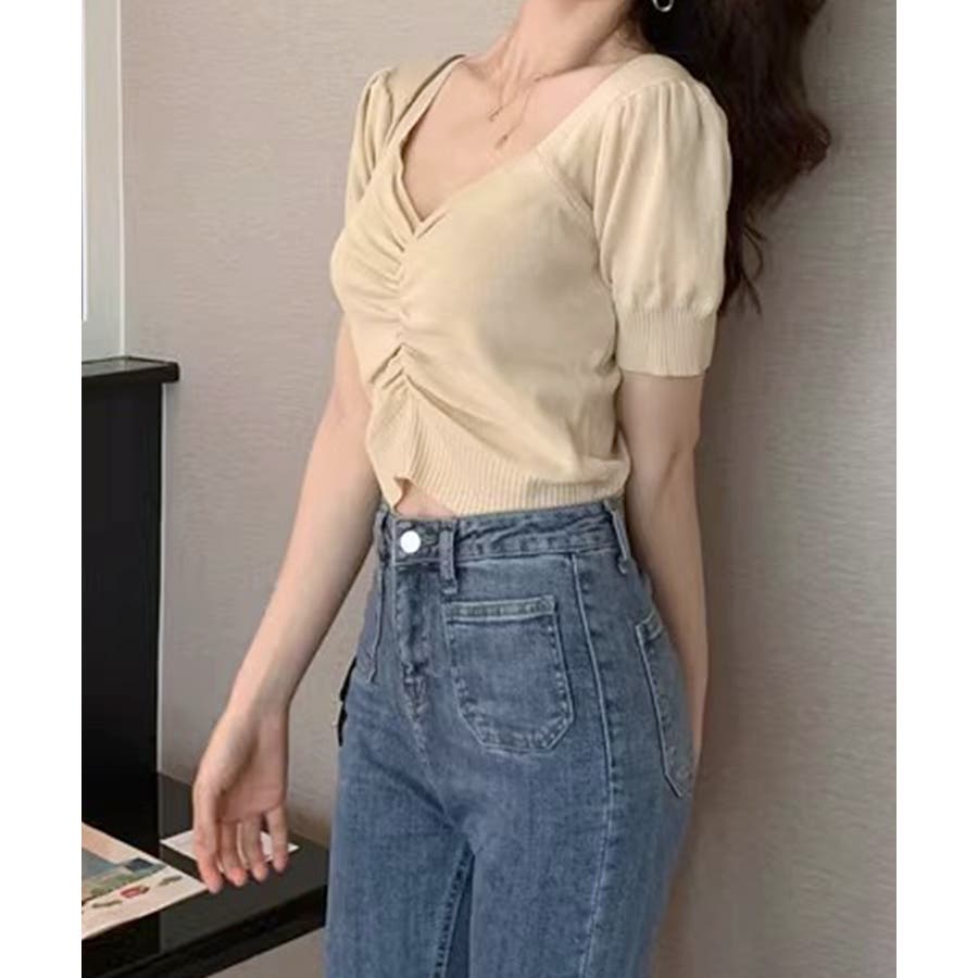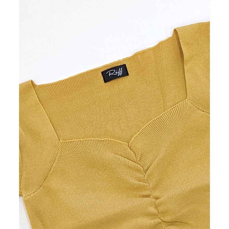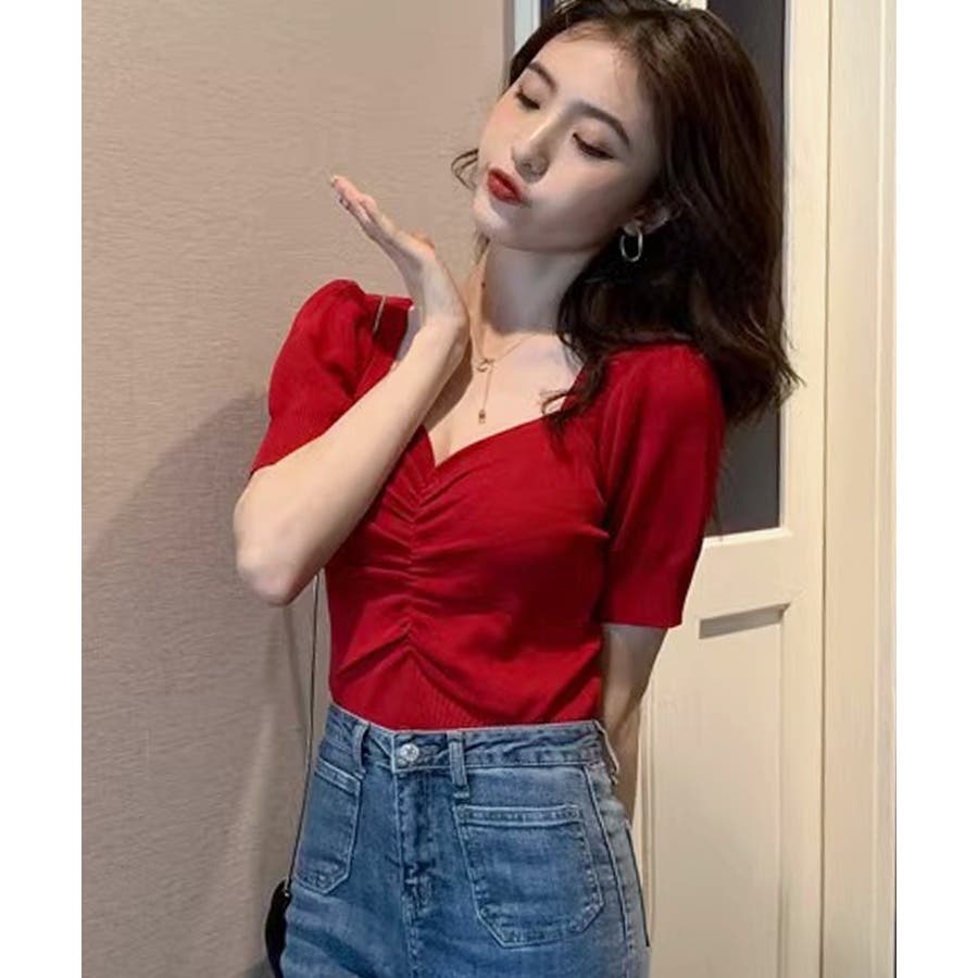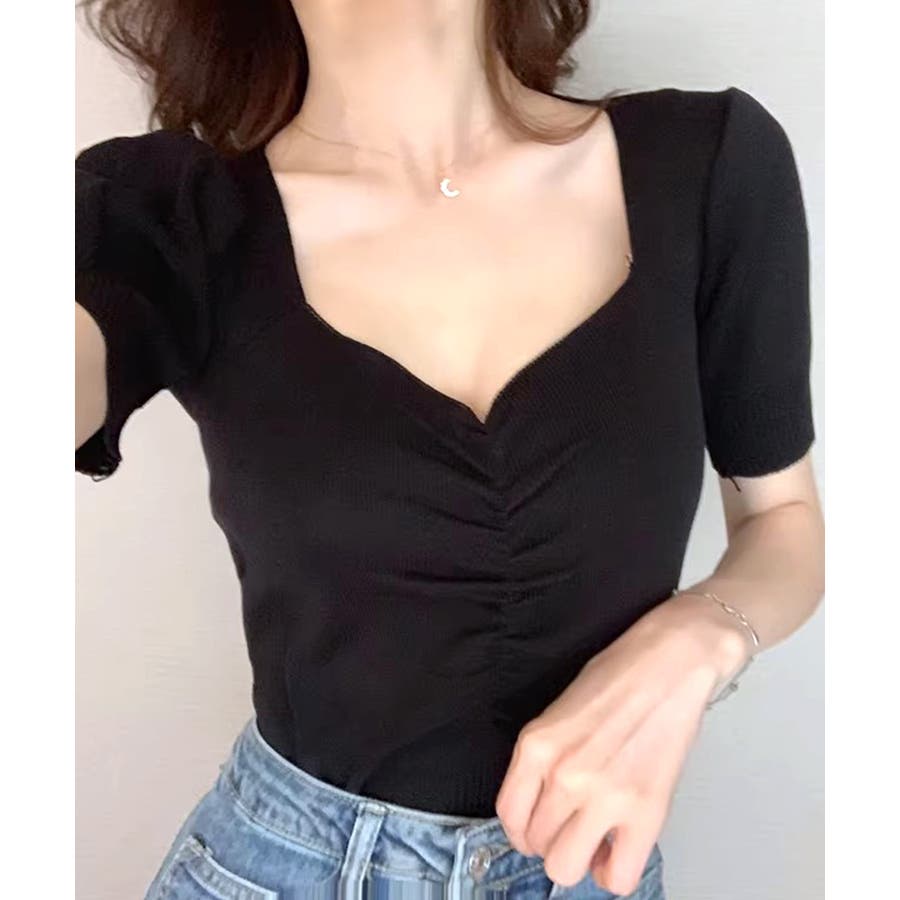 シャーリング半袖サマーニット ハートネック パフスリーブ