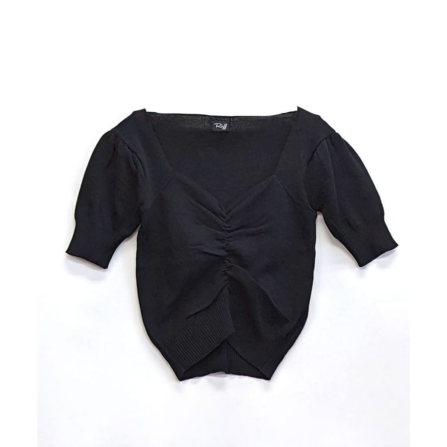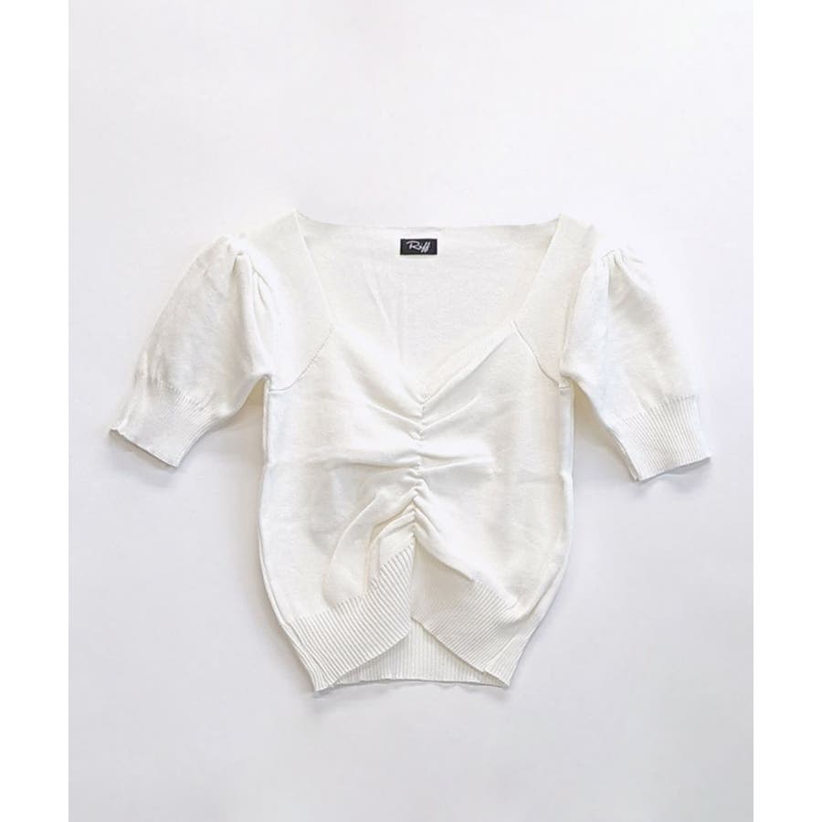 フロントにギャザーを施した、フェミニンなサマーニット。