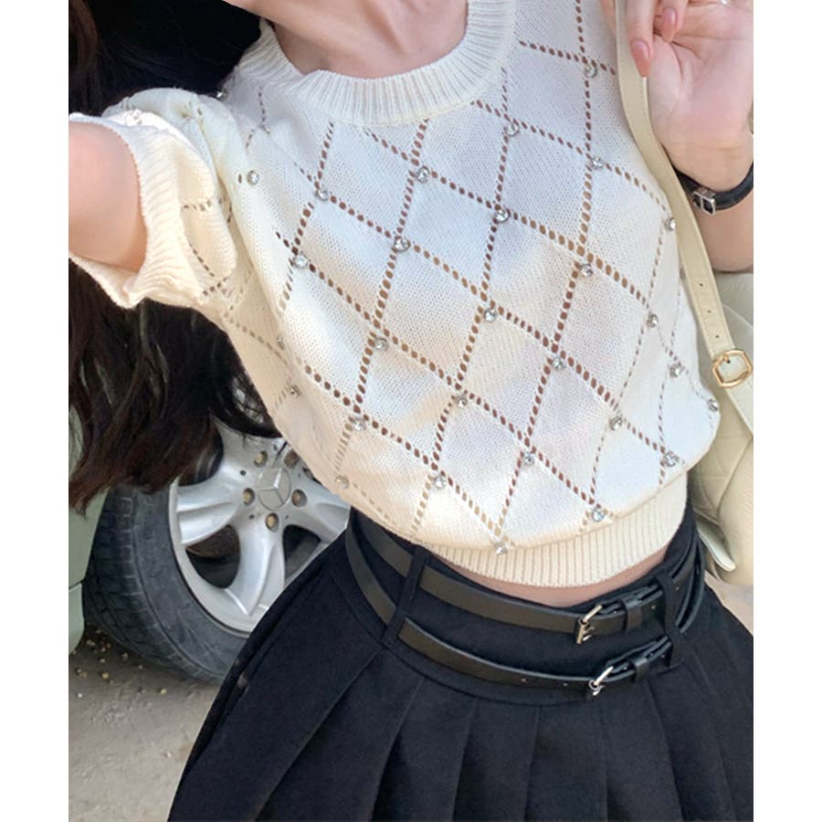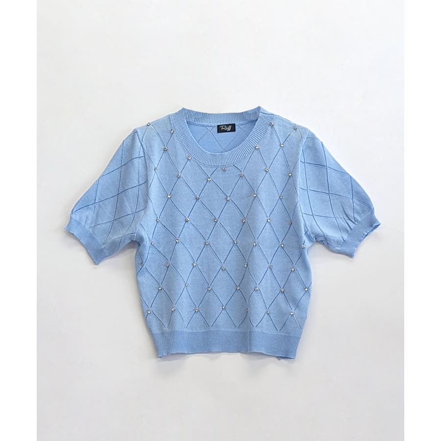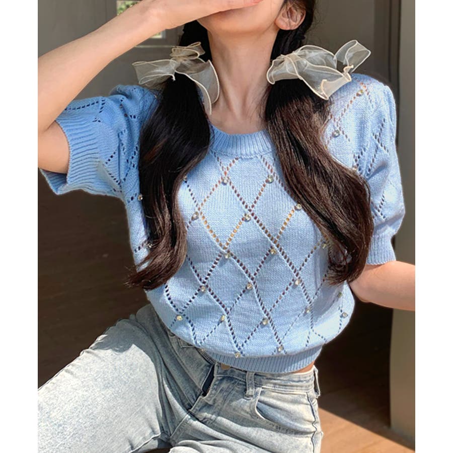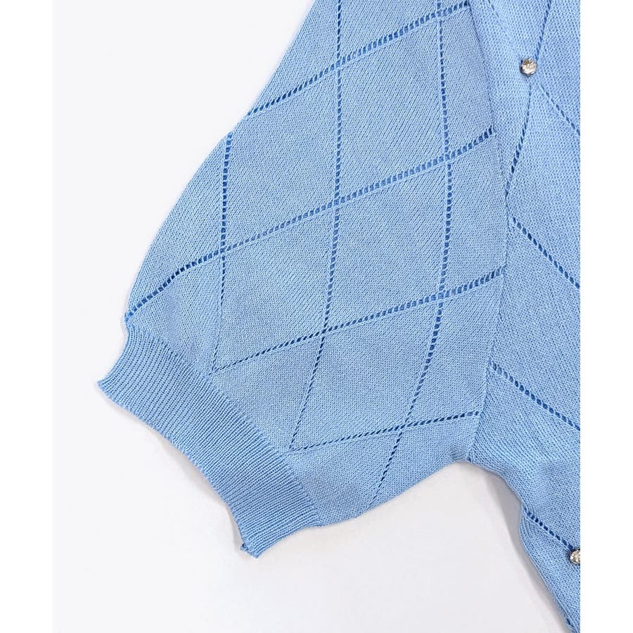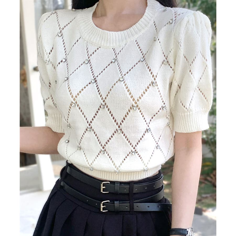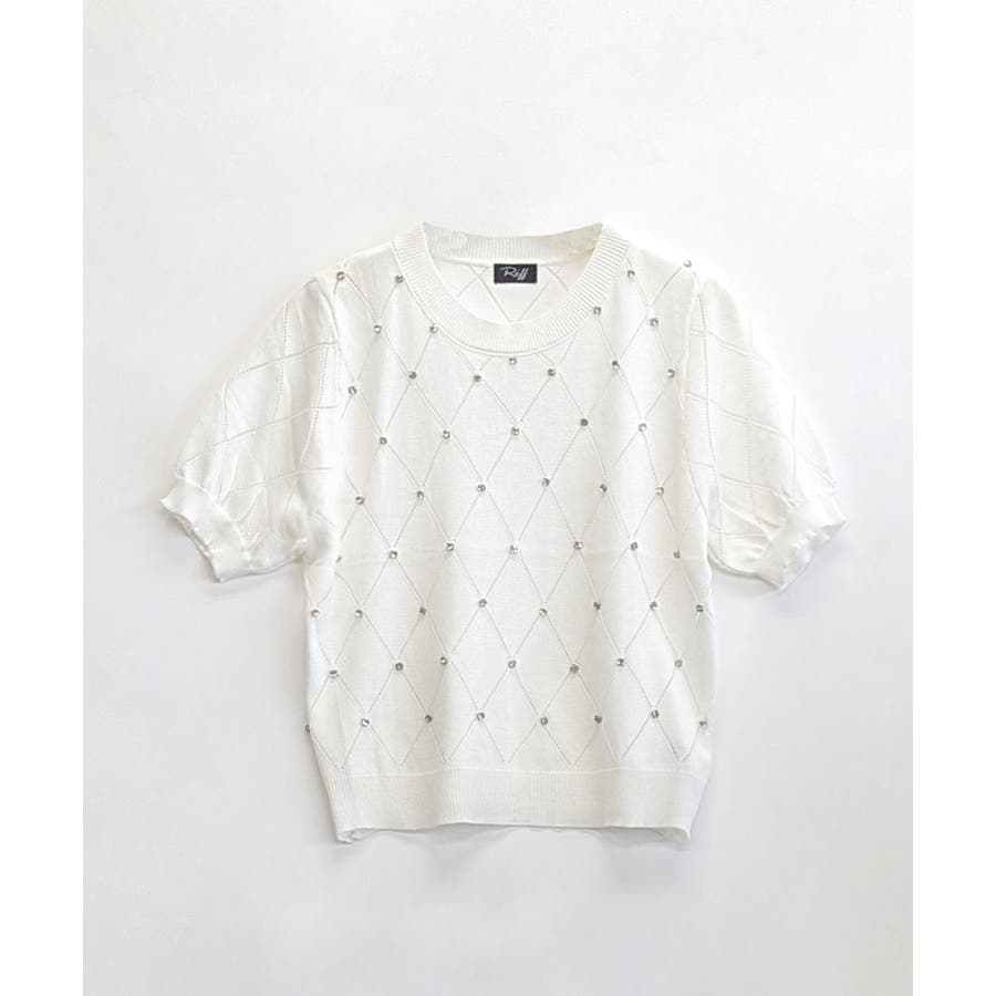 ダイヤ柄ビジュートップス 半袖ニット サマーニット
