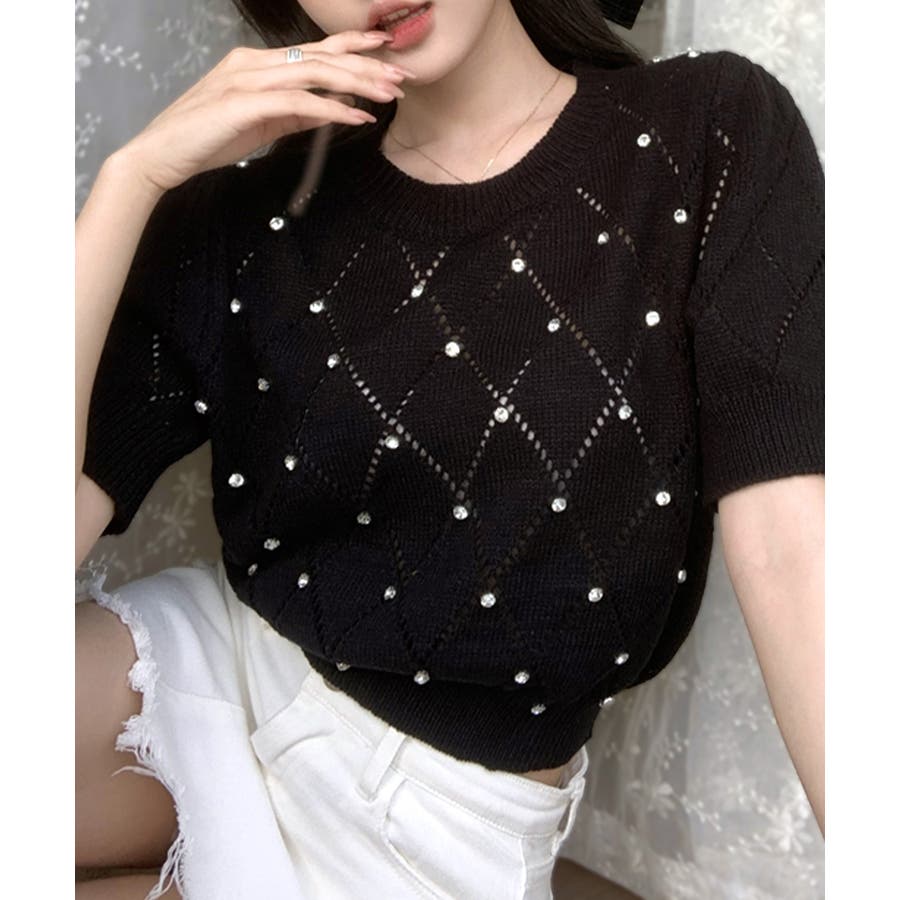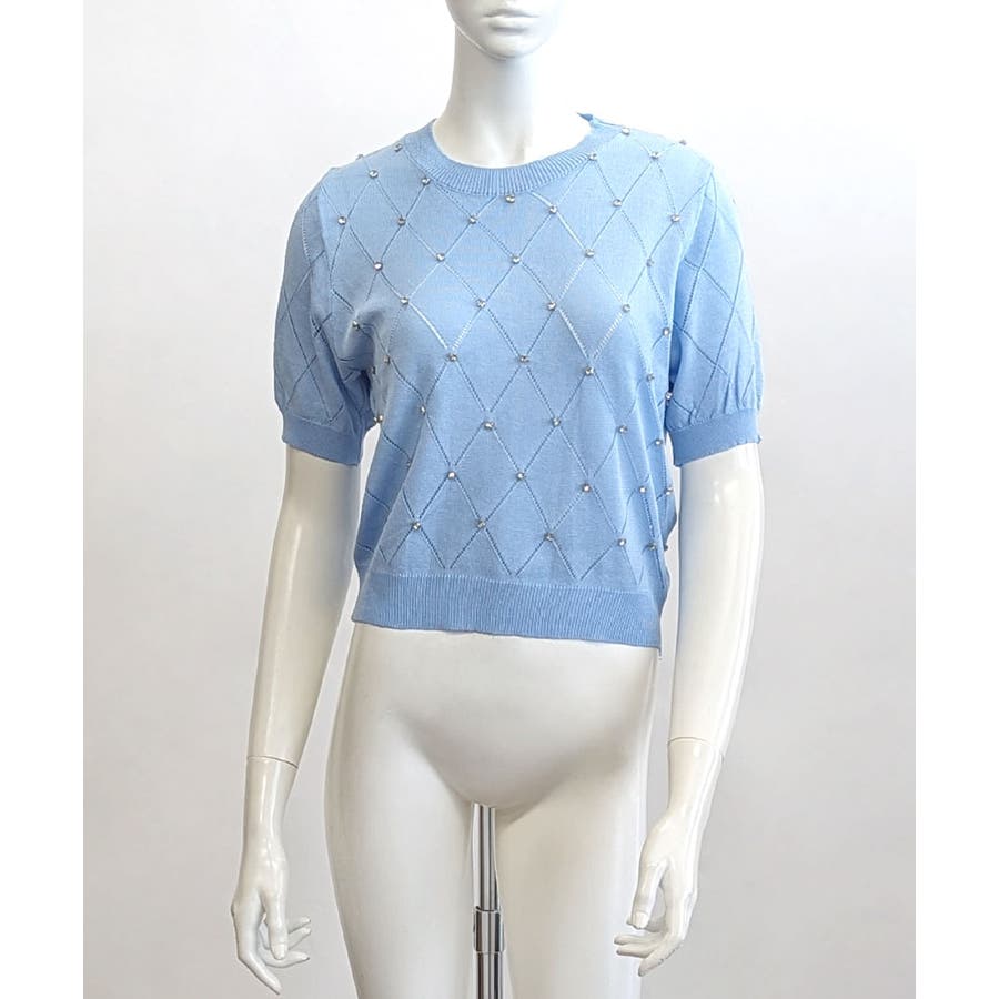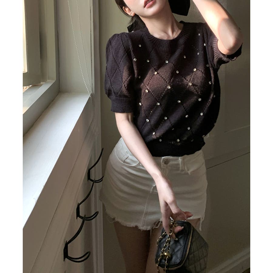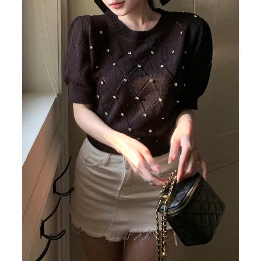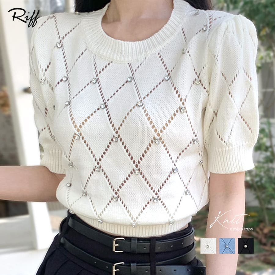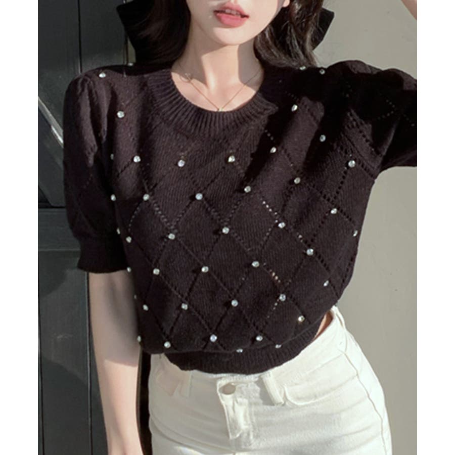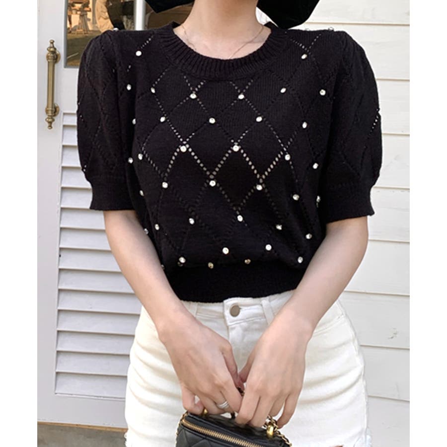 ダイヤ柄ビジュートップス 半袖ニット サマーニット
