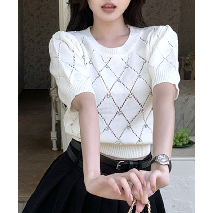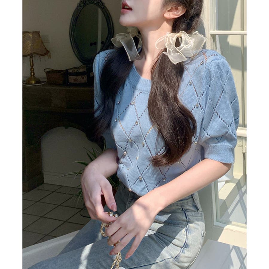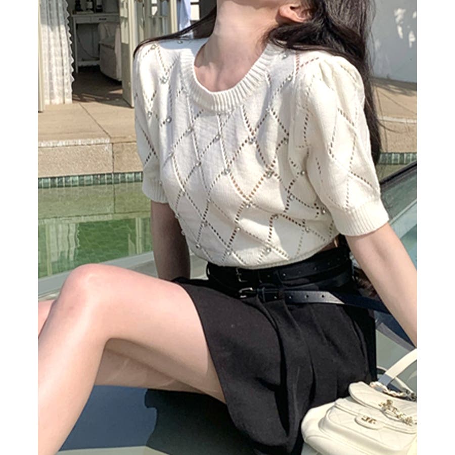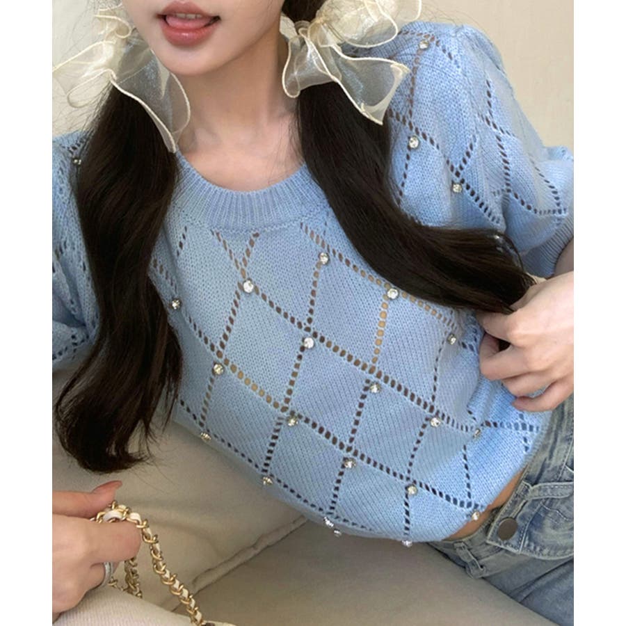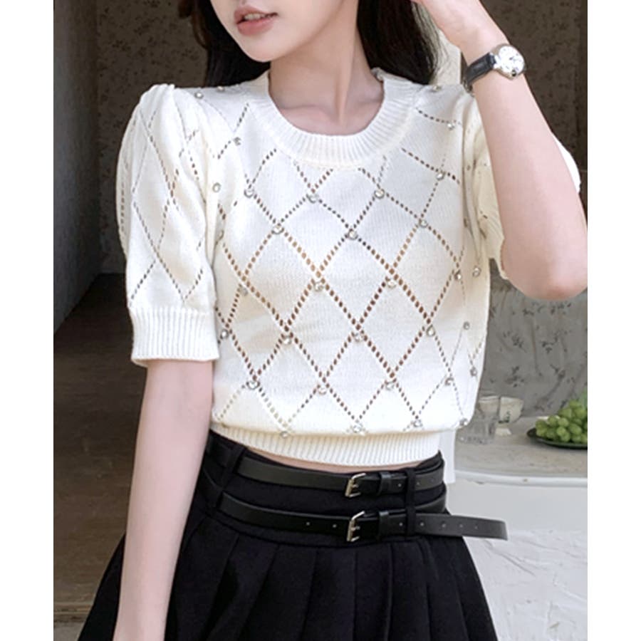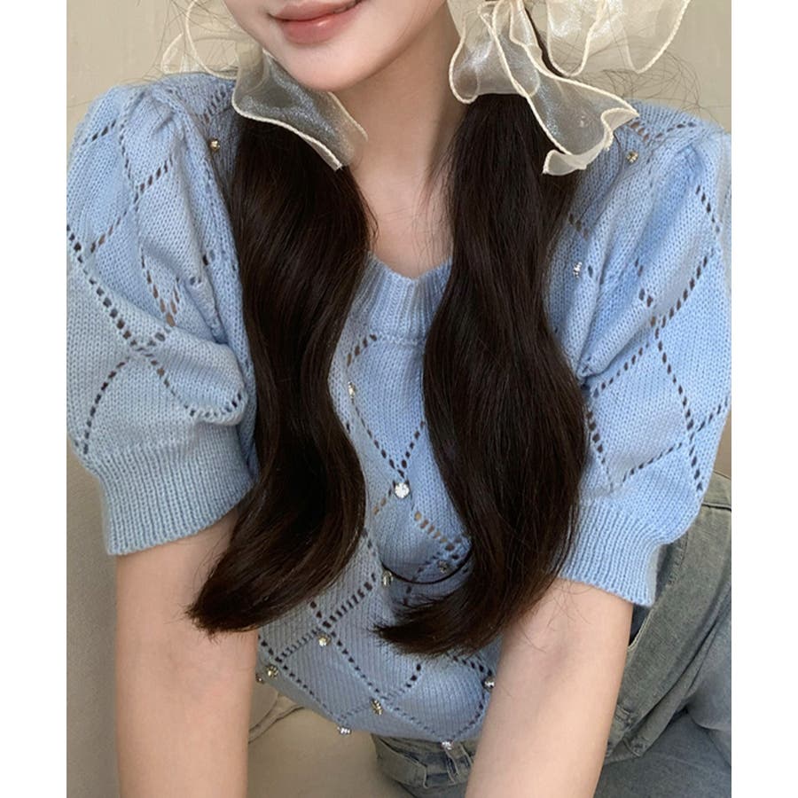 ダイヤ柄ビジュートップス 半袖ニット サマーニット