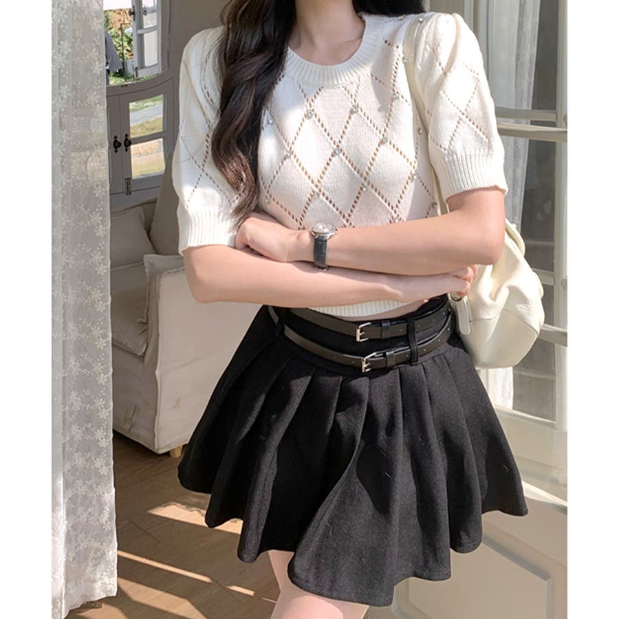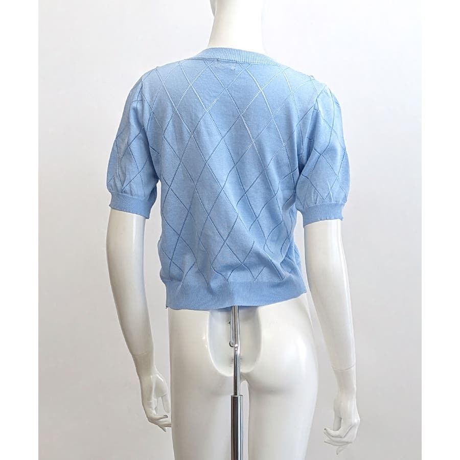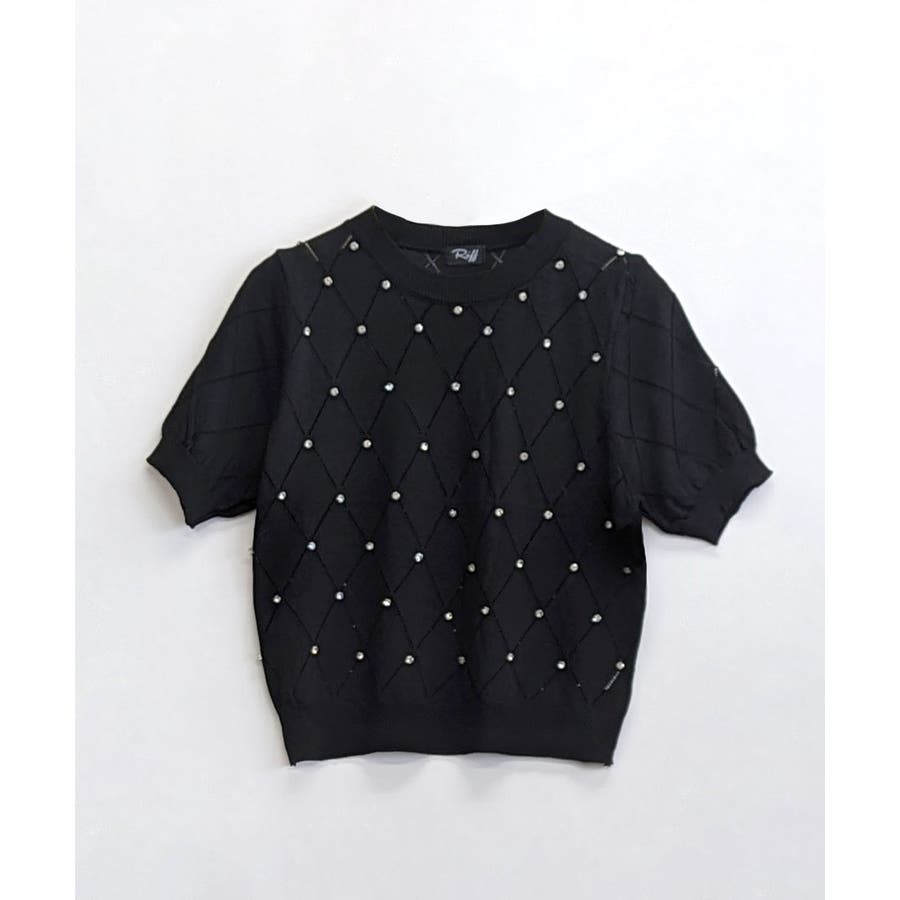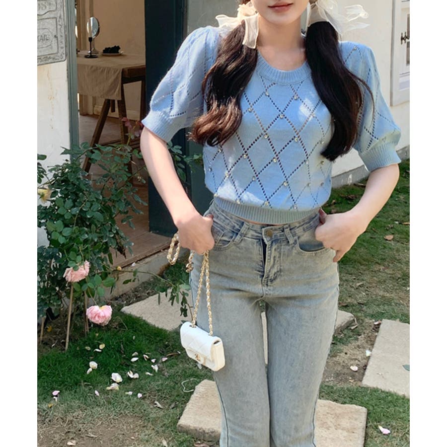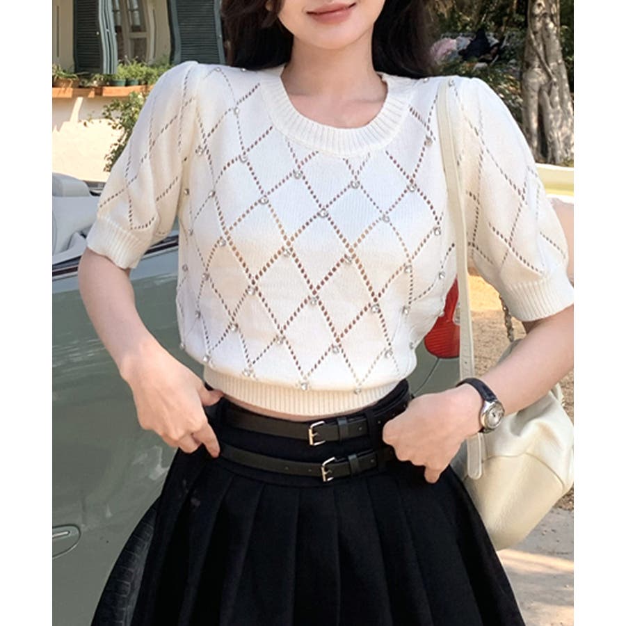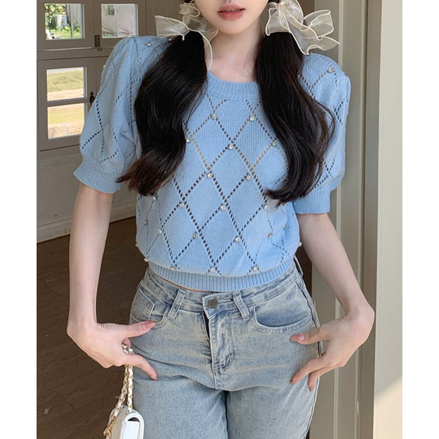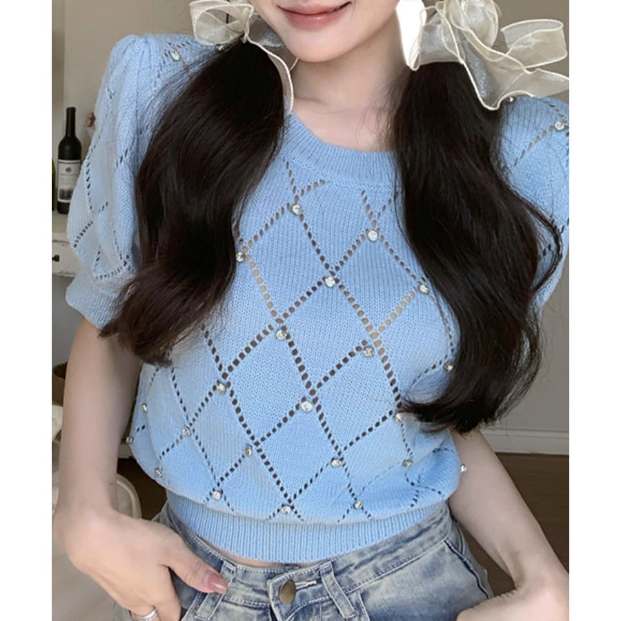 ダイヤ柄ビジュートップス 半袖ニット サマーニット