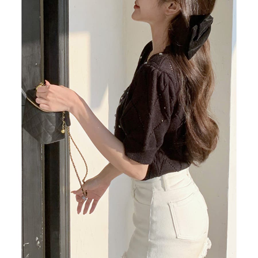・ダイヤ柄の編地にビジューが際立ち、華やかさを演出してくれる1枚。