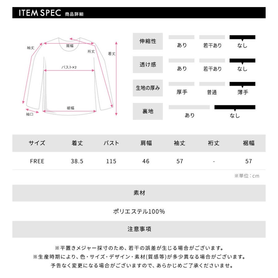 着丈:38.5cm / バスト:115cm / 肩幅:46cm / 袖丈:57cm / 裾幅:57cm