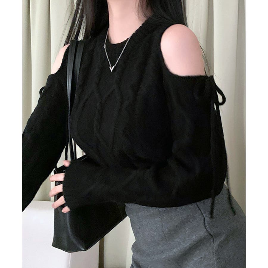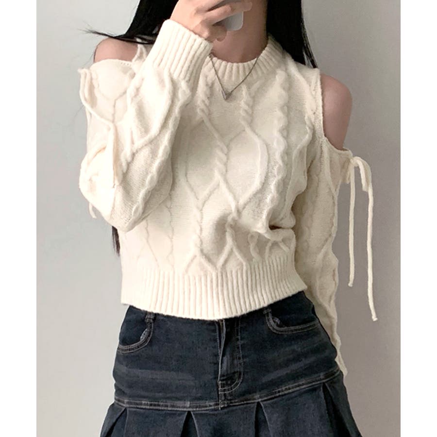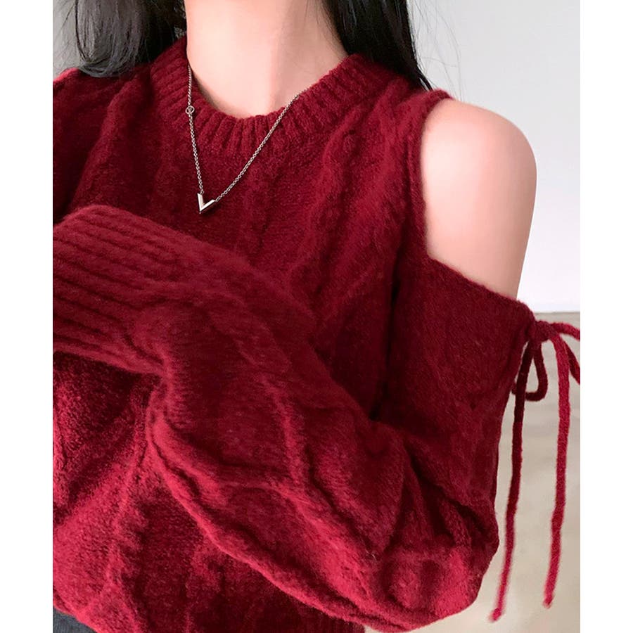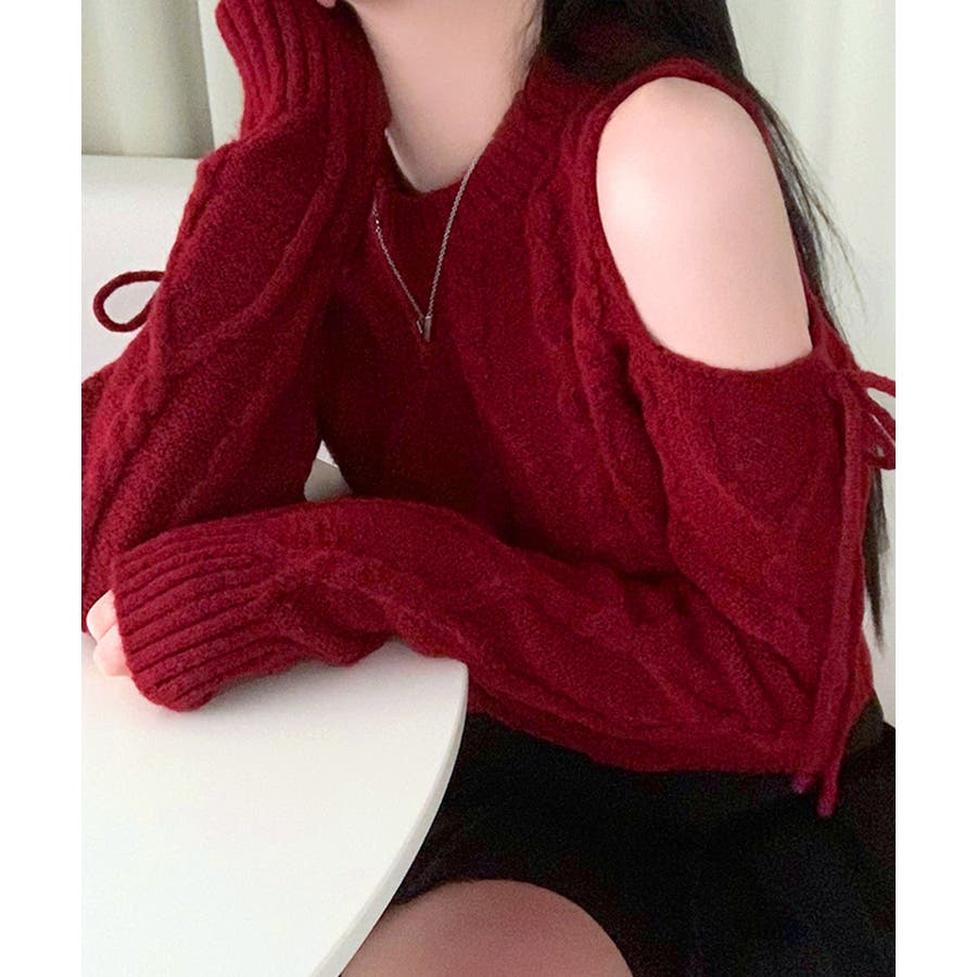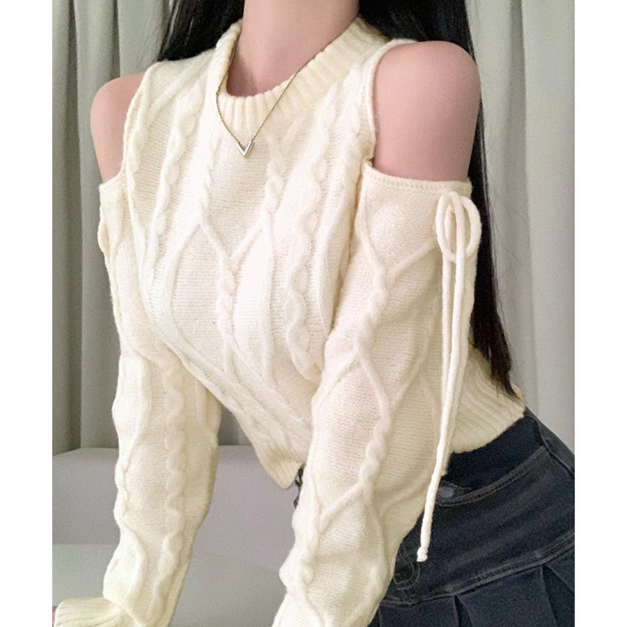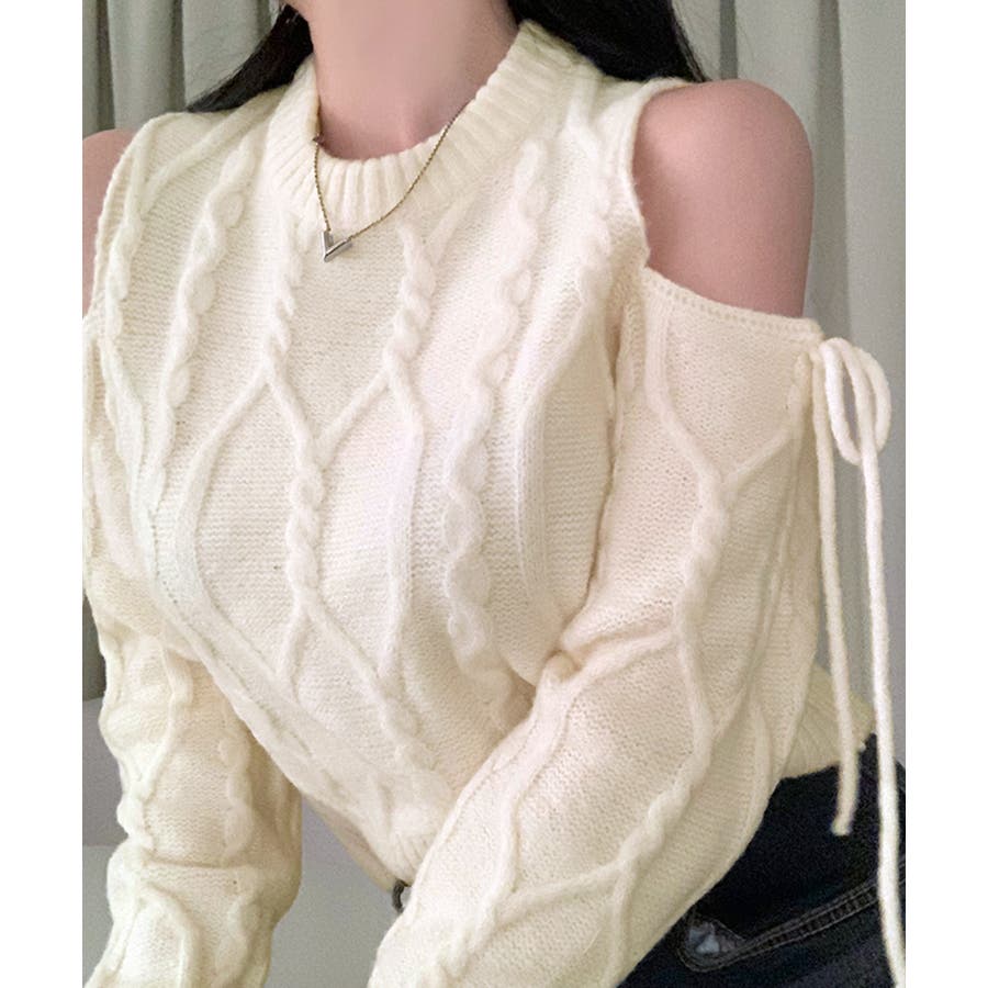 オープンショルダーリボンケーブルニット