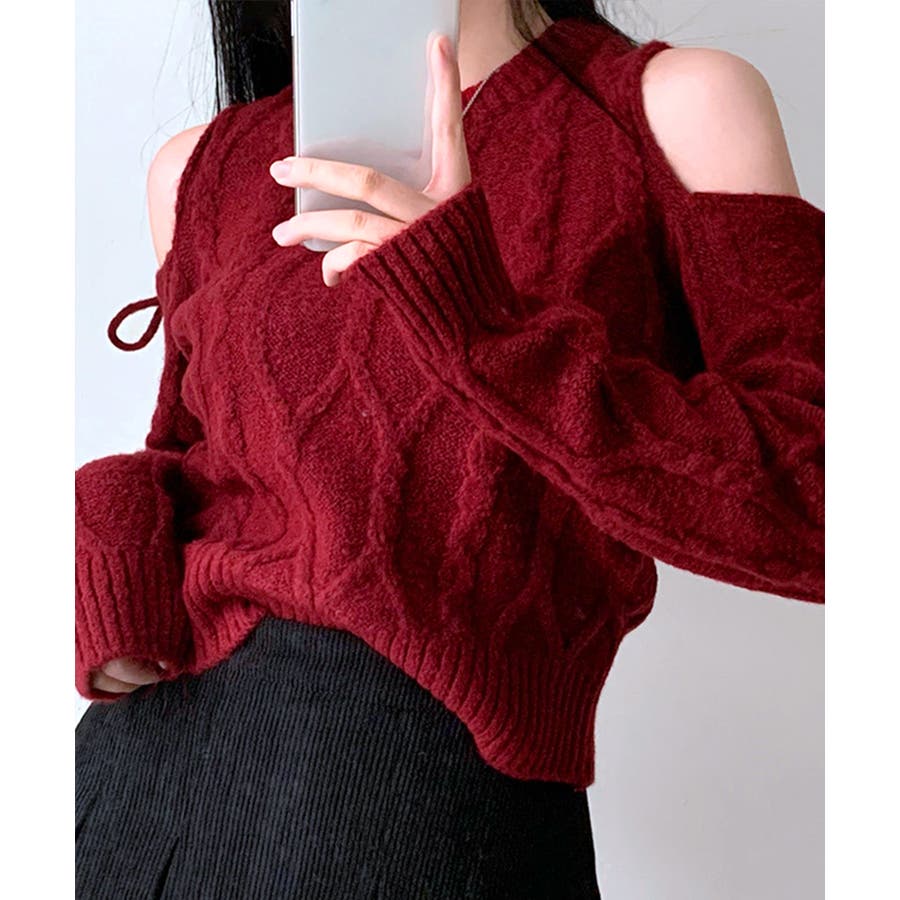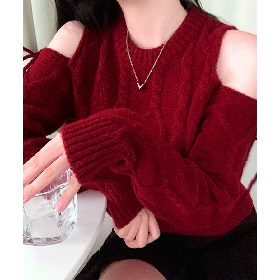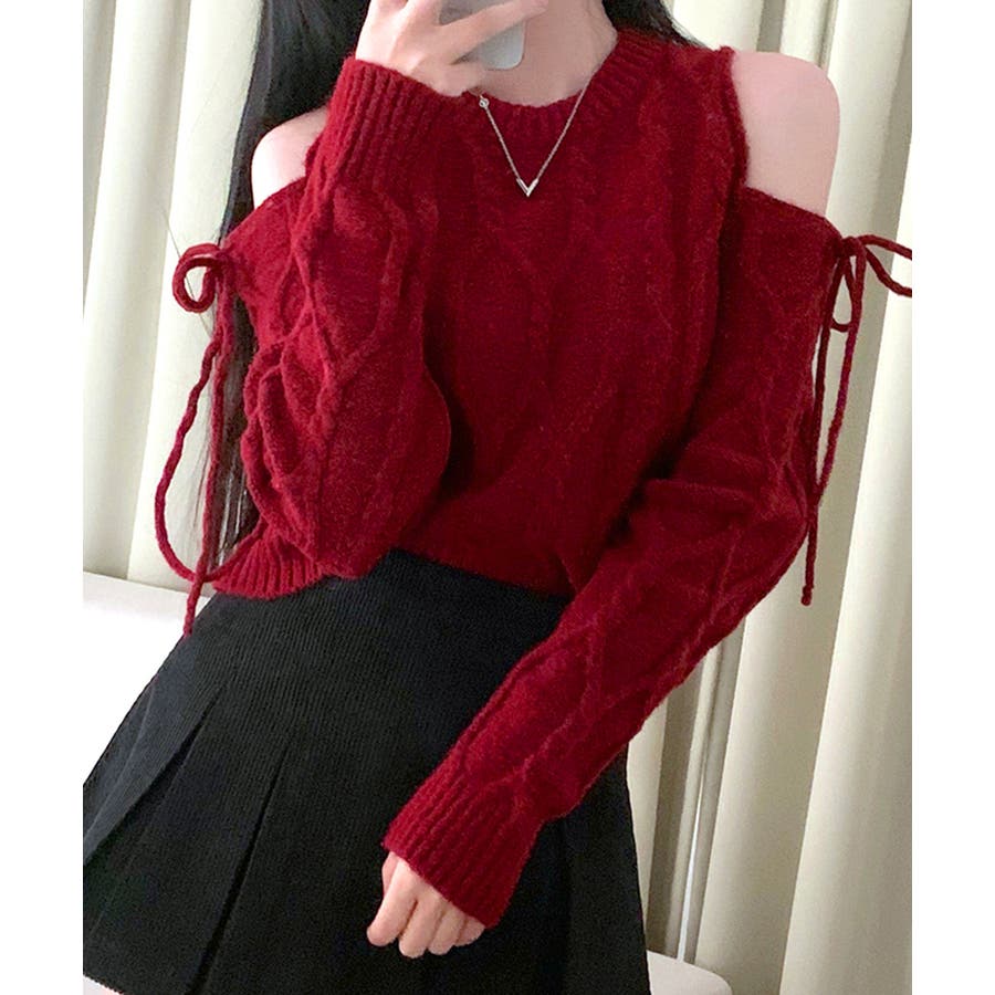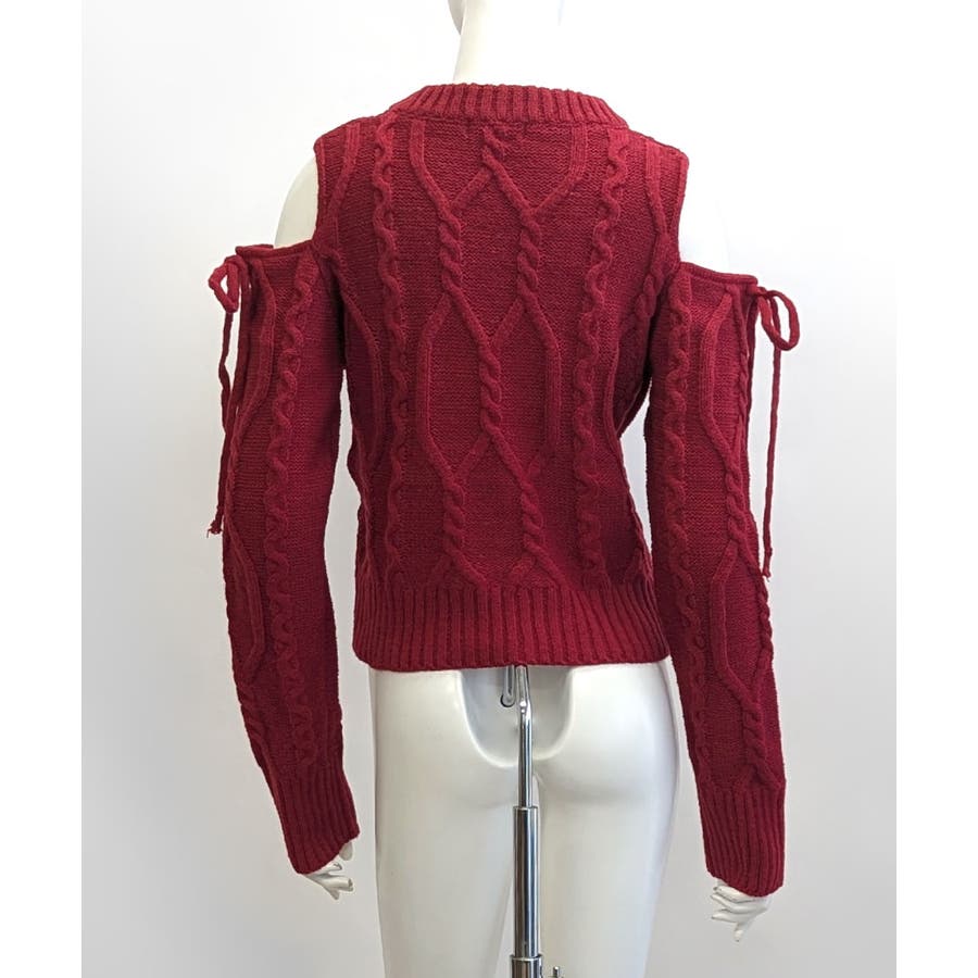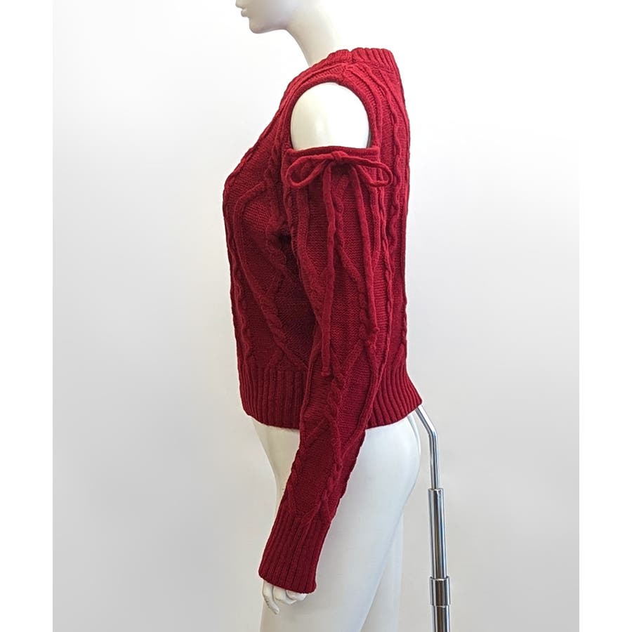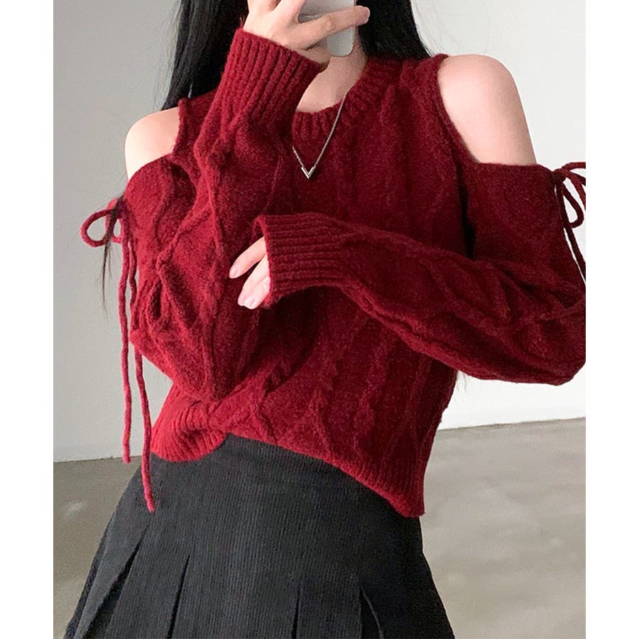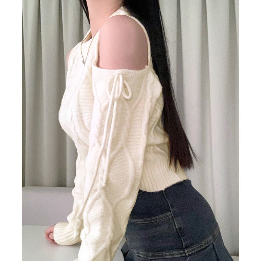 オープンショルダーリボンケーブルニット