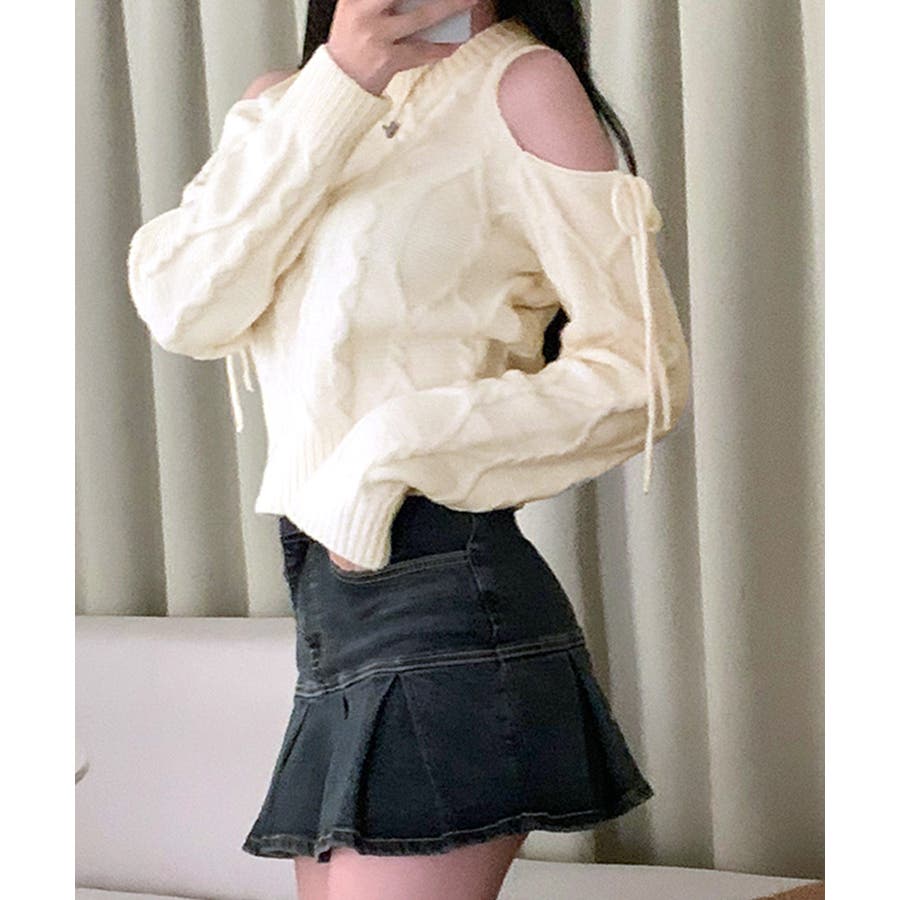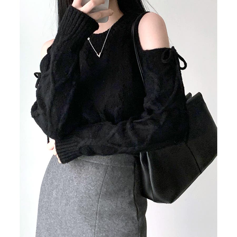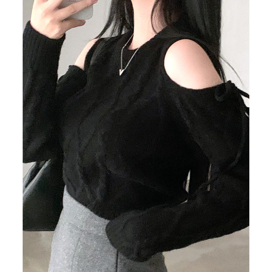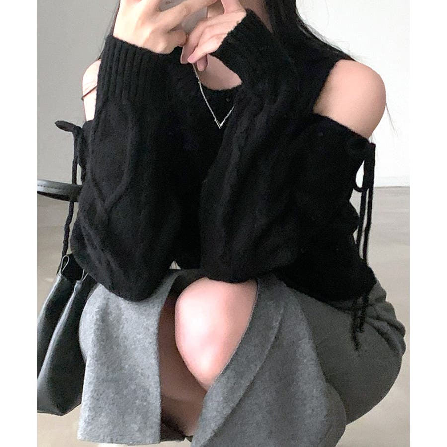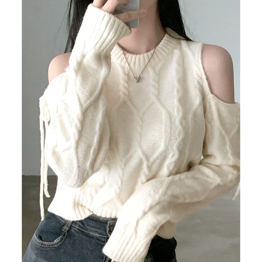 オープンショルダーリボンケーブルニット オフショル セーター