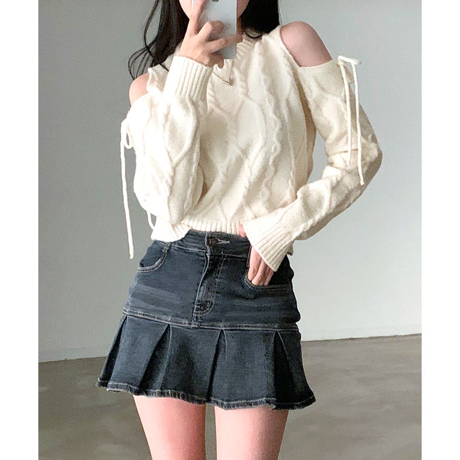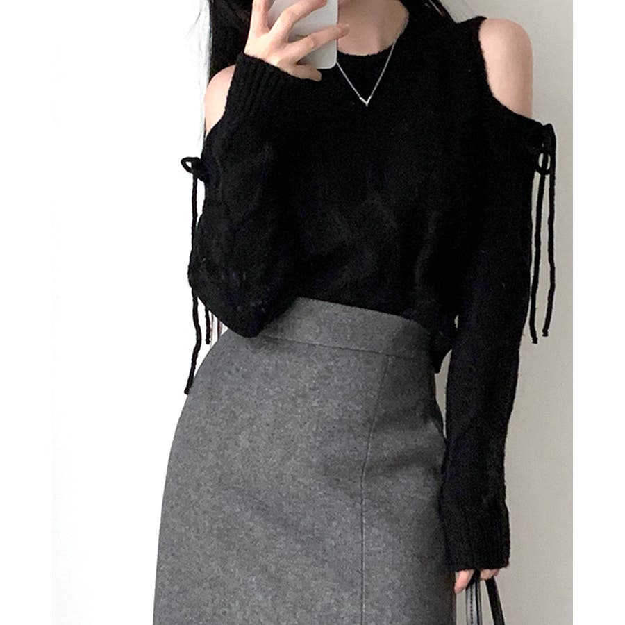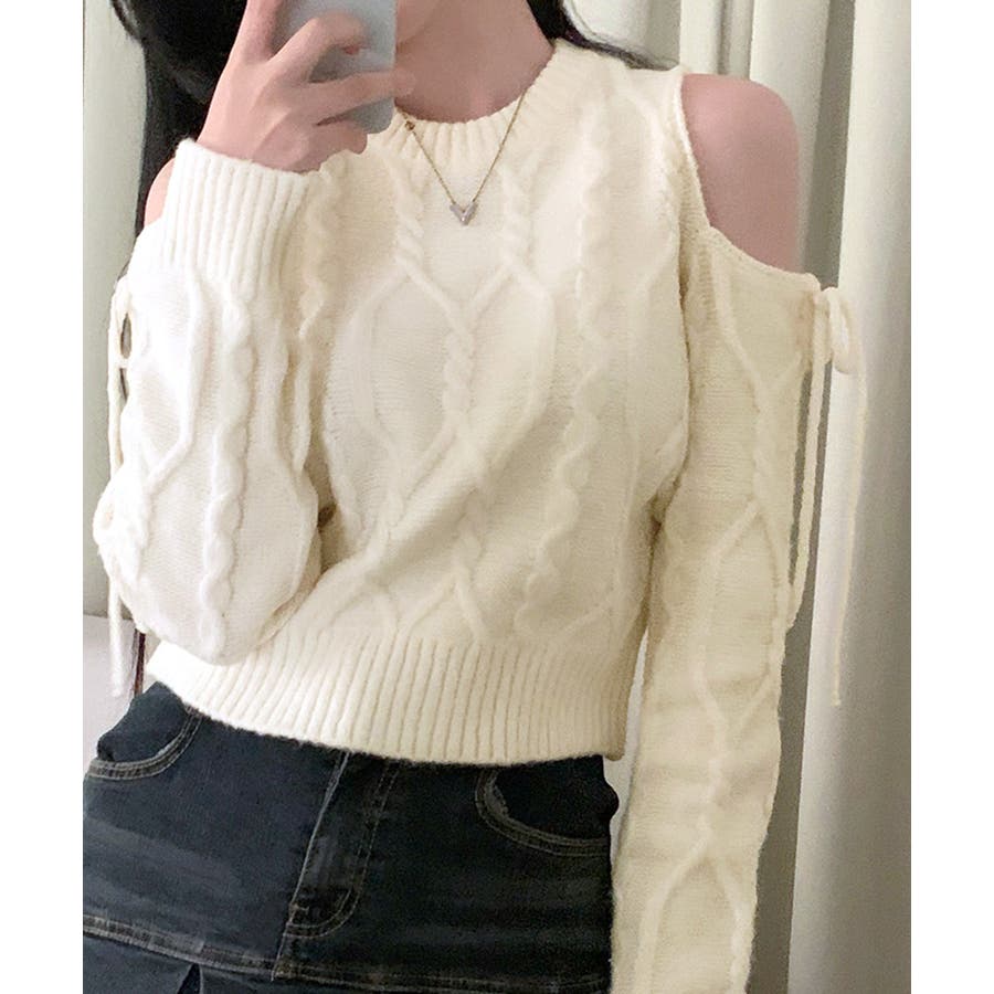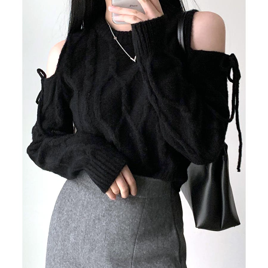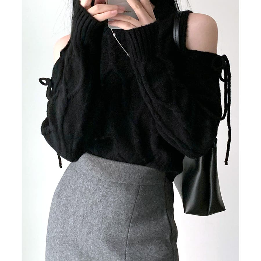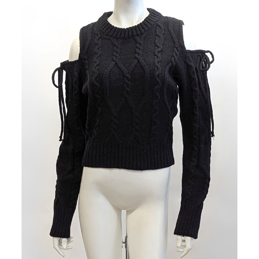 オープンショルダーリボンケーブルニット オフショル セーター