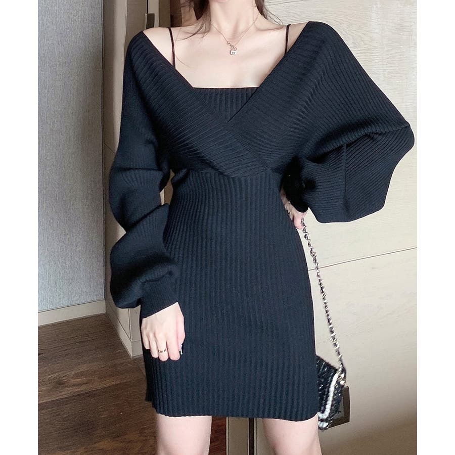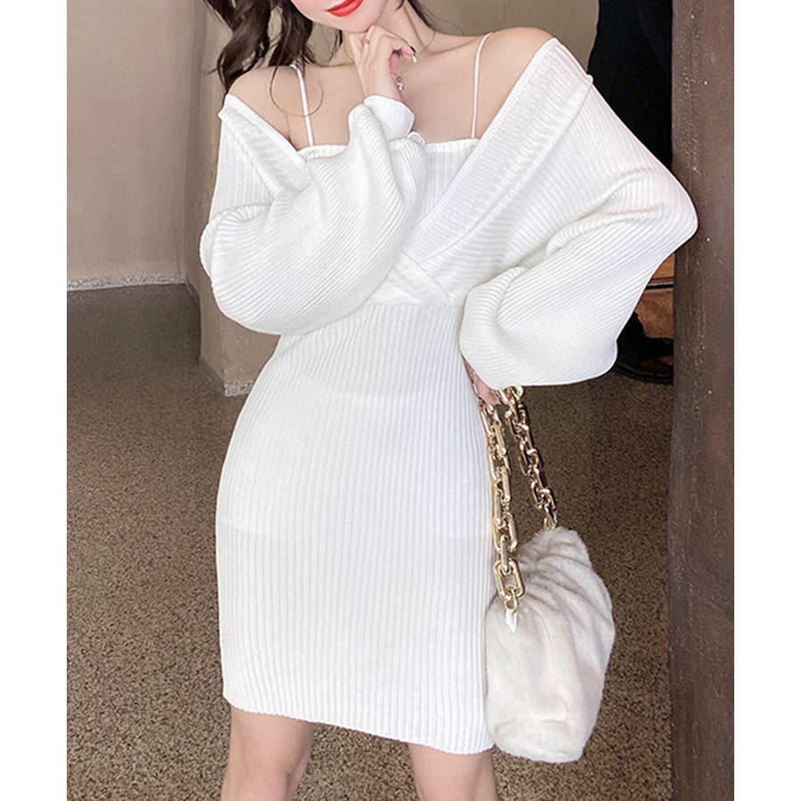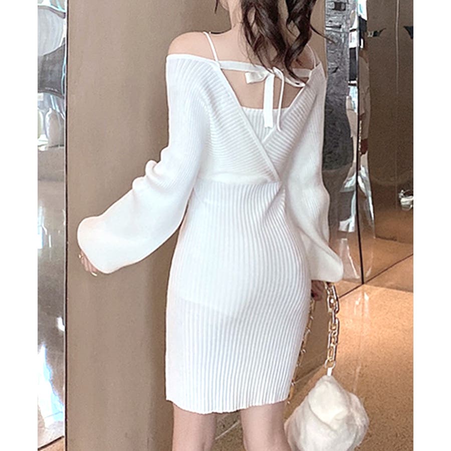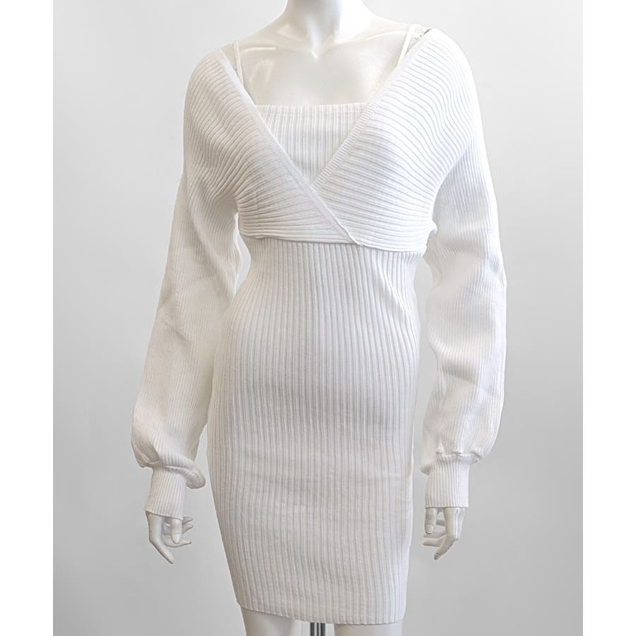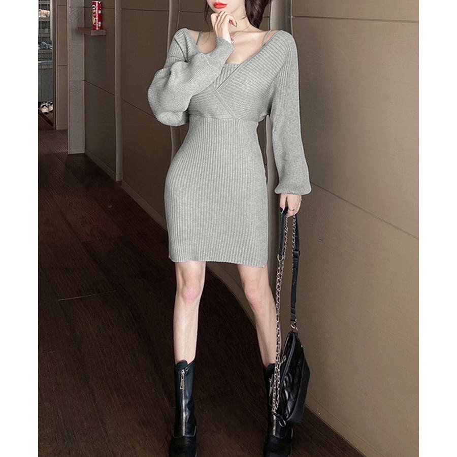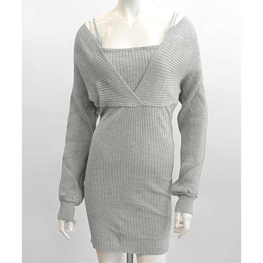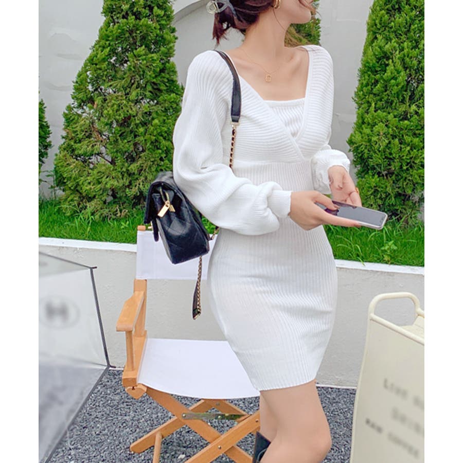 アンサンブル風リブニットワンピース バックリボン カシュクールワンピース