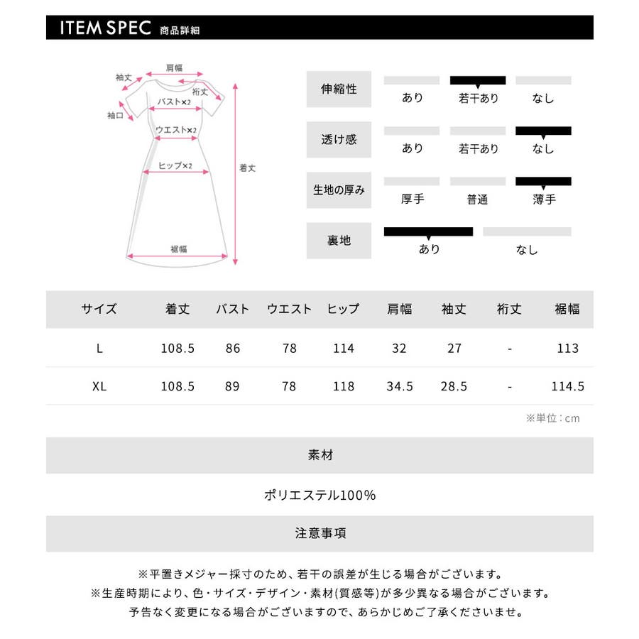 [L] 着丈:108.5cm / バスト:86cm / ウエスト:78cm / ヒップ:114cm / 肩幅:32cm / 袖丈:27cm / 裾幅:113cm