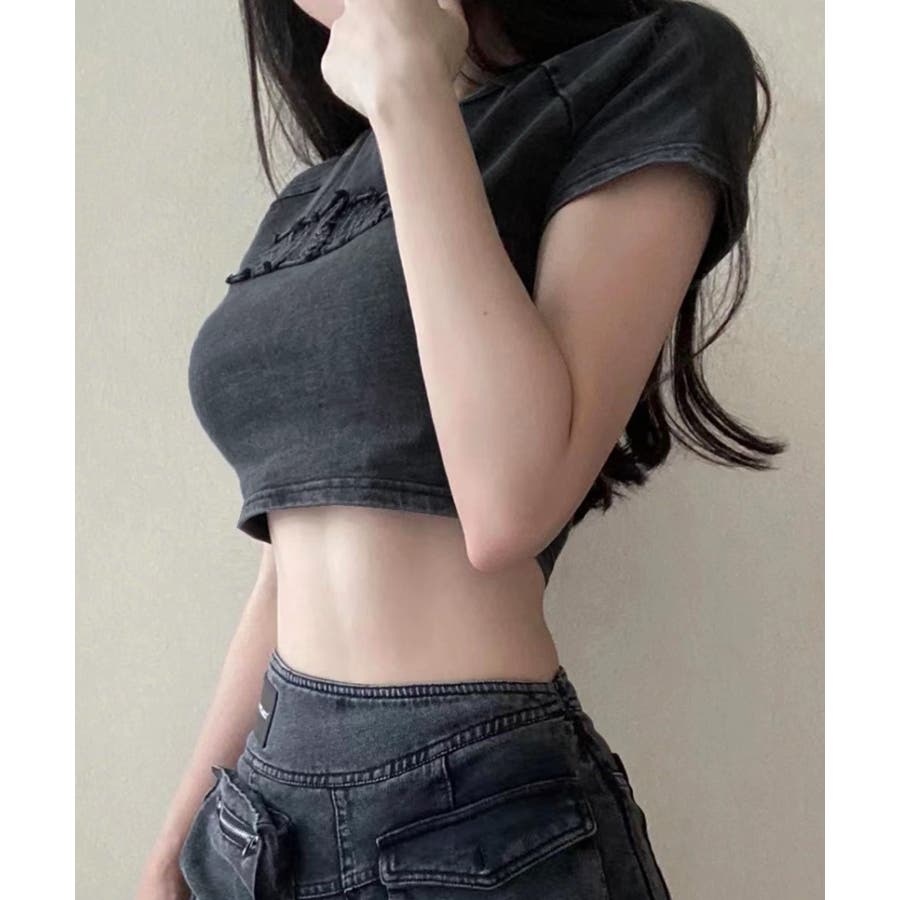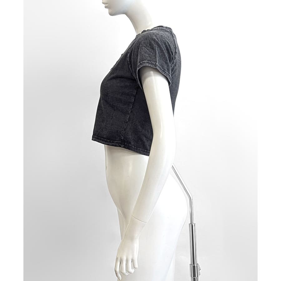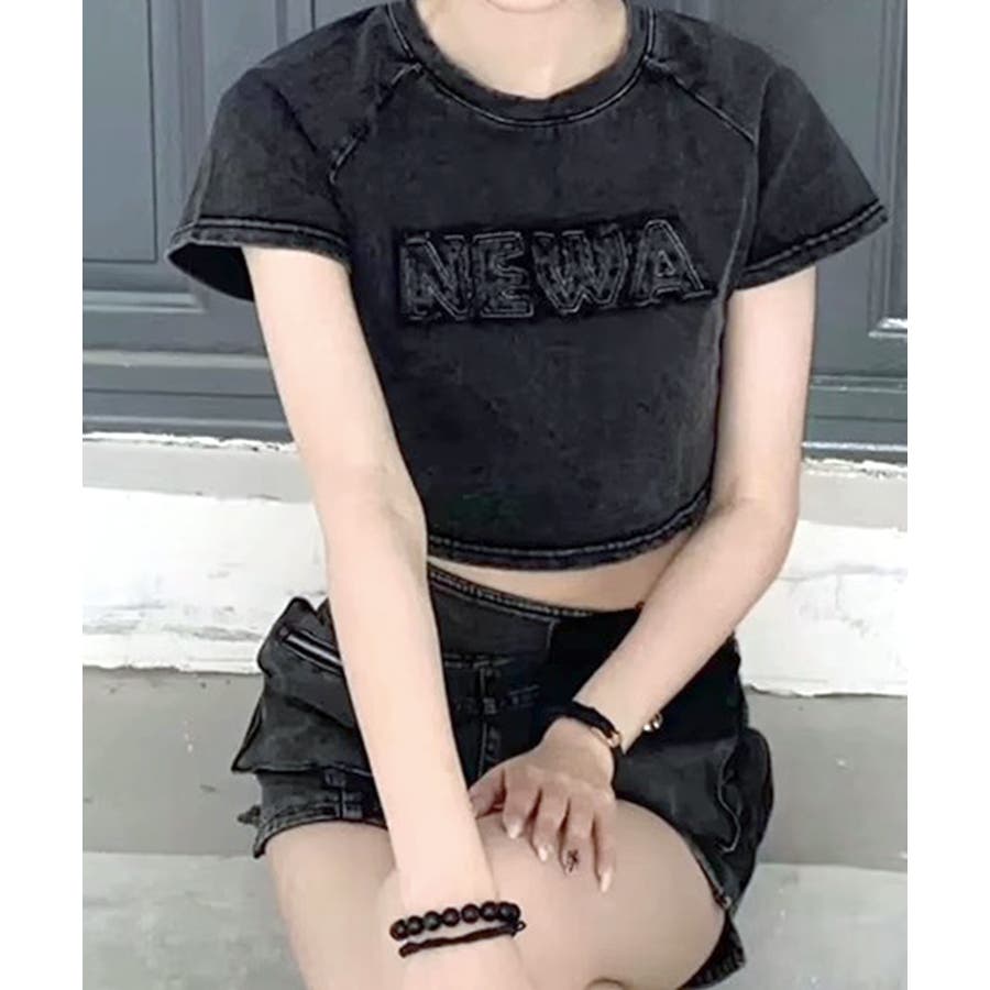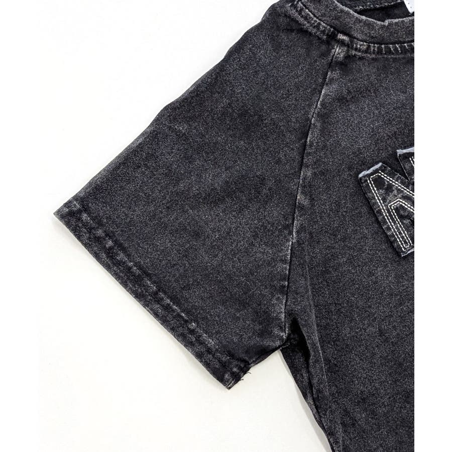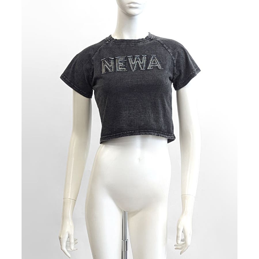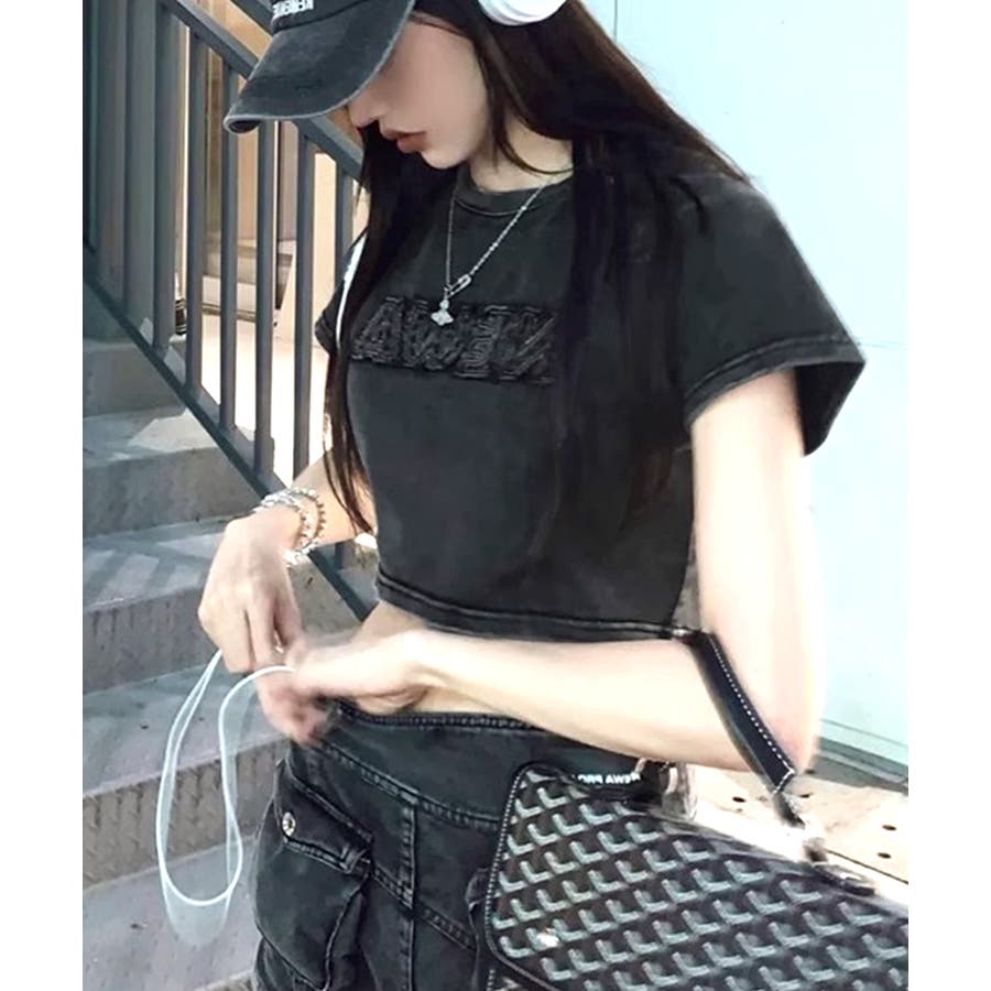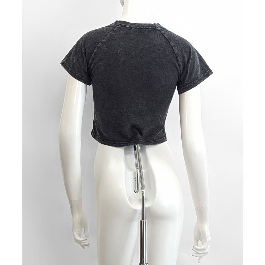 ウォッシュド加工とロゴ刺繍が目を惹くクロップドTシャツ。