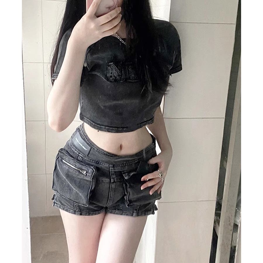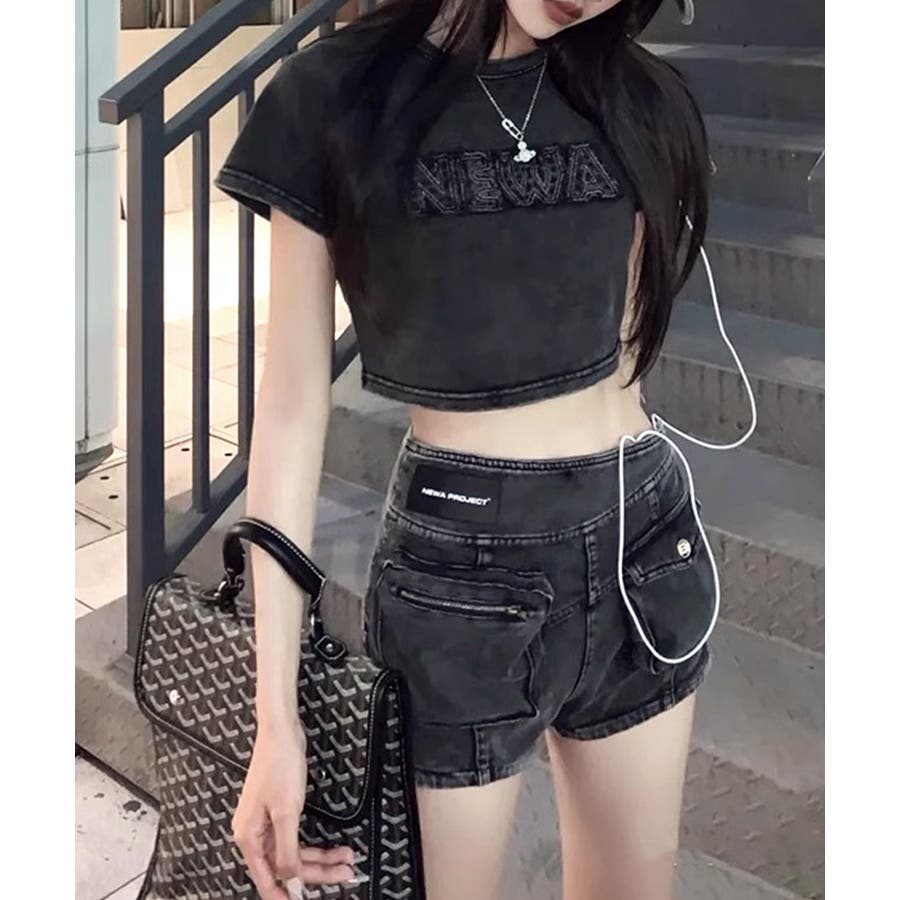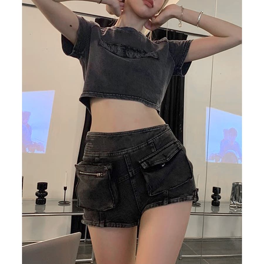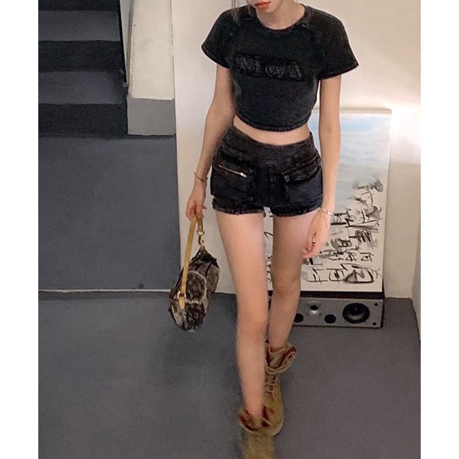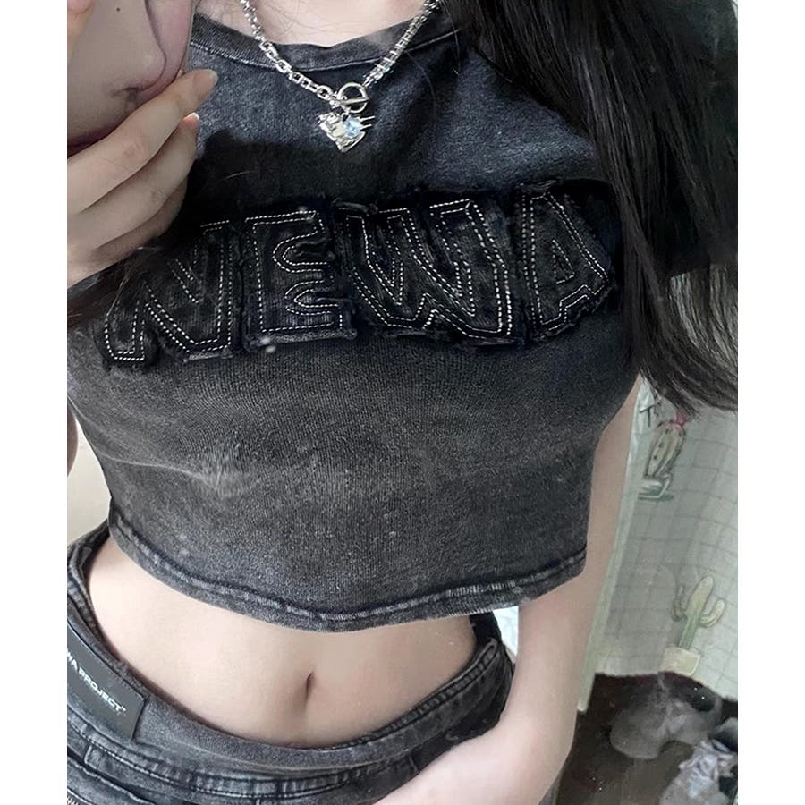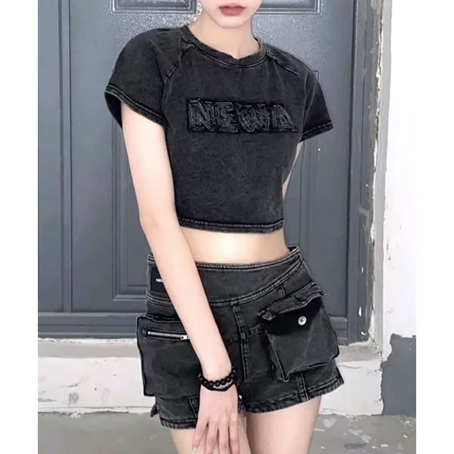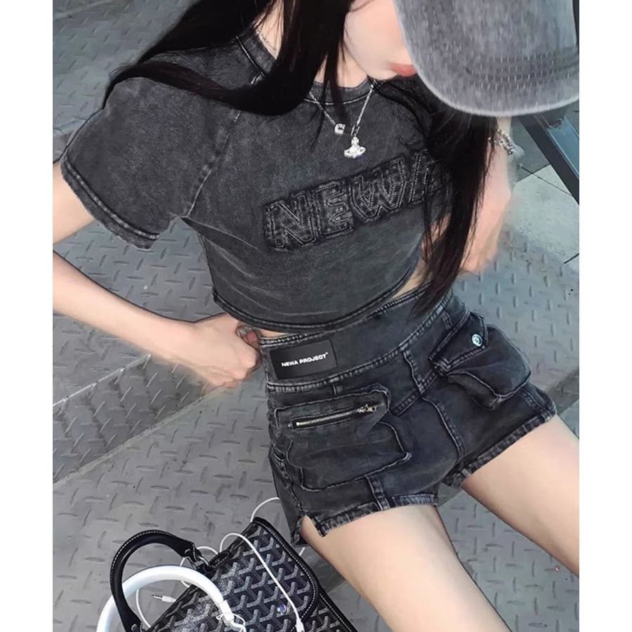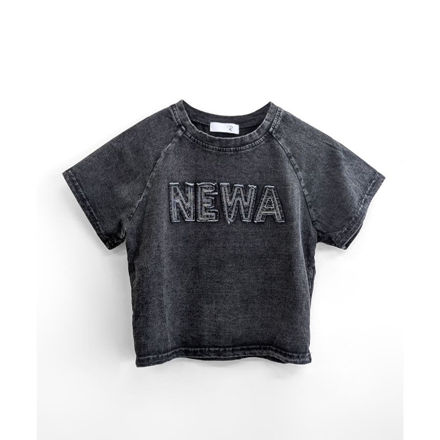 ウォッシュド加工とロゴ刺繍が目を惹くクロップドTシャツ。