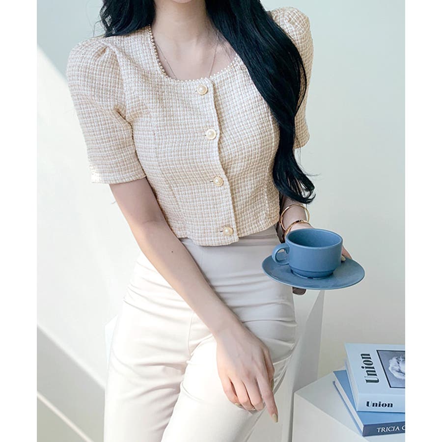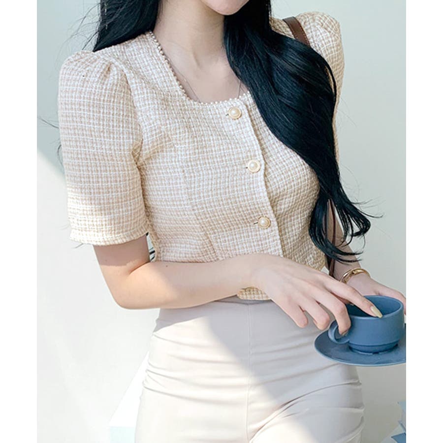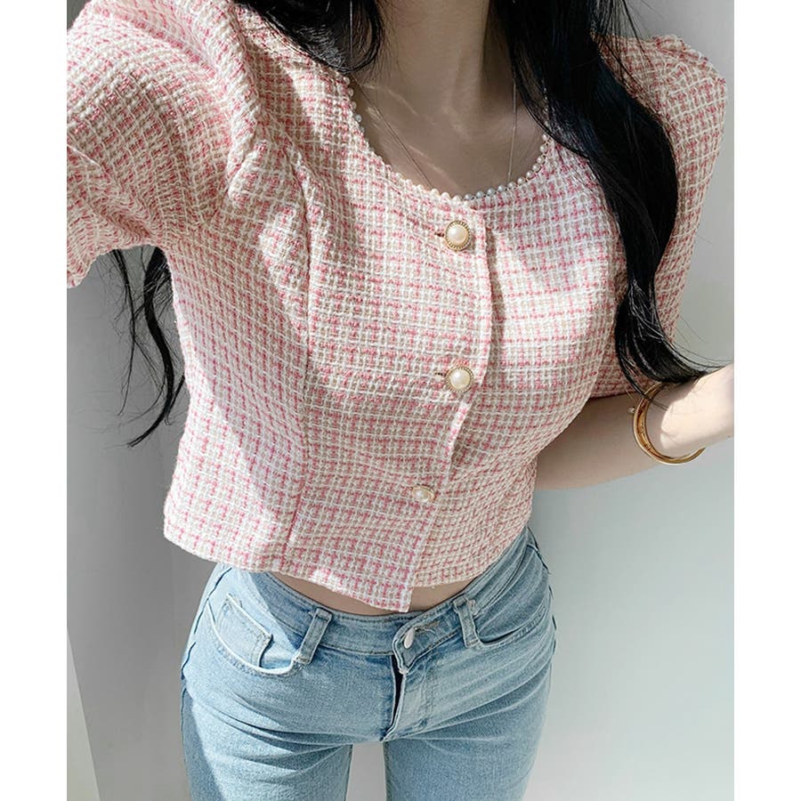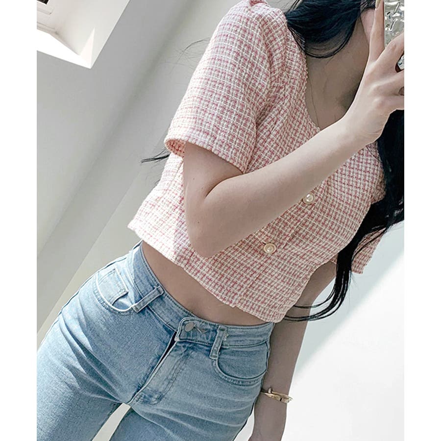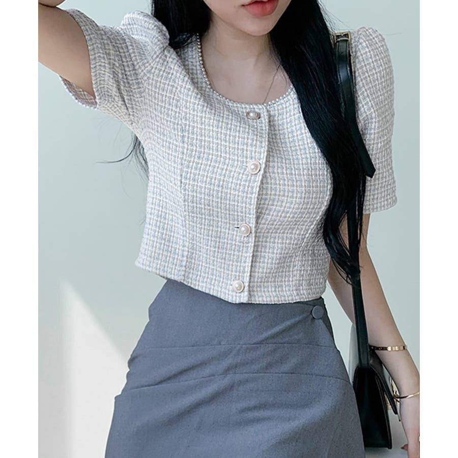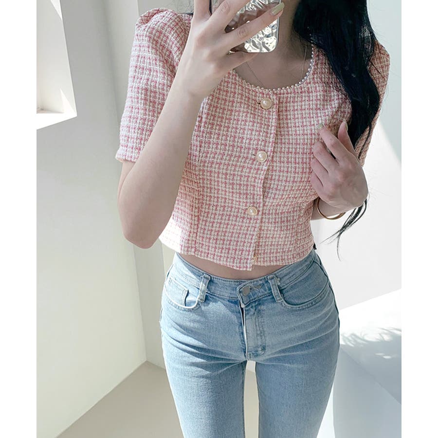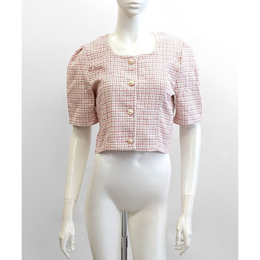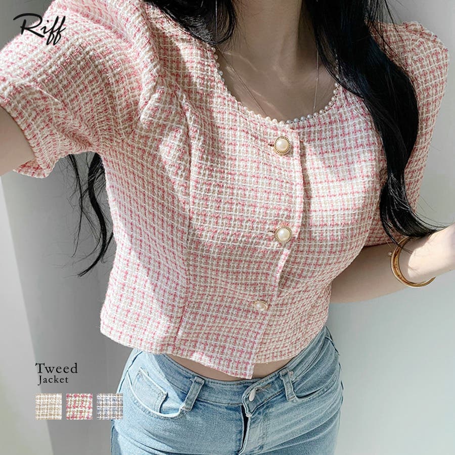 ショート丈ツイードジャケット 半袖 ノーカラージャケット
