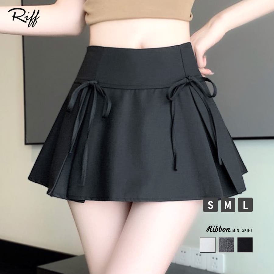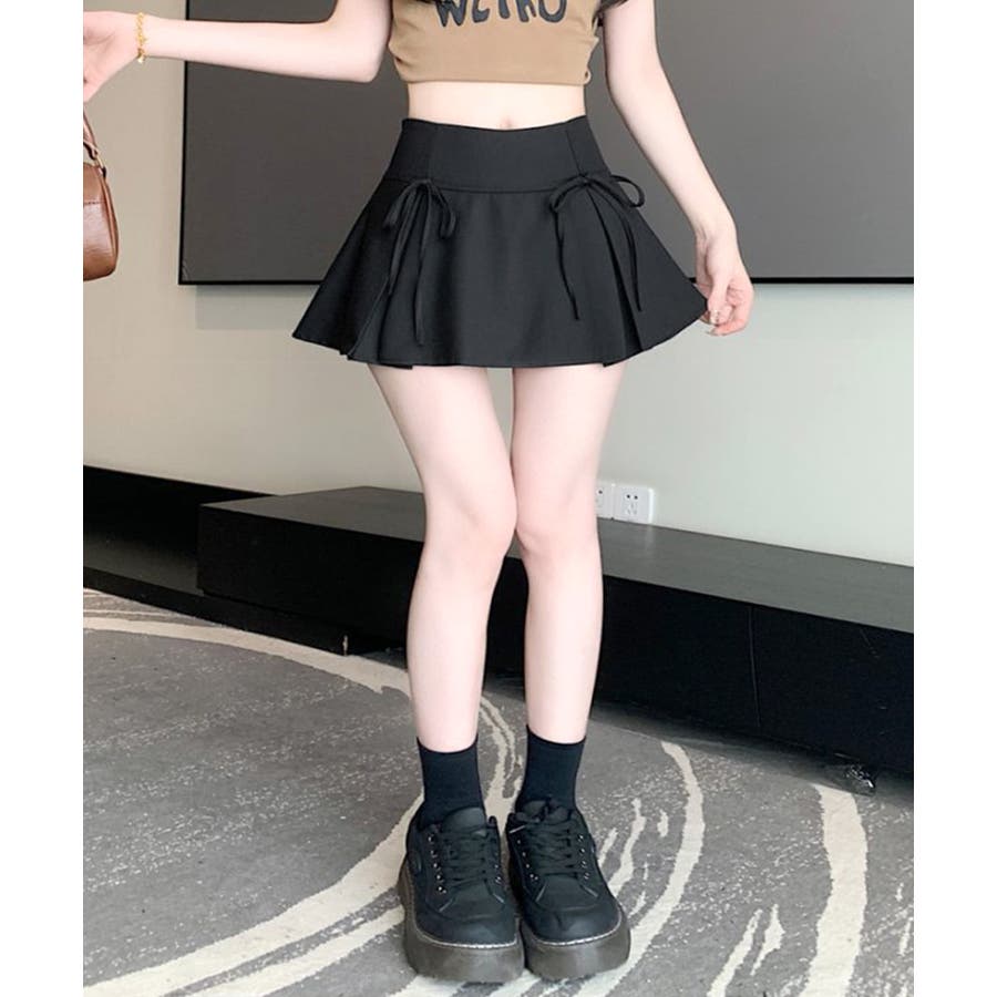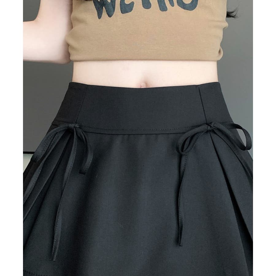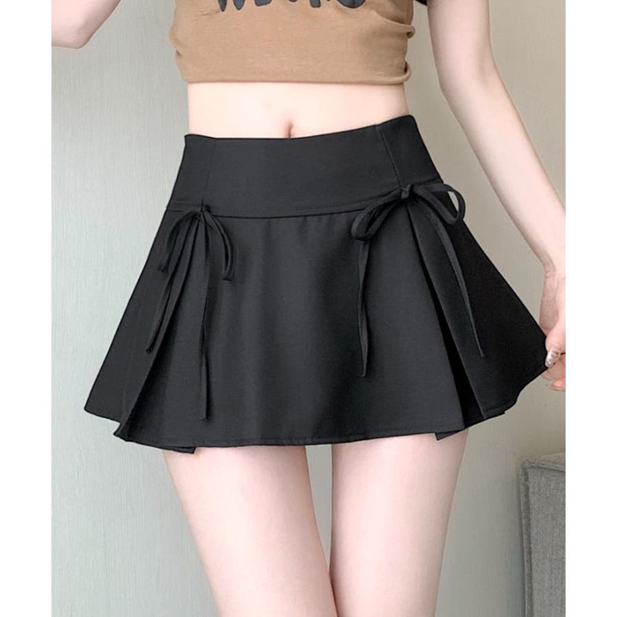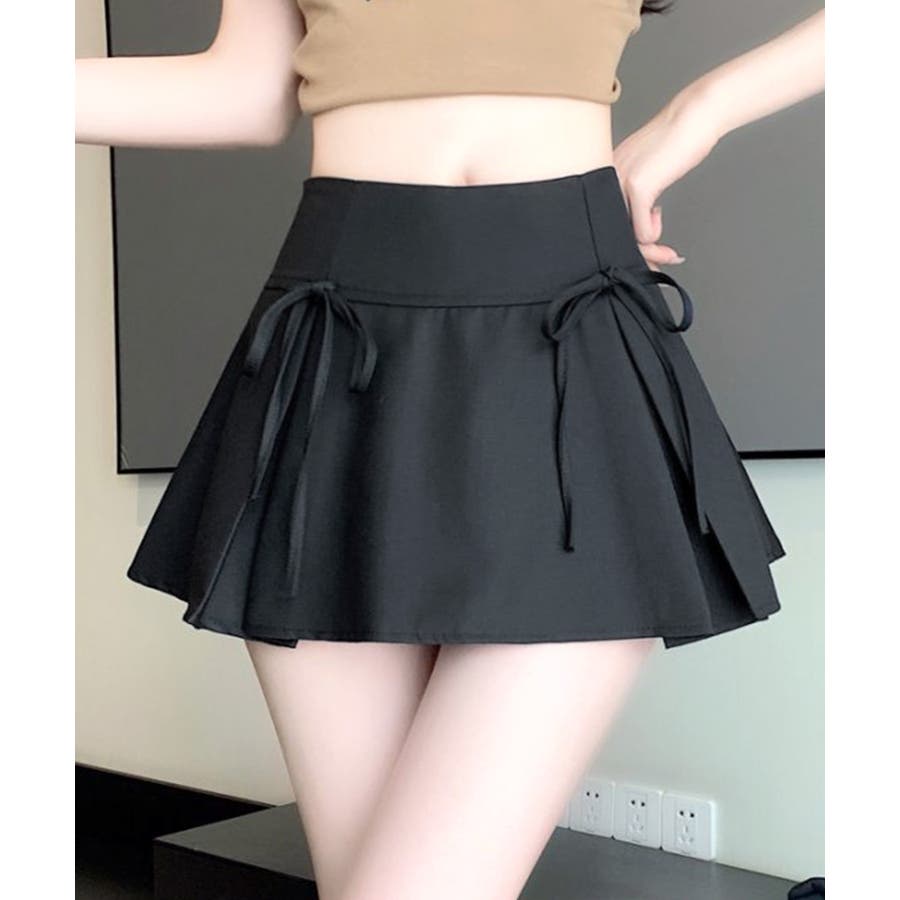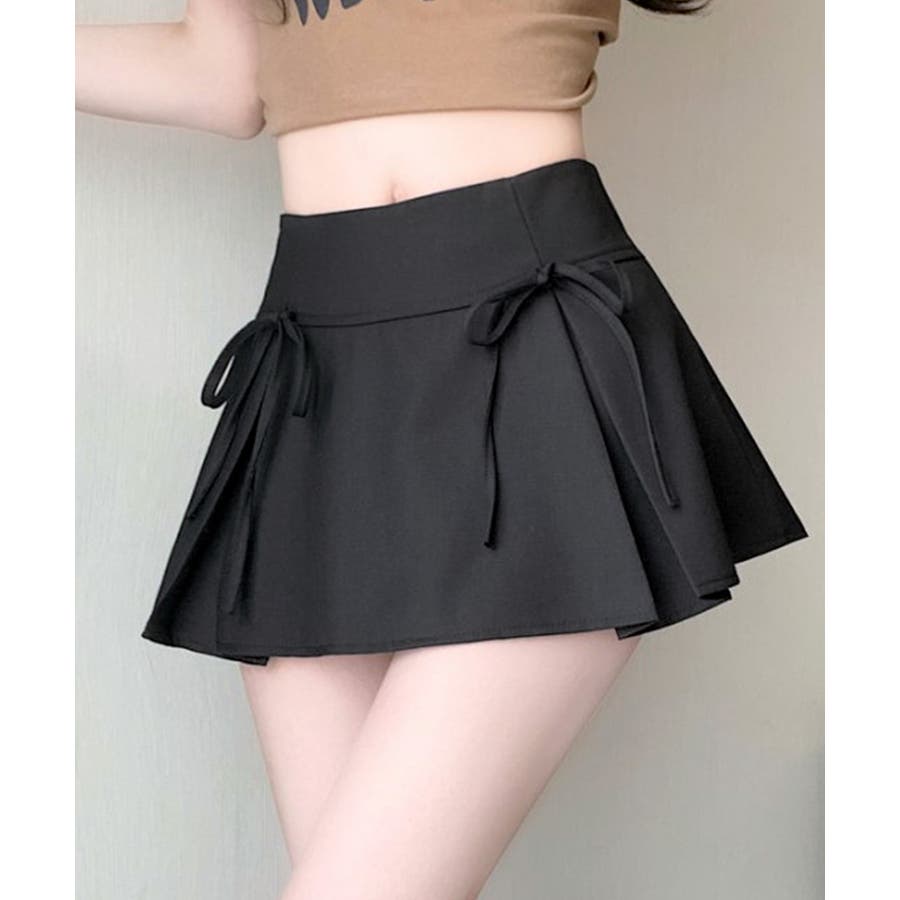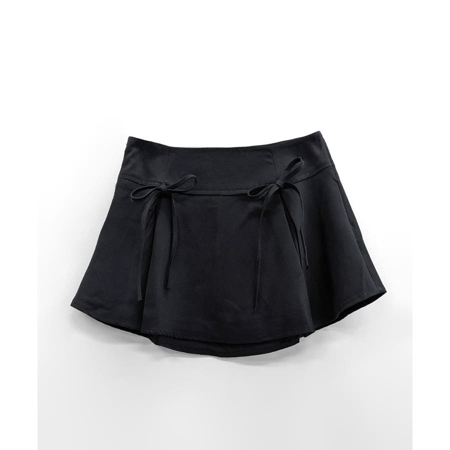 【ブラック】リボンミニスカート インナーパンツ付き フレアスカート