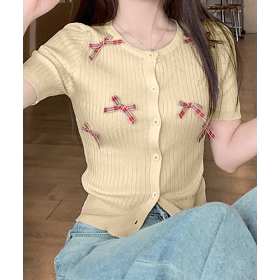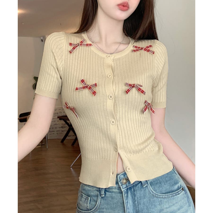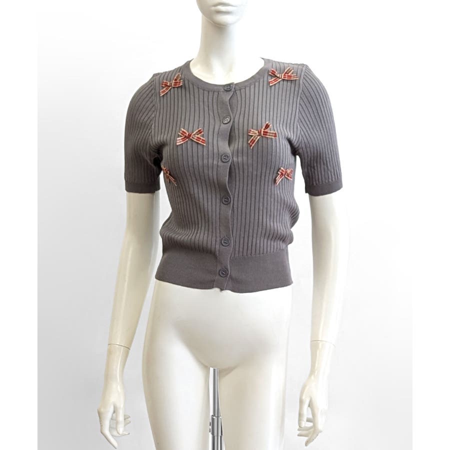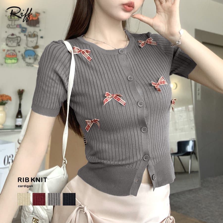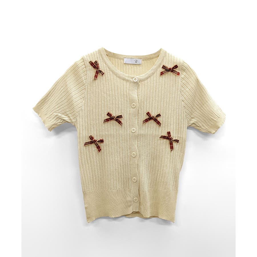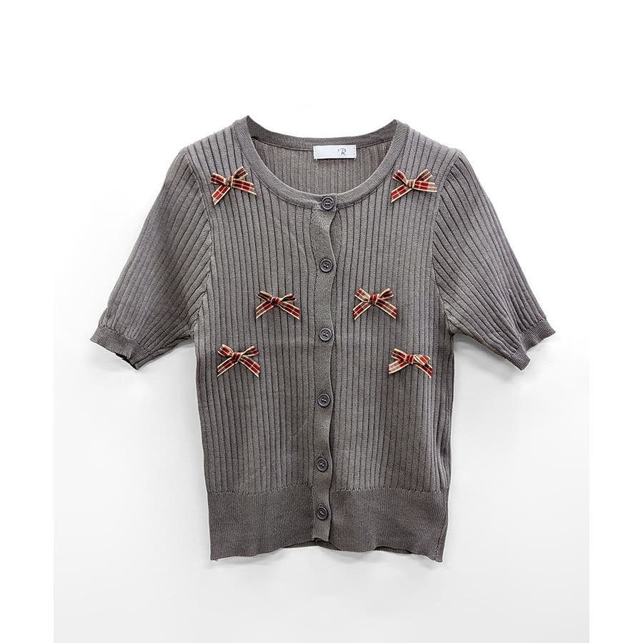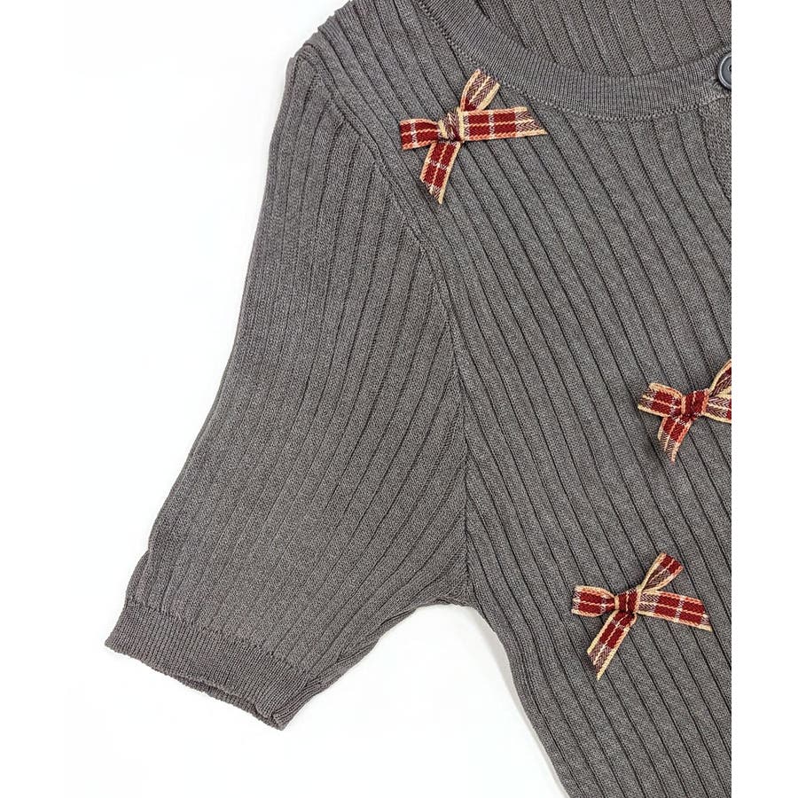 チェックリボン付きカーディガン サマーニット リブニット