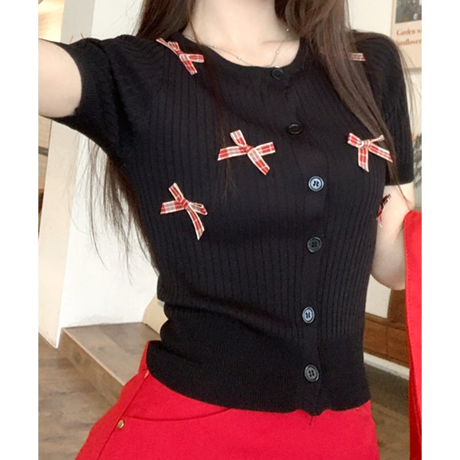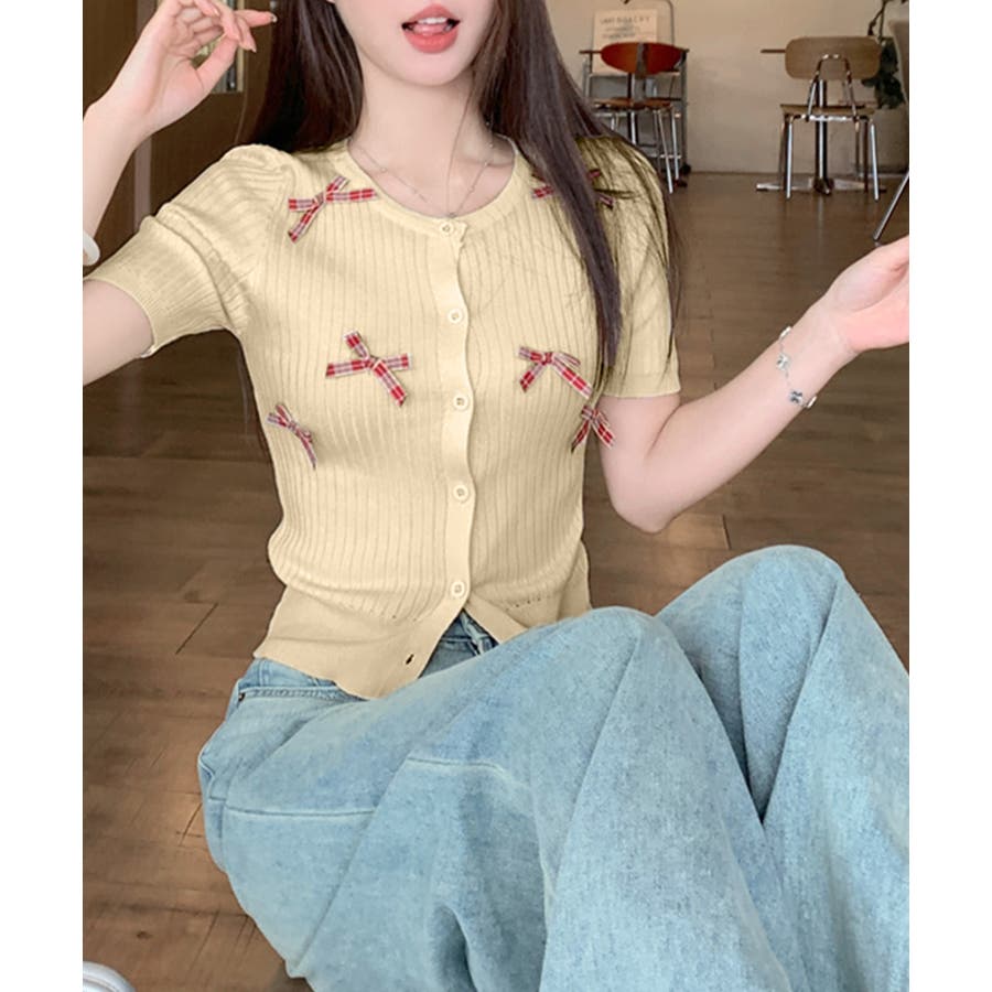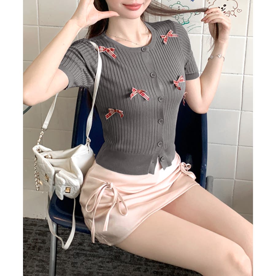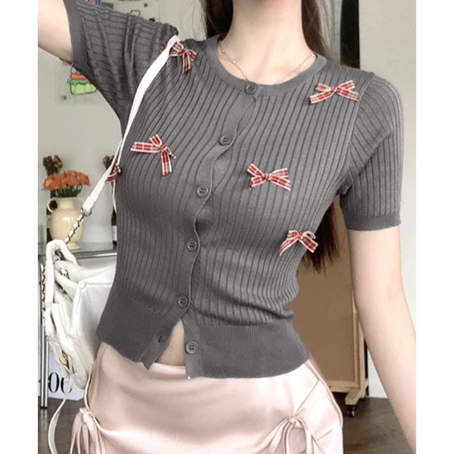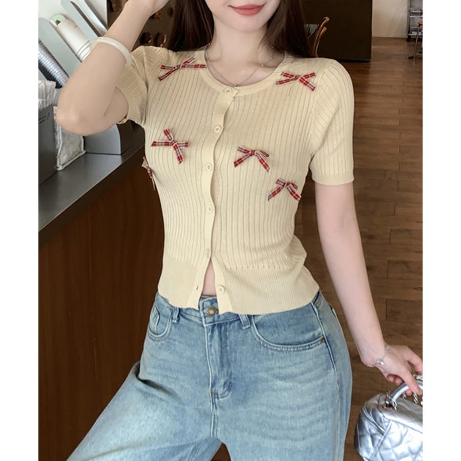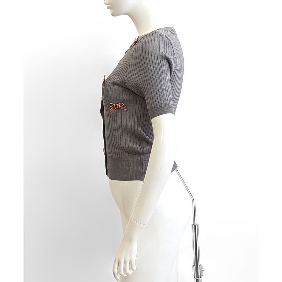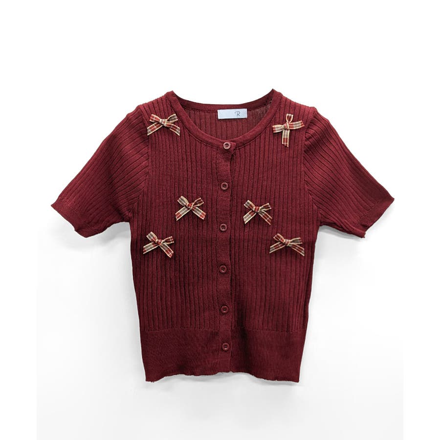 チェックリボン付きカーディガン サマーニット リブニット