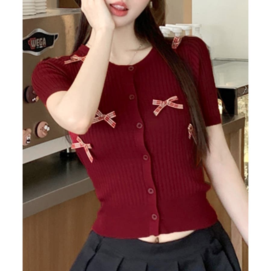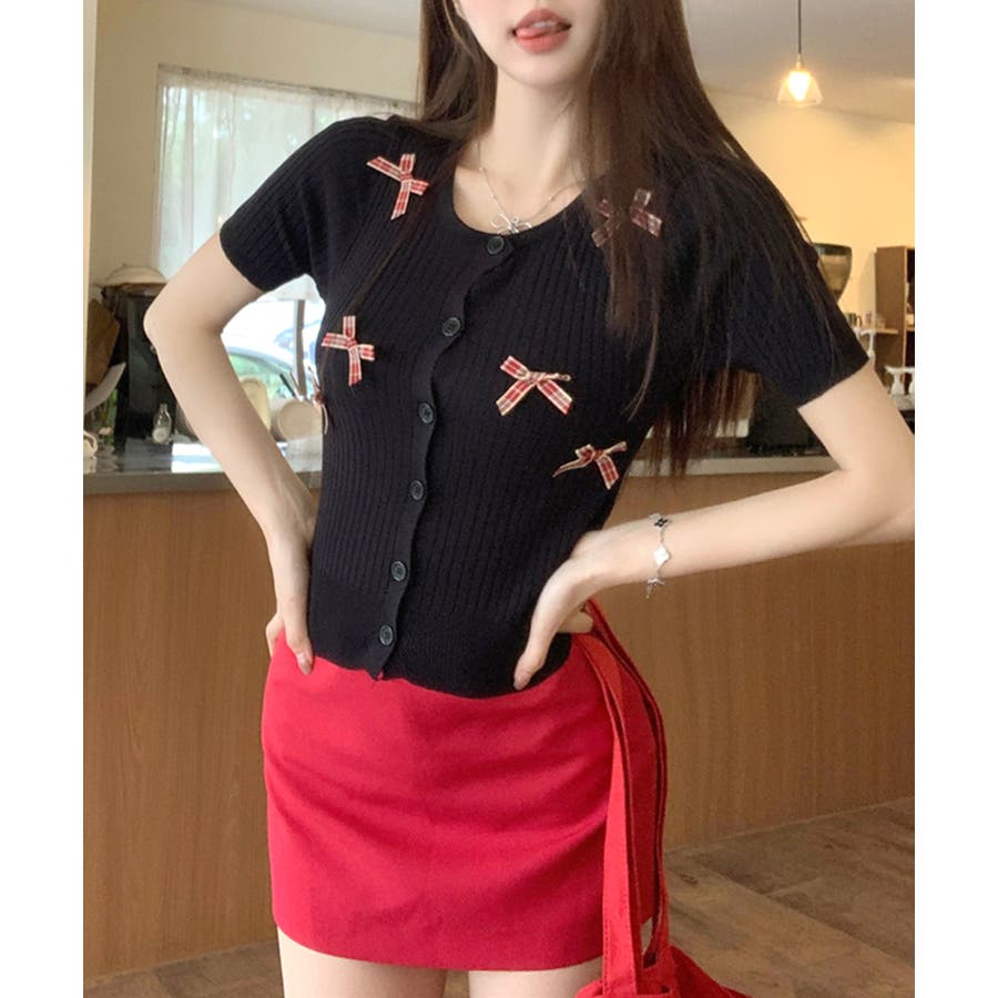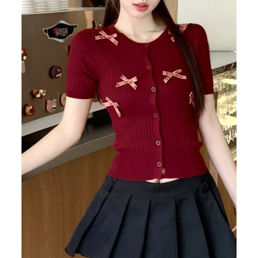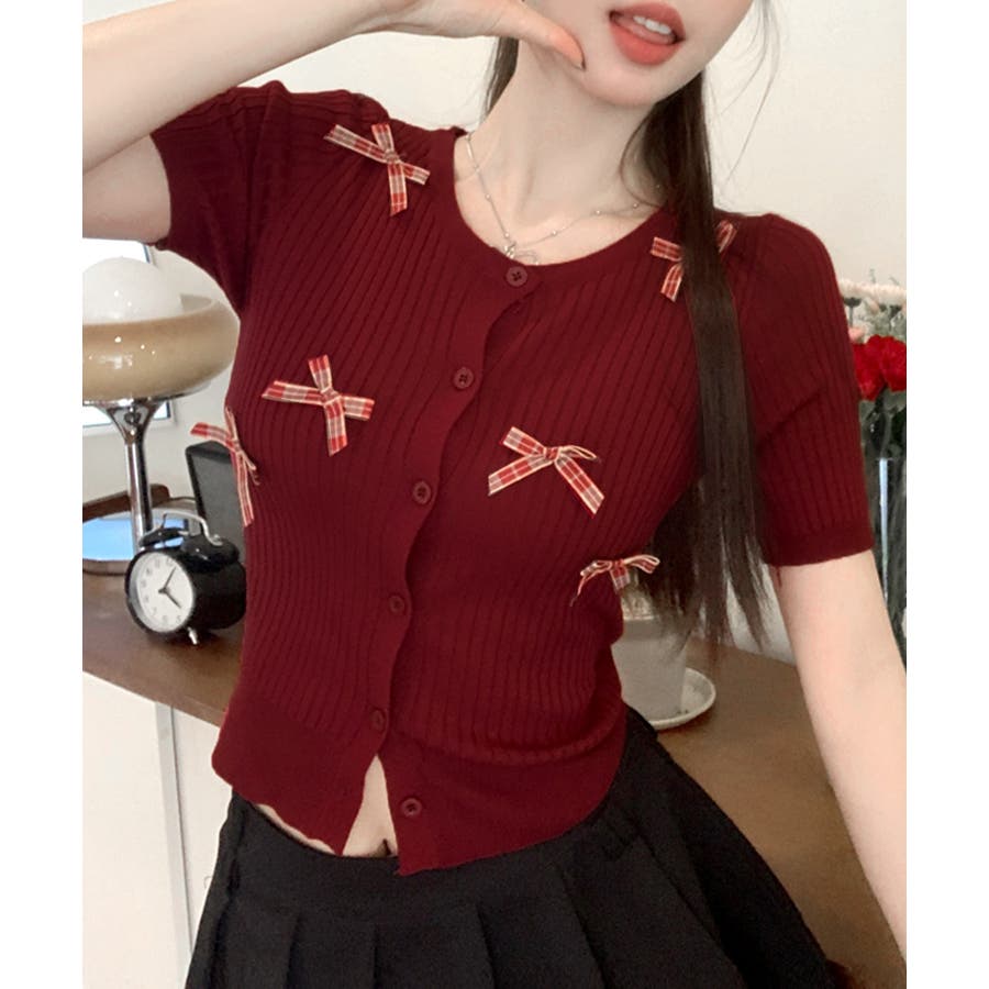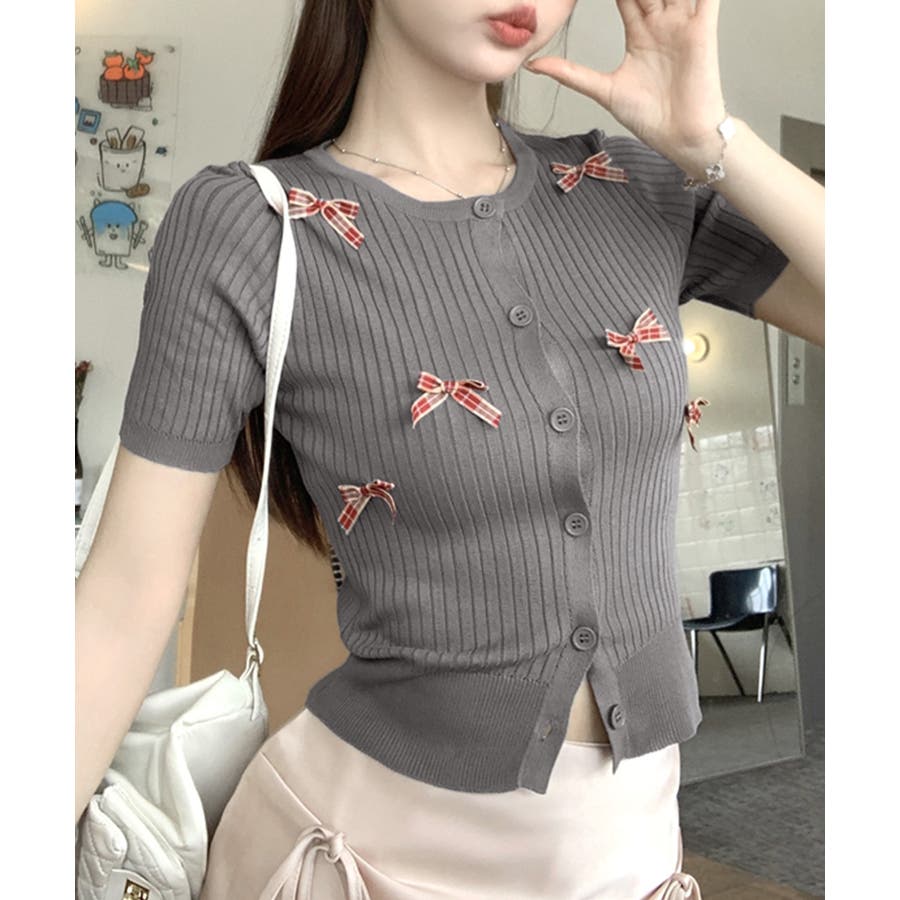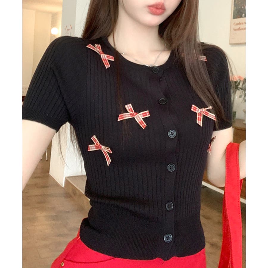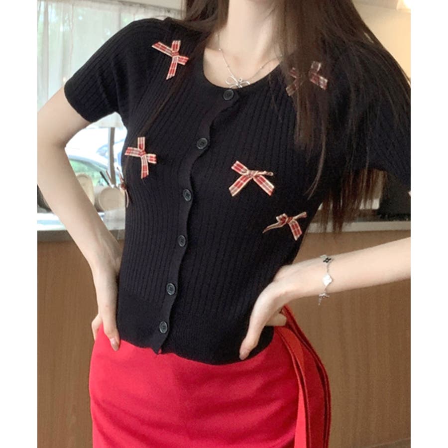 チェックリボン付きカーディガン サマーニット リブニット