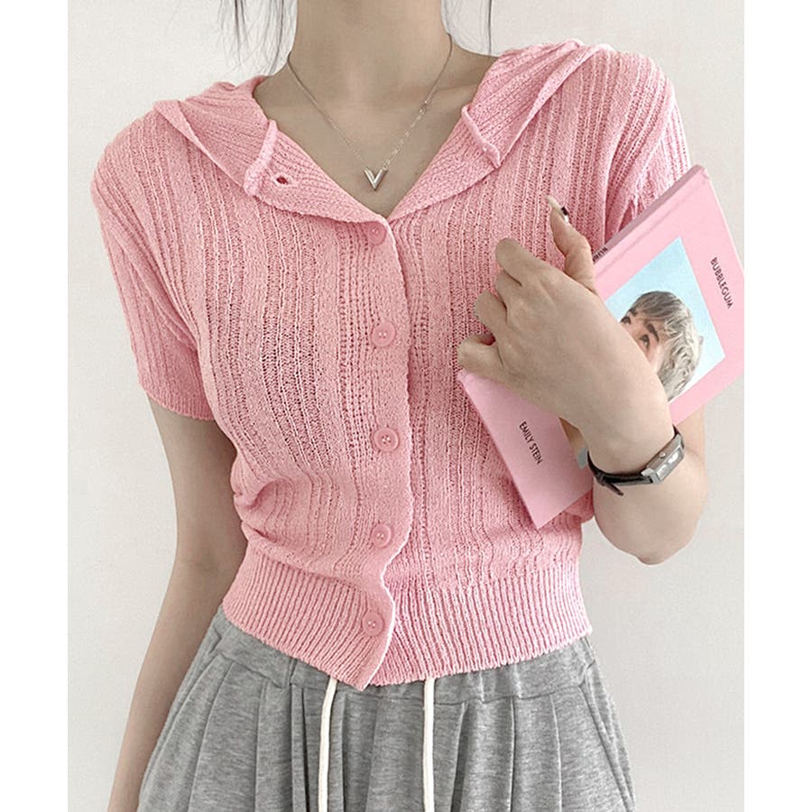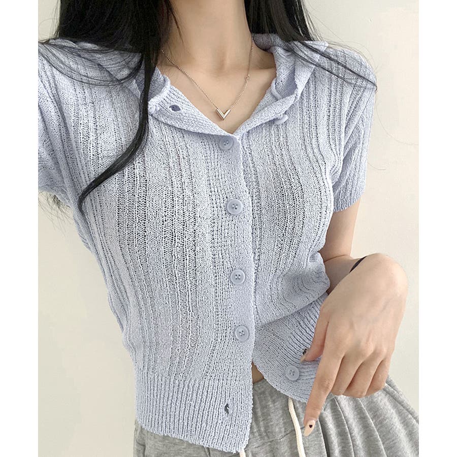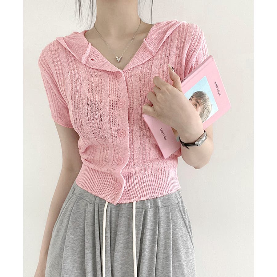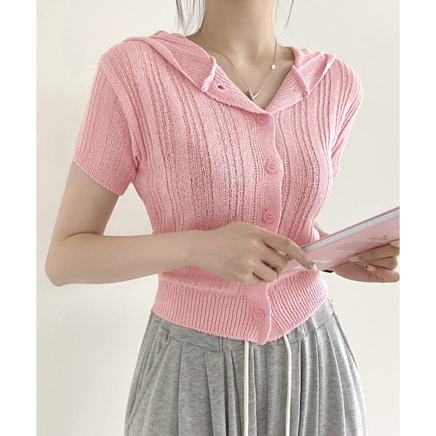 フード付きニット半袖カーディガン サマーニット ニットカーデ