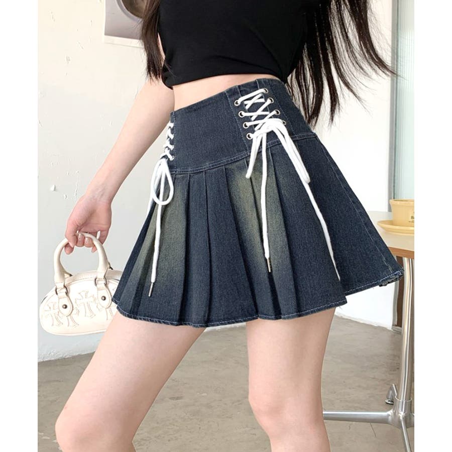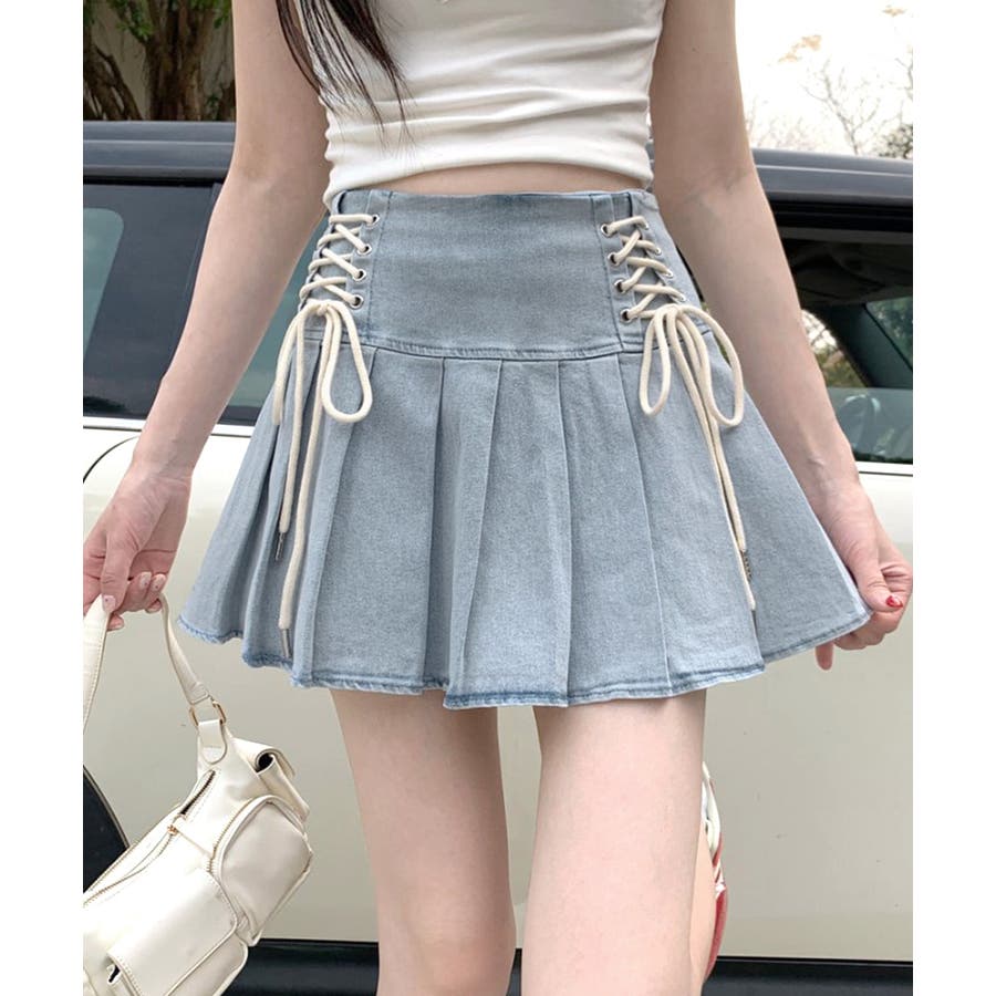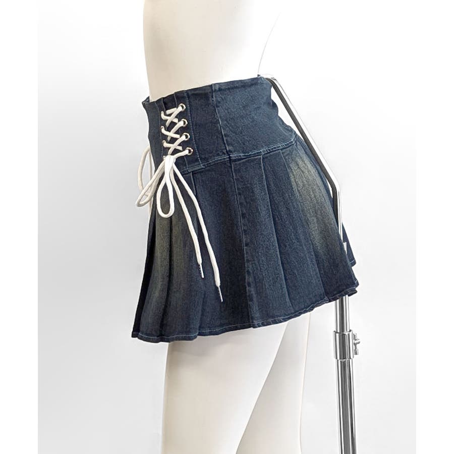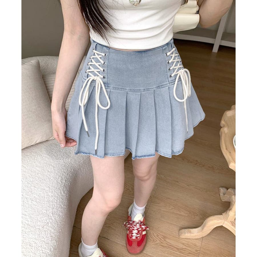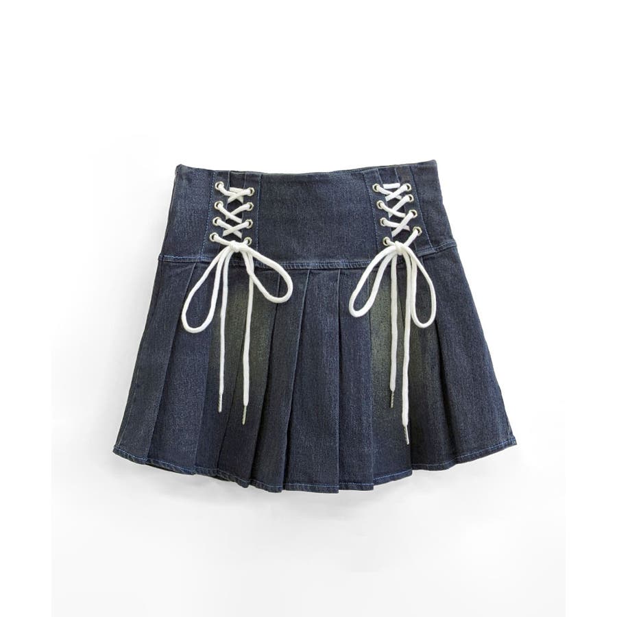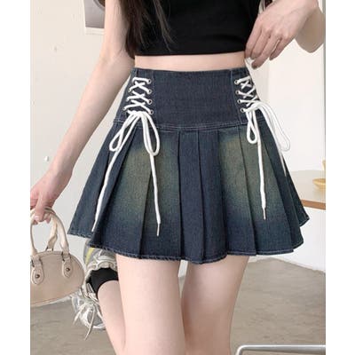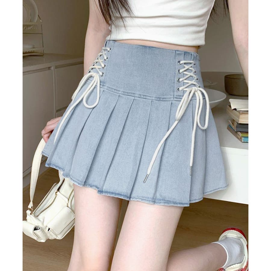 レースアップリボンデニムミニスカート インナーパンツ付き プリーツスカート