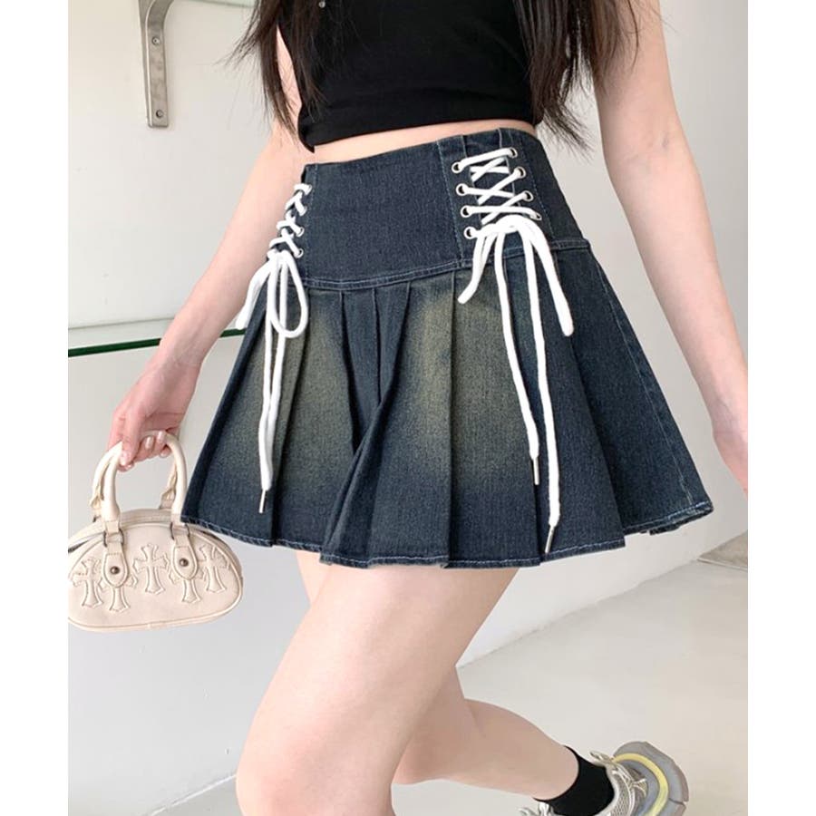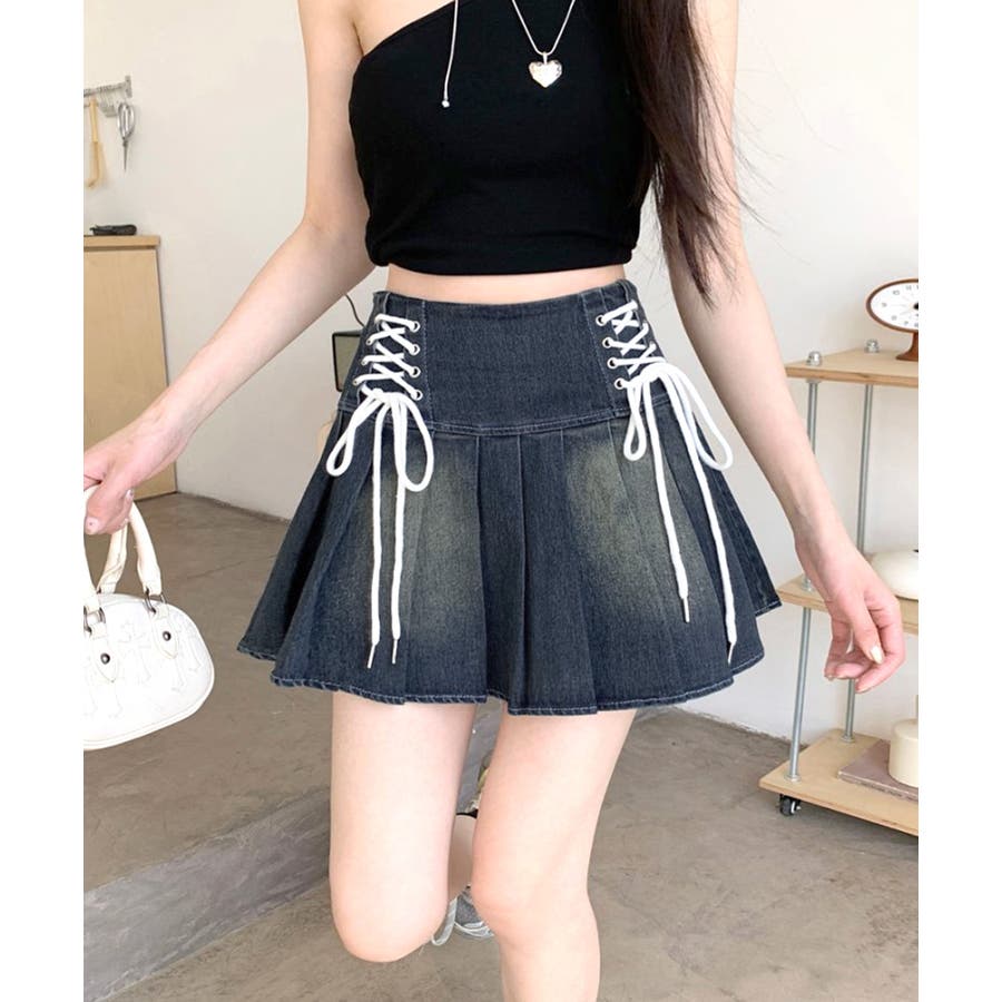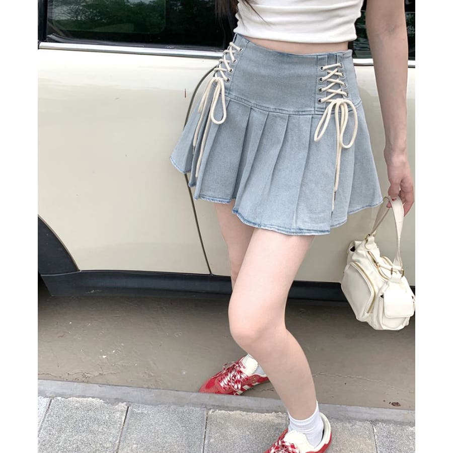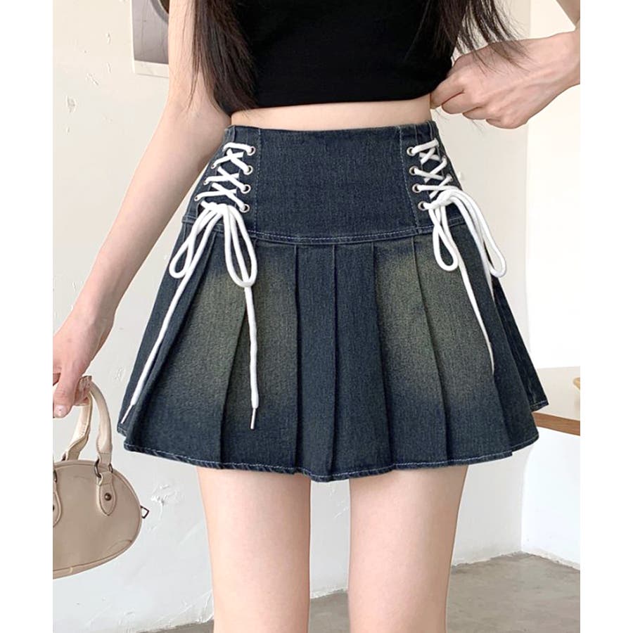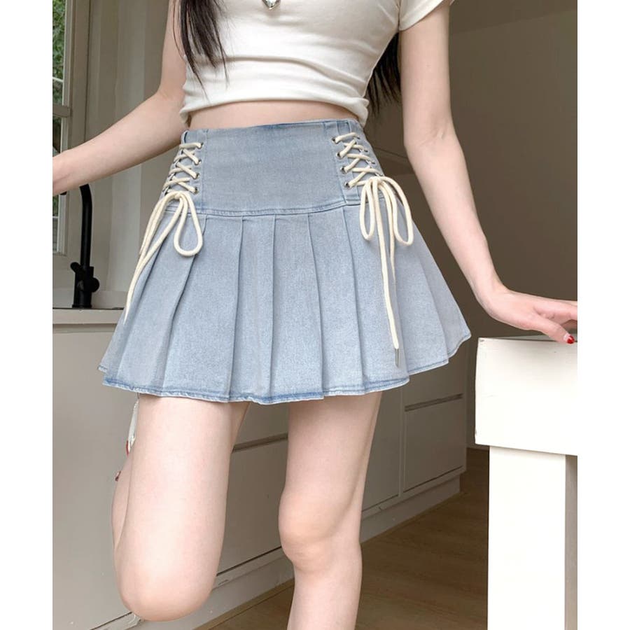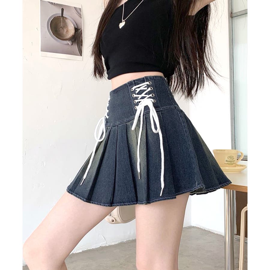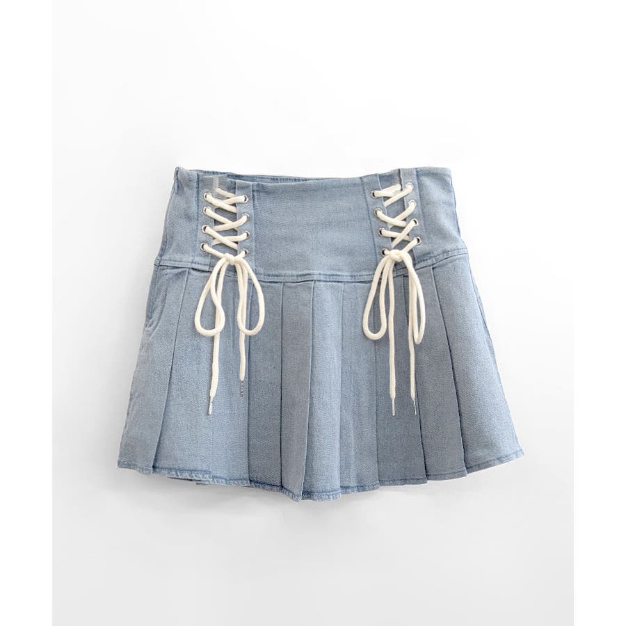 レースアップリボンデニムミニスカート インナーパンツ付き プリーツスカート