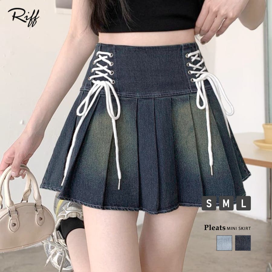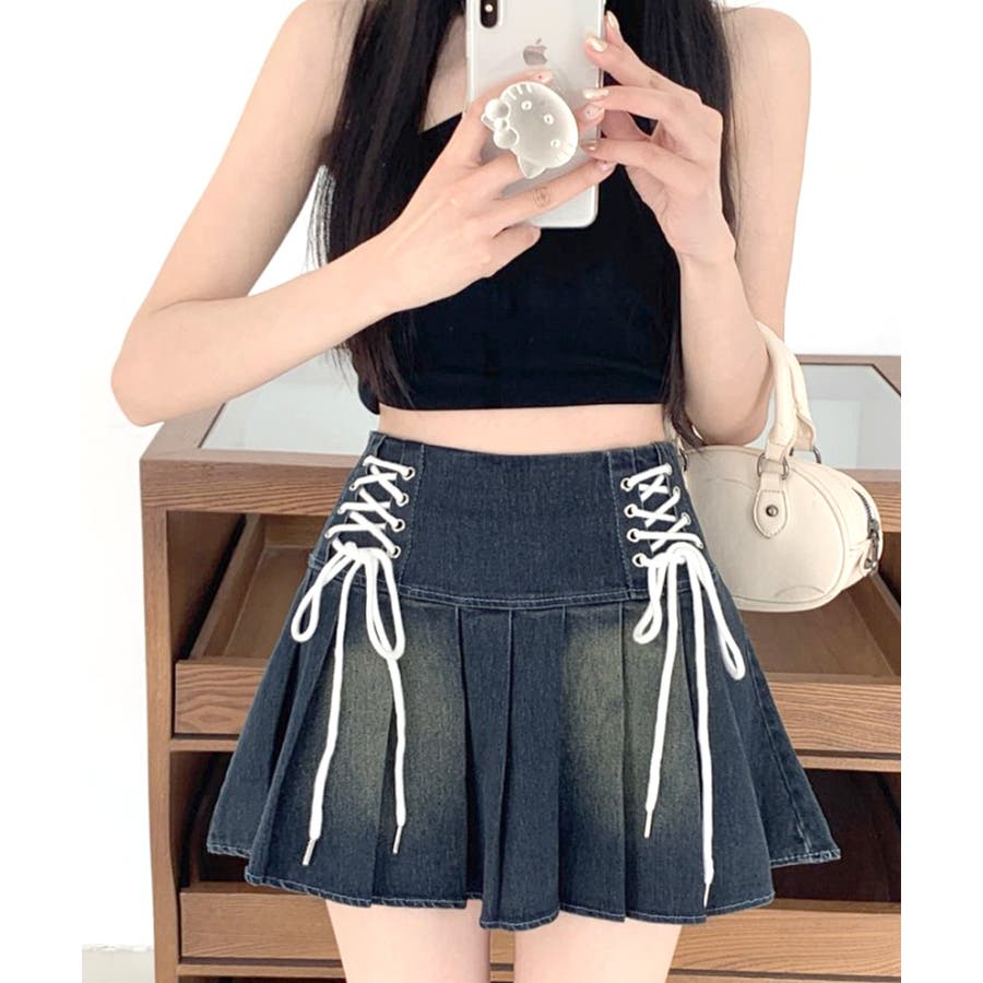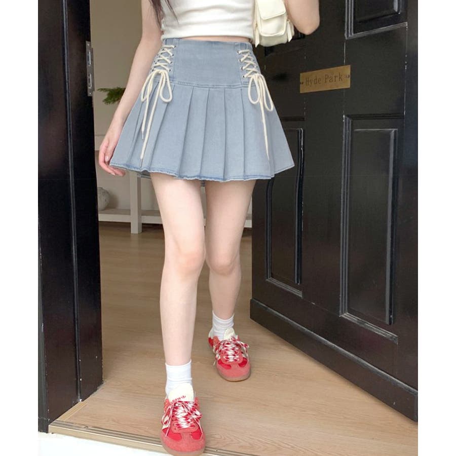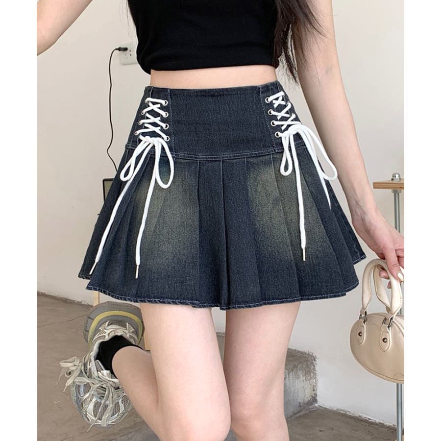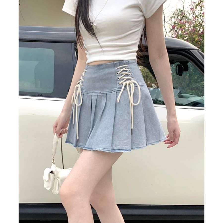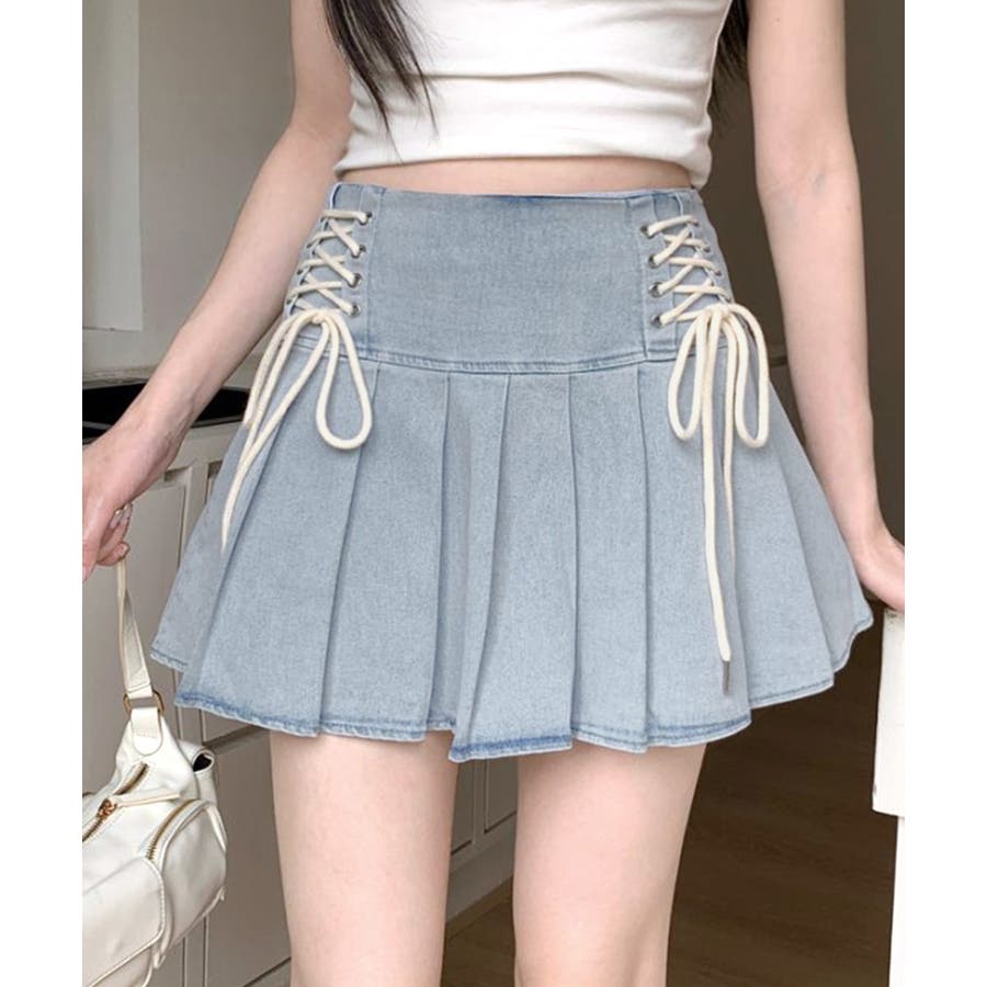 レースアップリボンデニムミニスカート インナーパンツ付き プリーツスカート