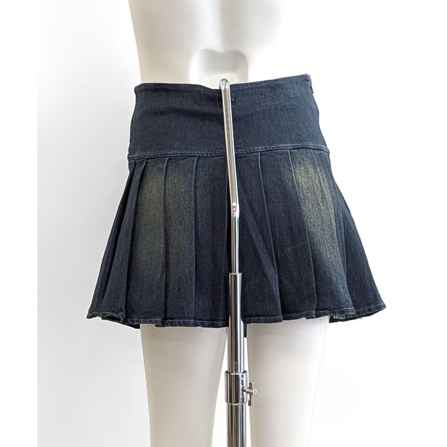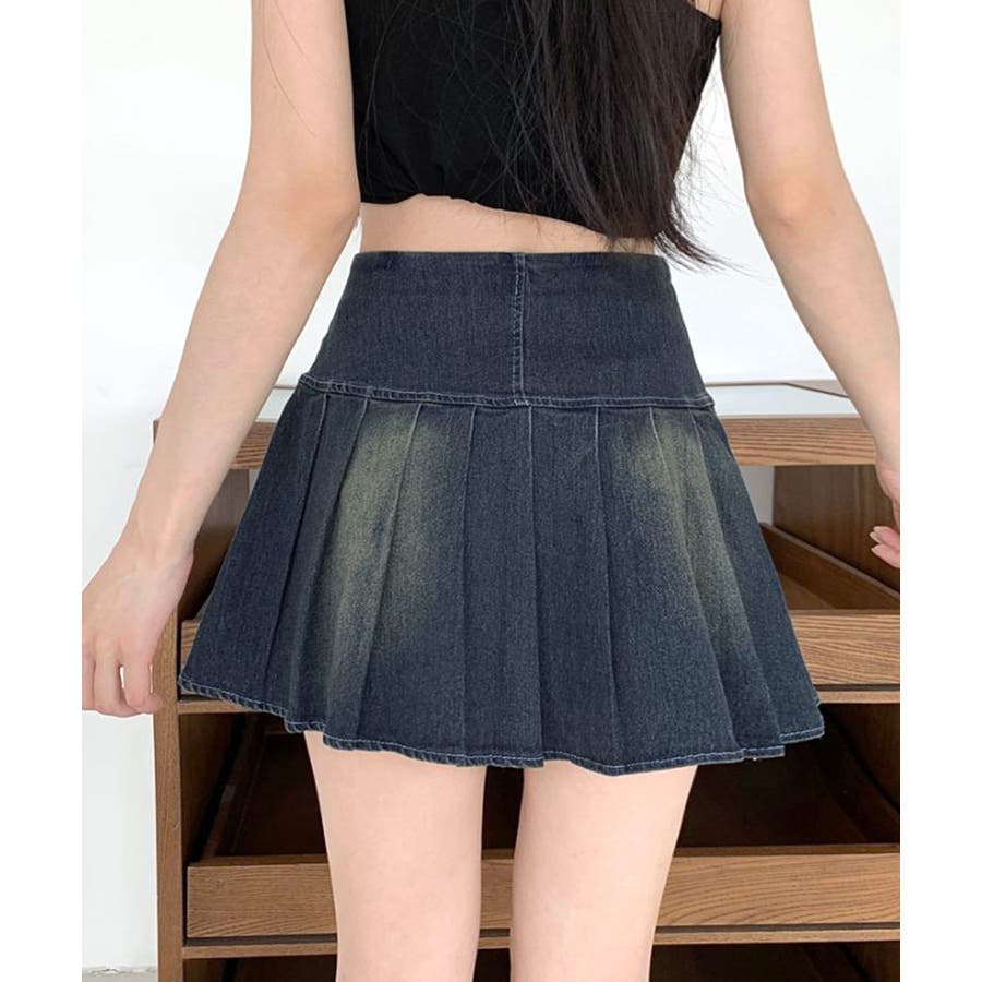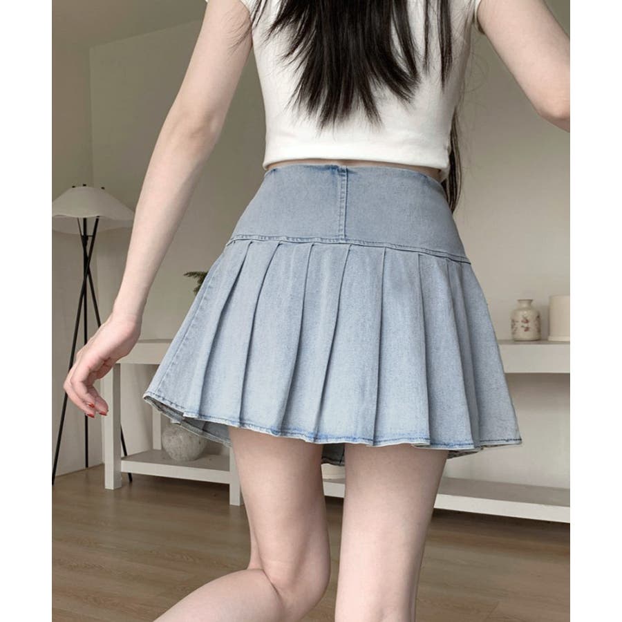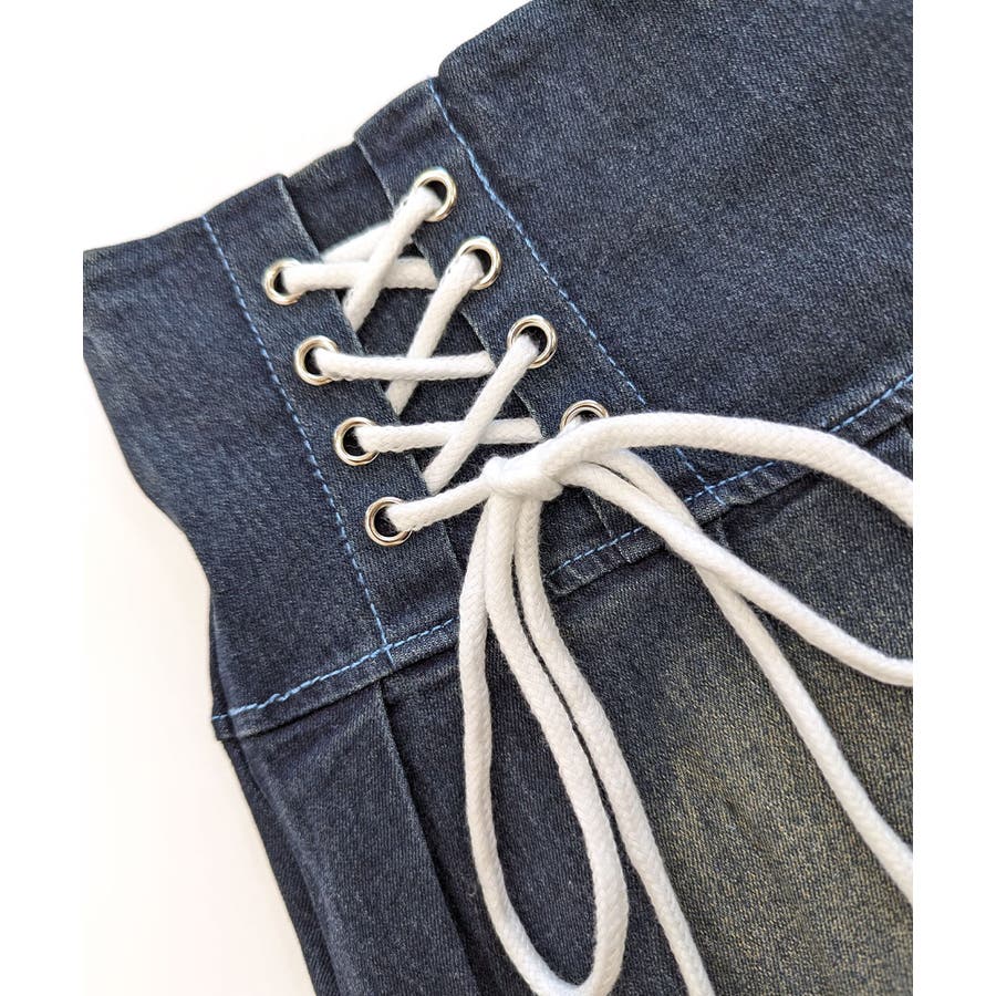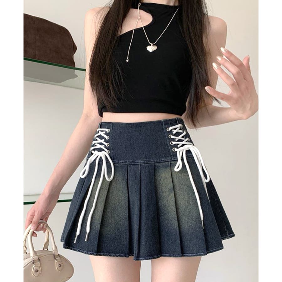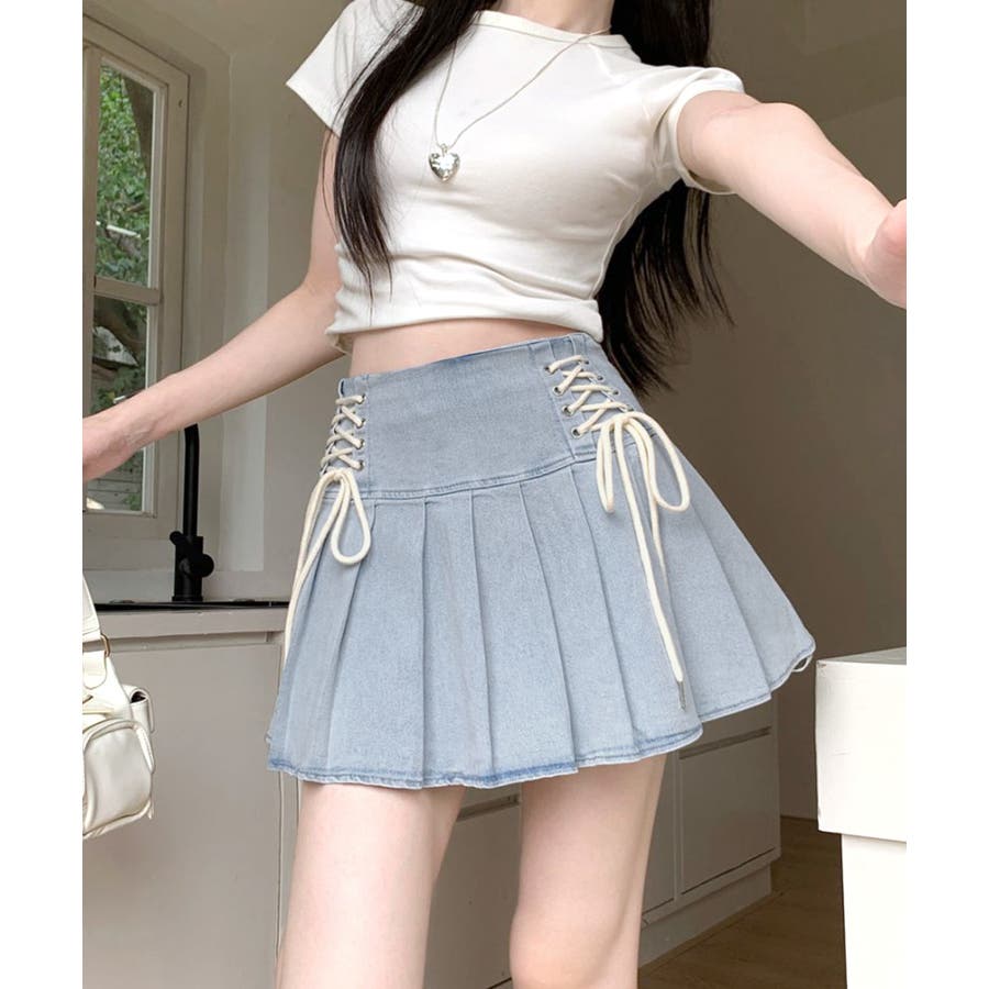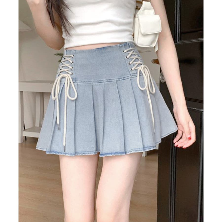 レースアップリボンデニムミニスカート インナーパンツ付き プリーツスカート