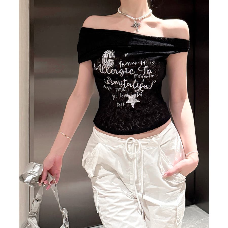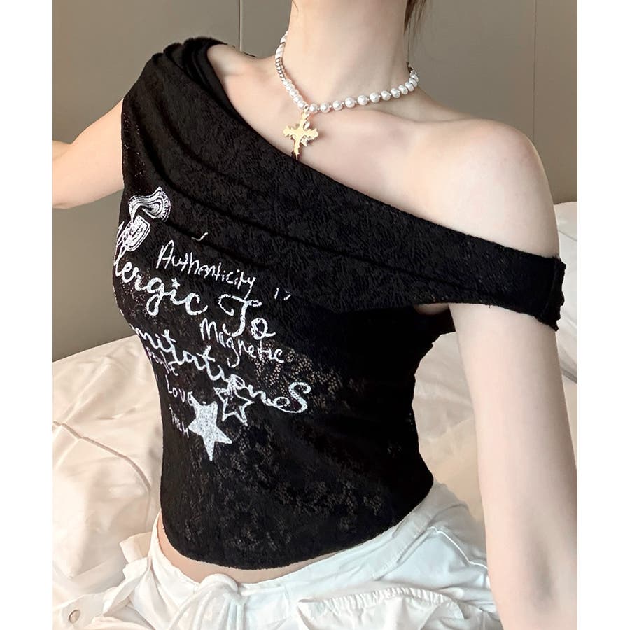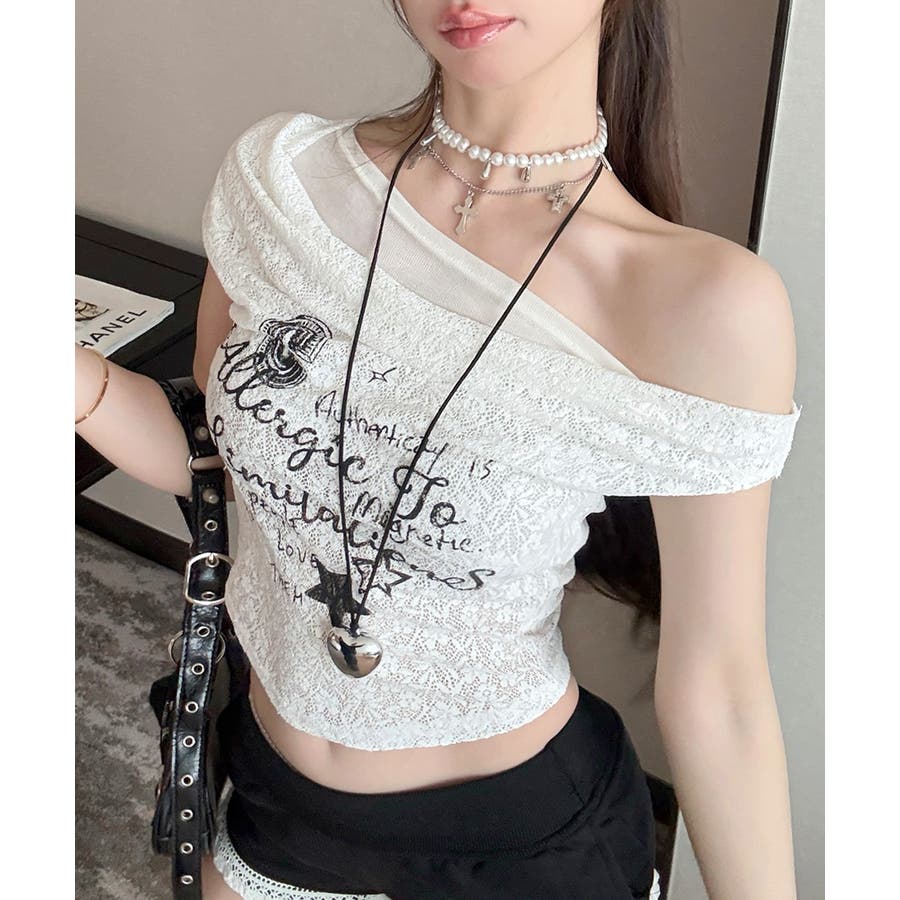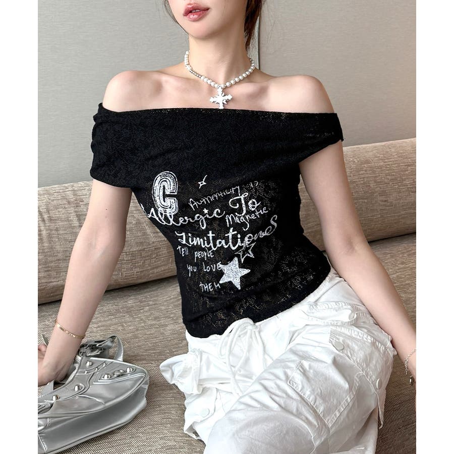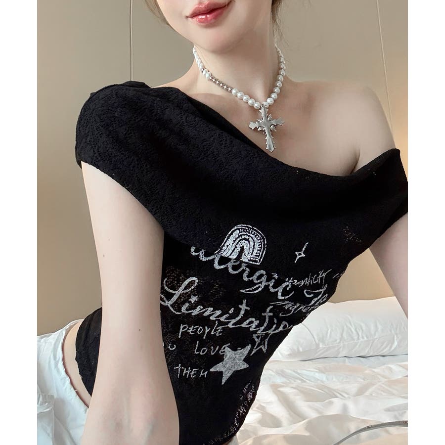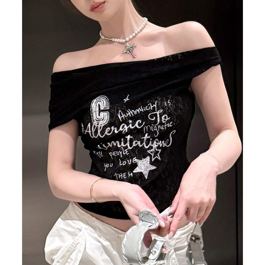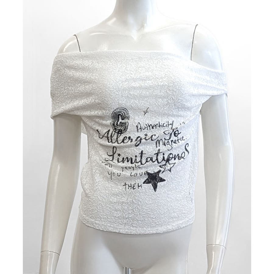 オフショルロゴレーストップス ワンショル ロゴプリント