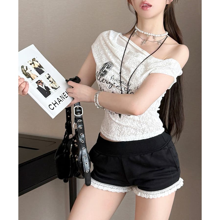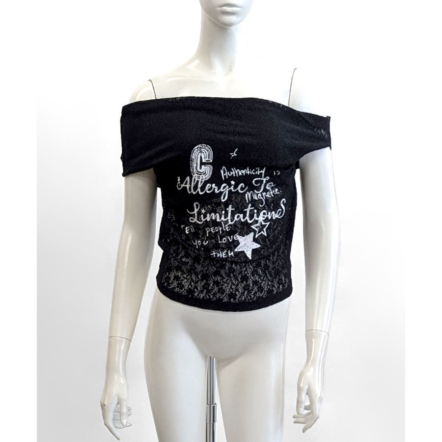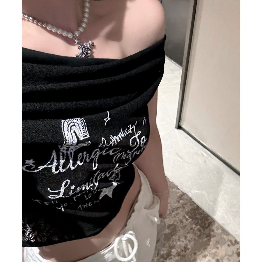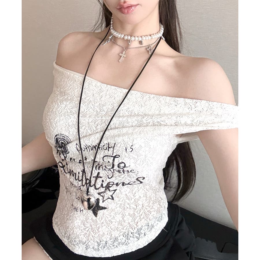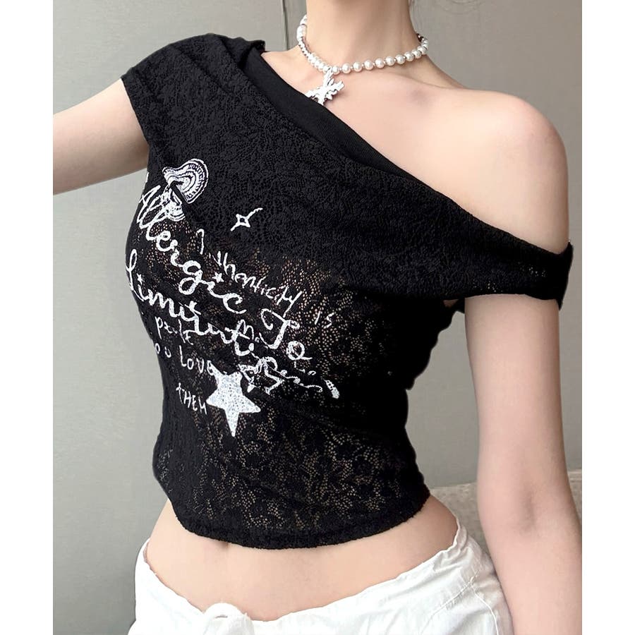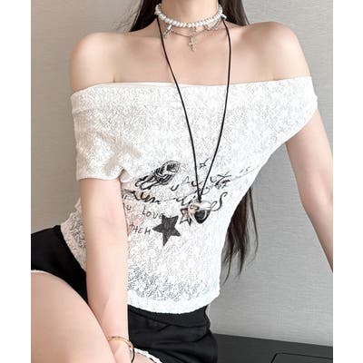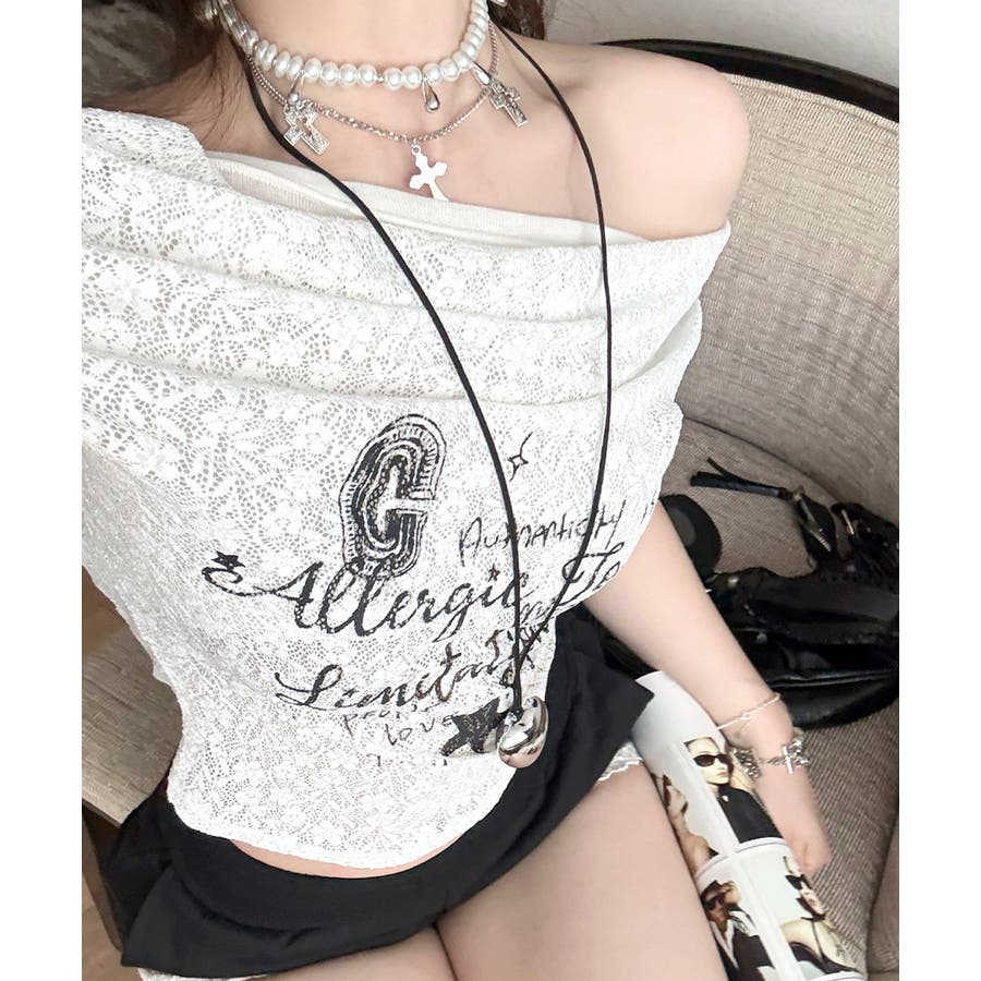 オフショルロゴレーストップス ワンショル ロゴプリント
