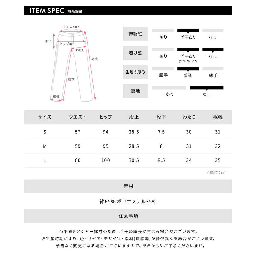 [L] ウエスト:60cm / ヒップ:100cm / 股上:30.5cm / 股下:8.5cm / わたり:35cm / 裾幅:35cm