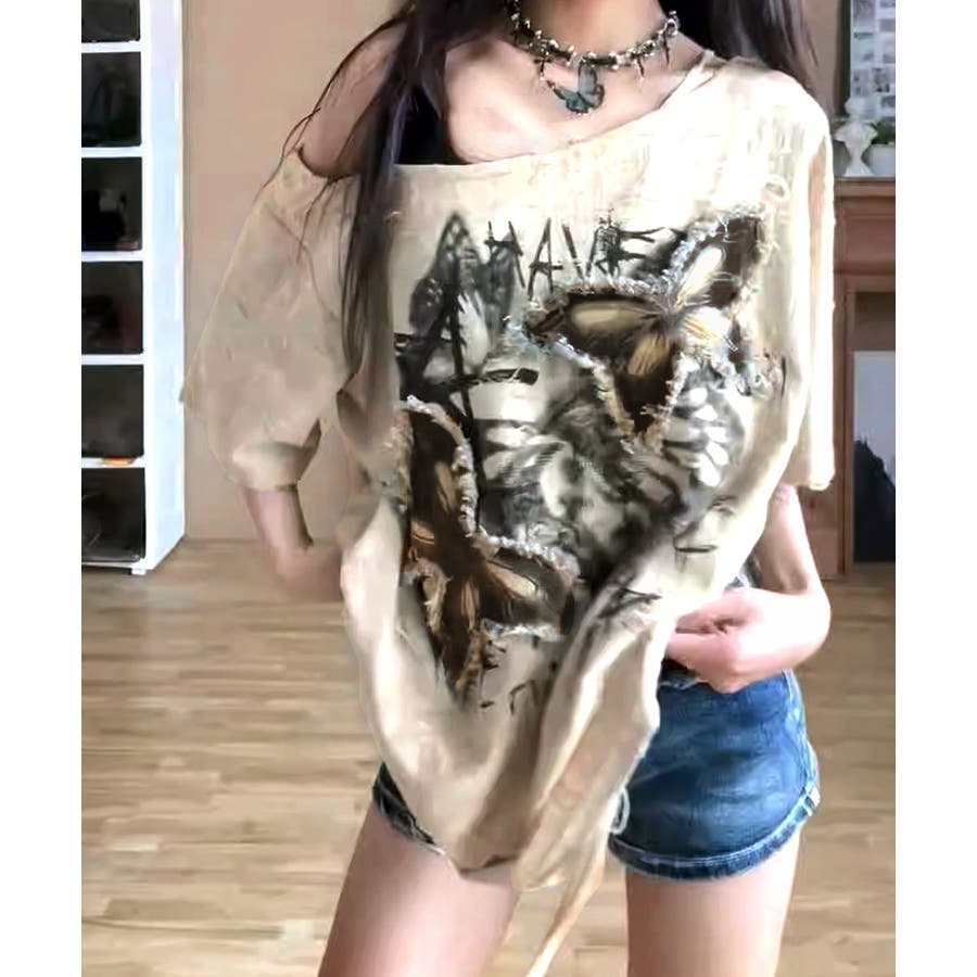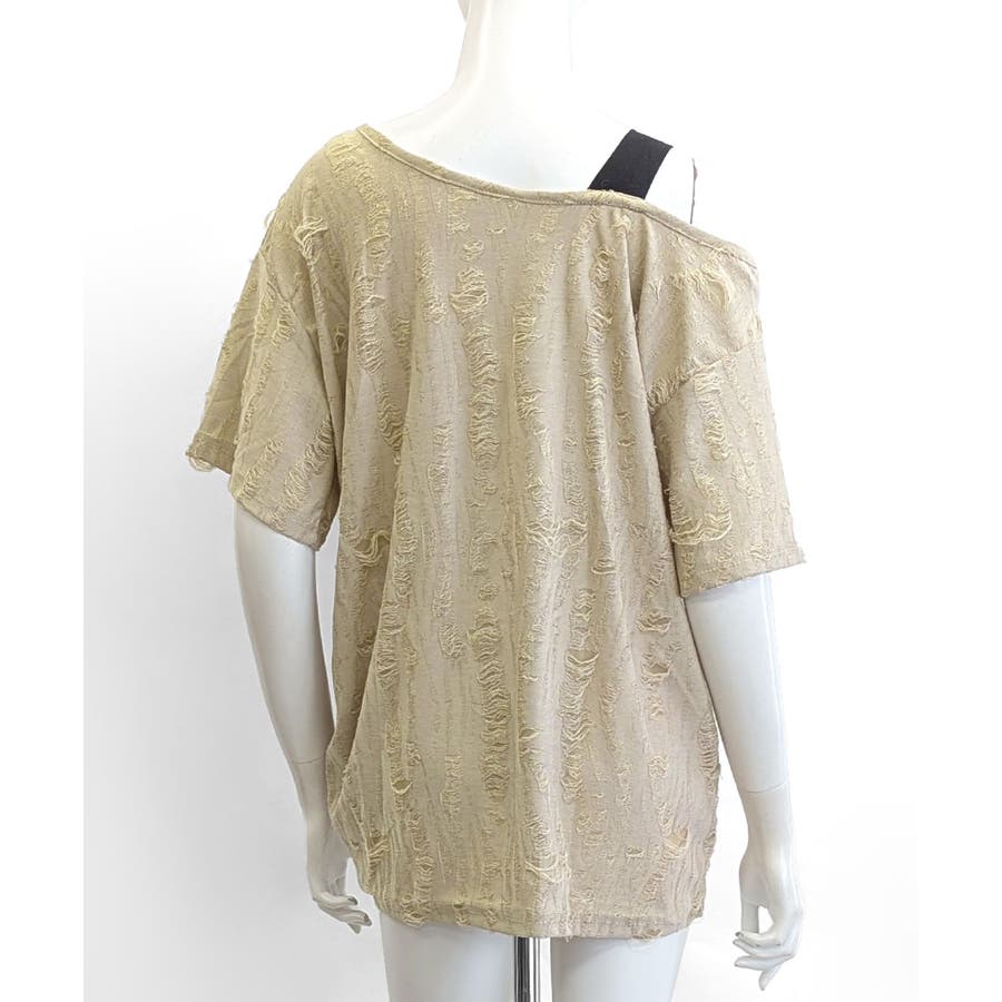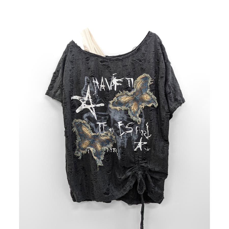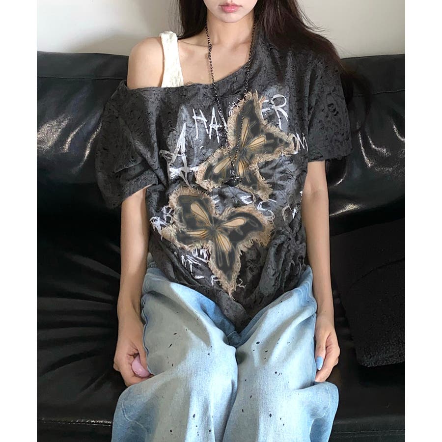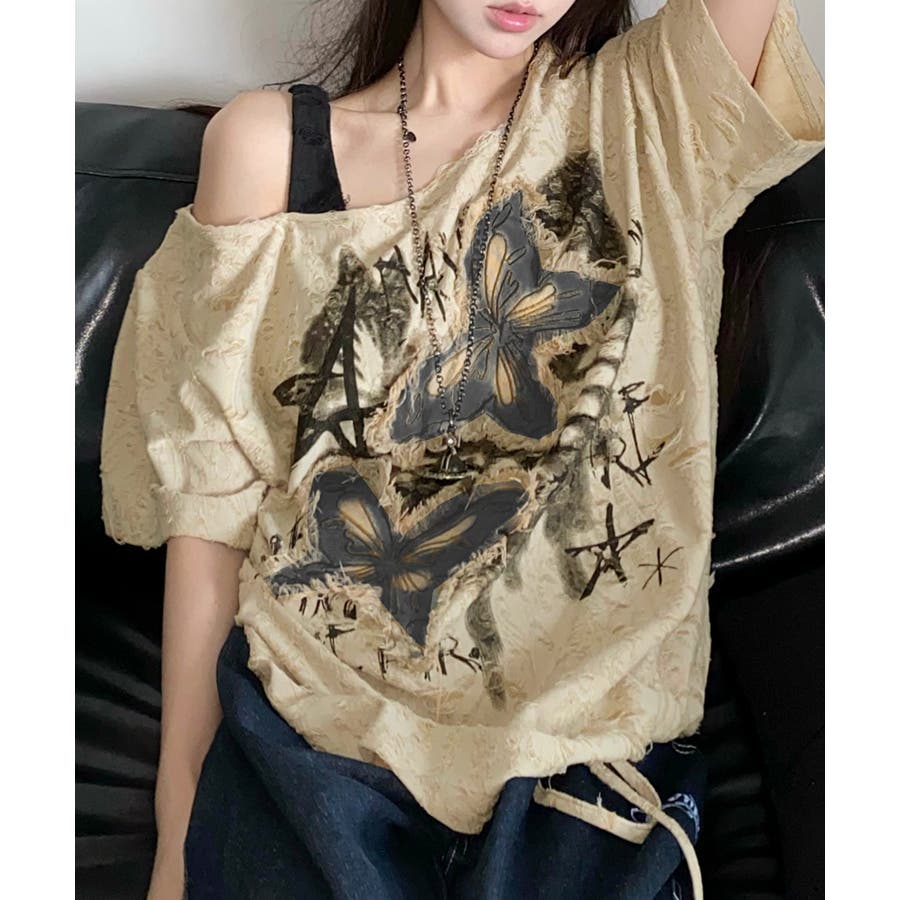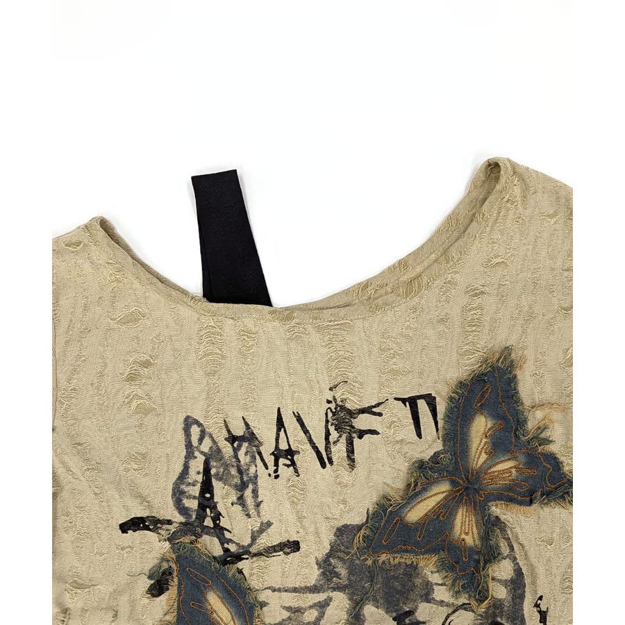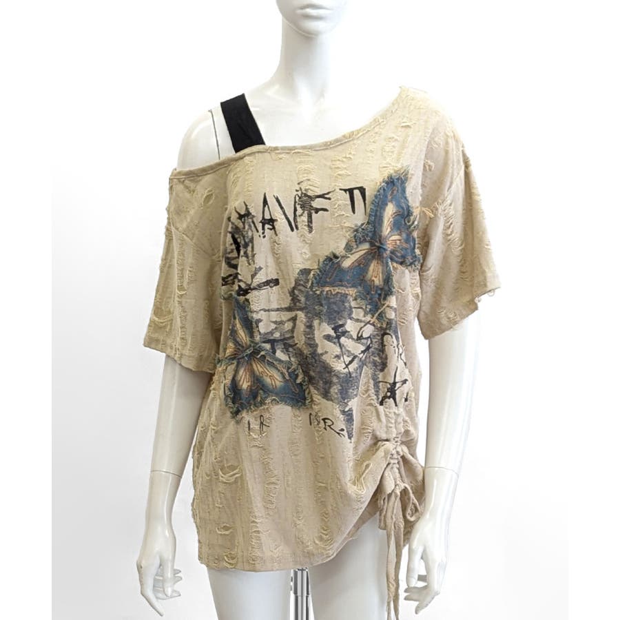 ワンショルダーバタフライ半袖Tシャツ ロゴプリント ワッペン