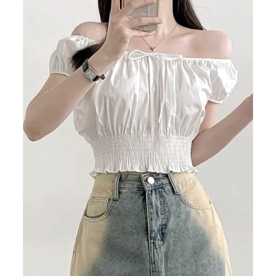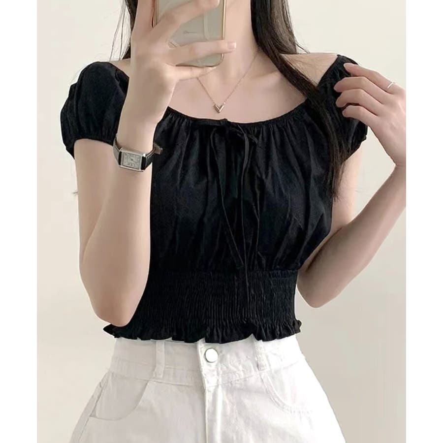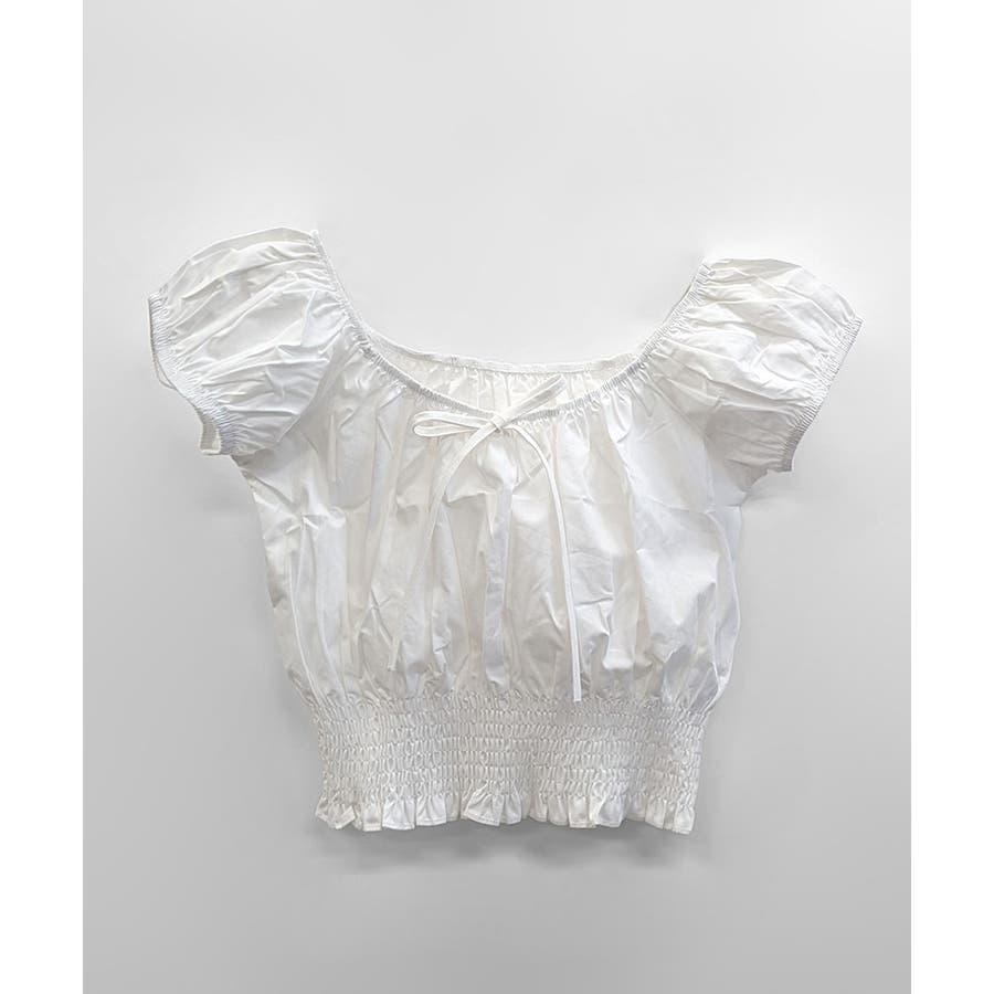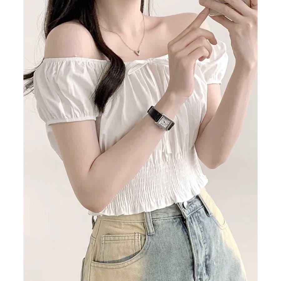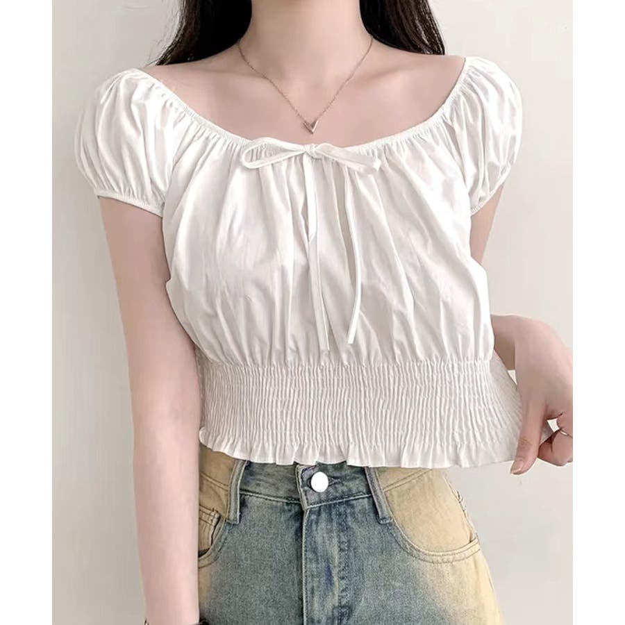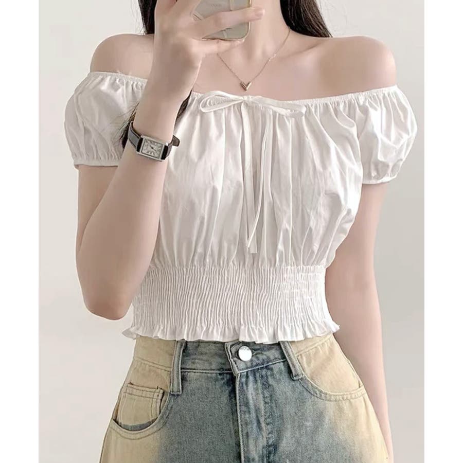 オフショルシャーリング半袖トップス パフスリーブ リボン