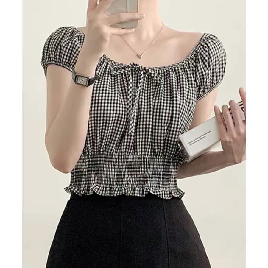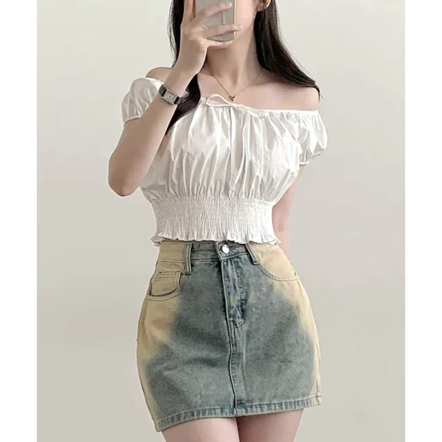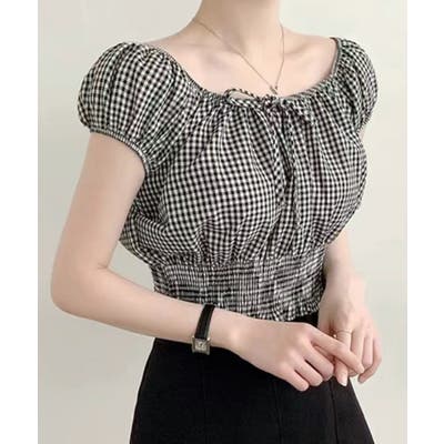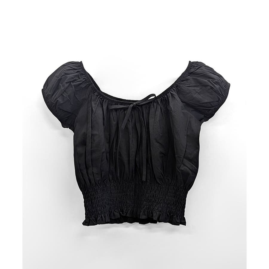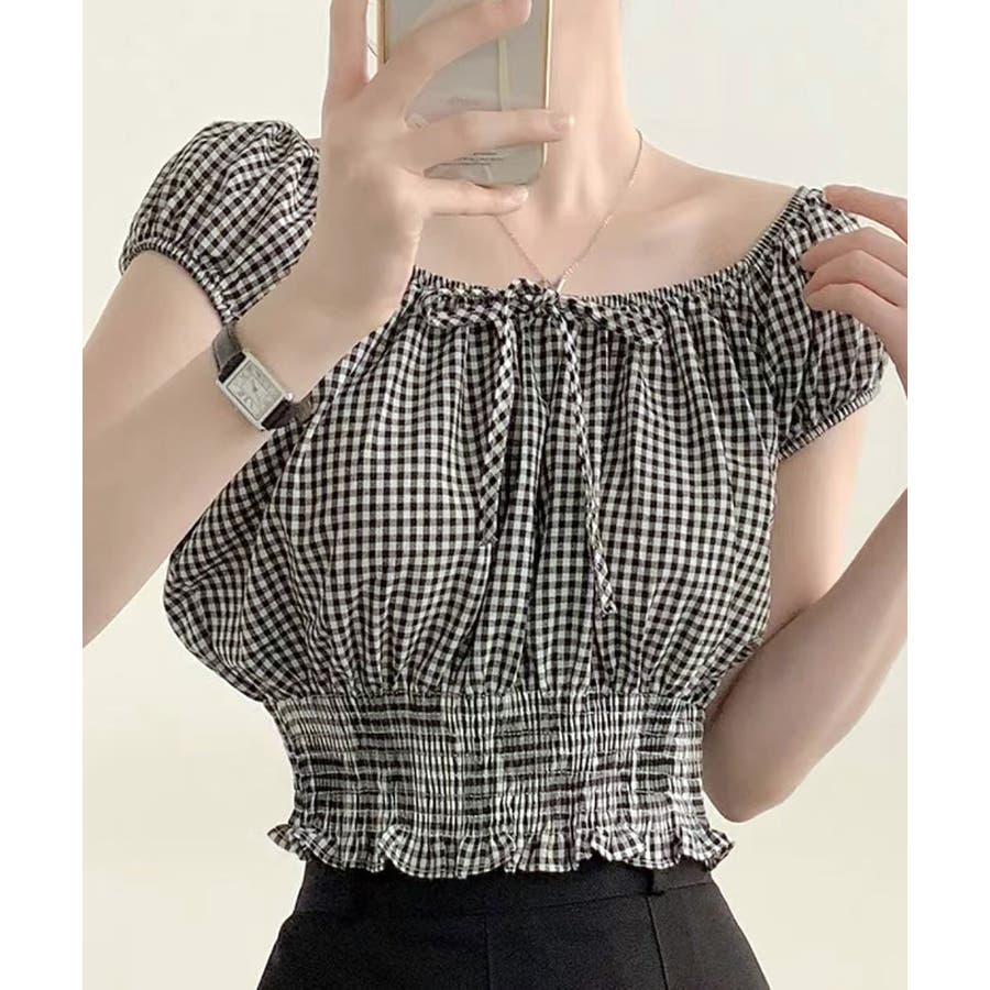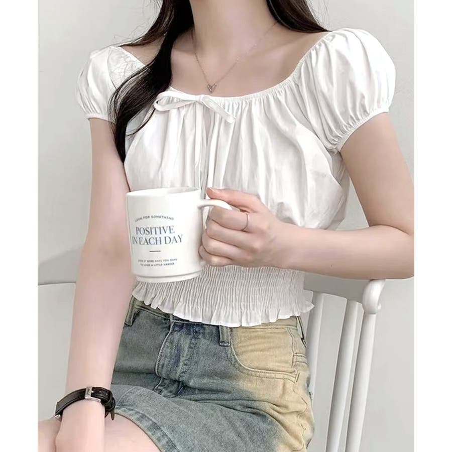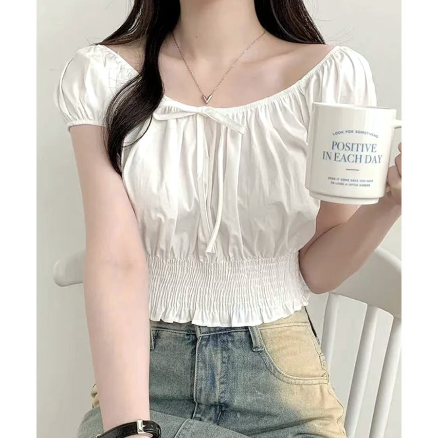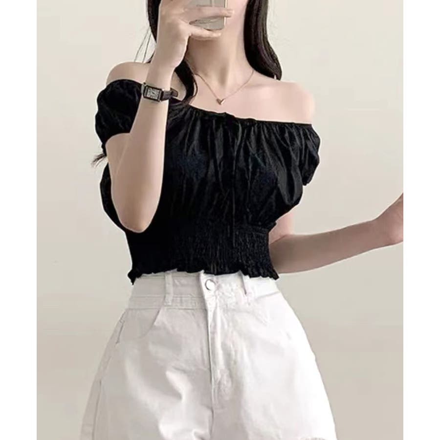 オフショルシャーリング半袖トップス パフスリーブ リボン