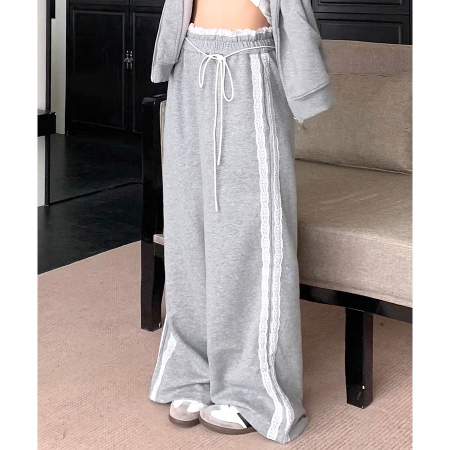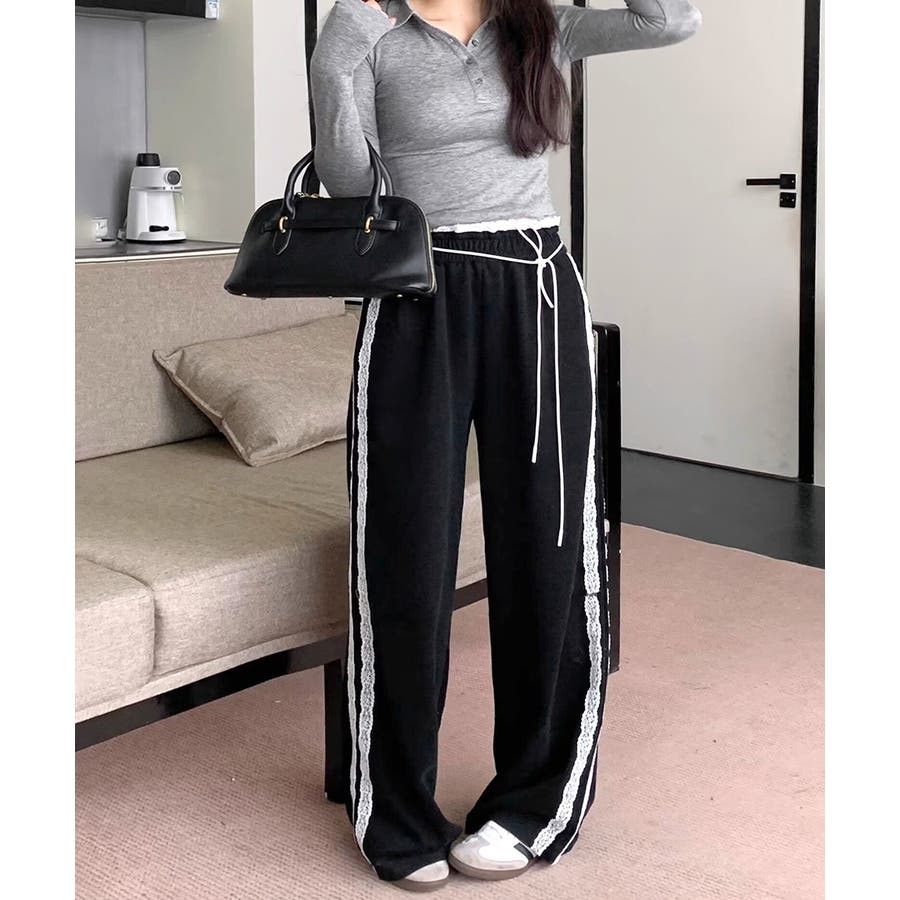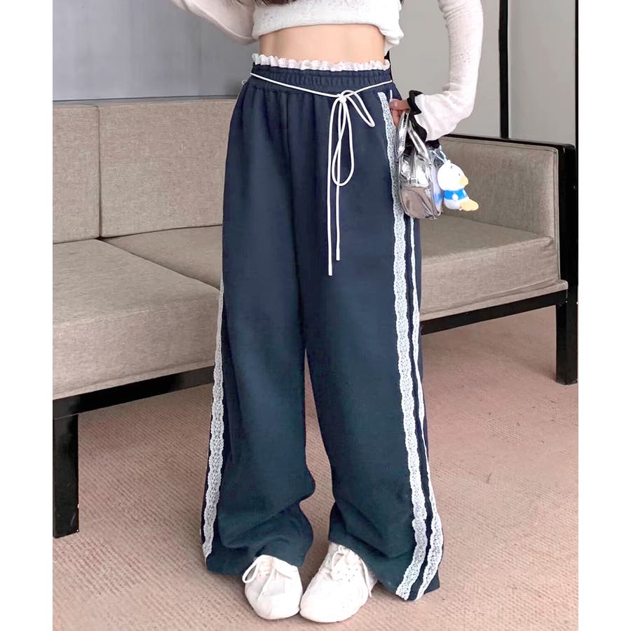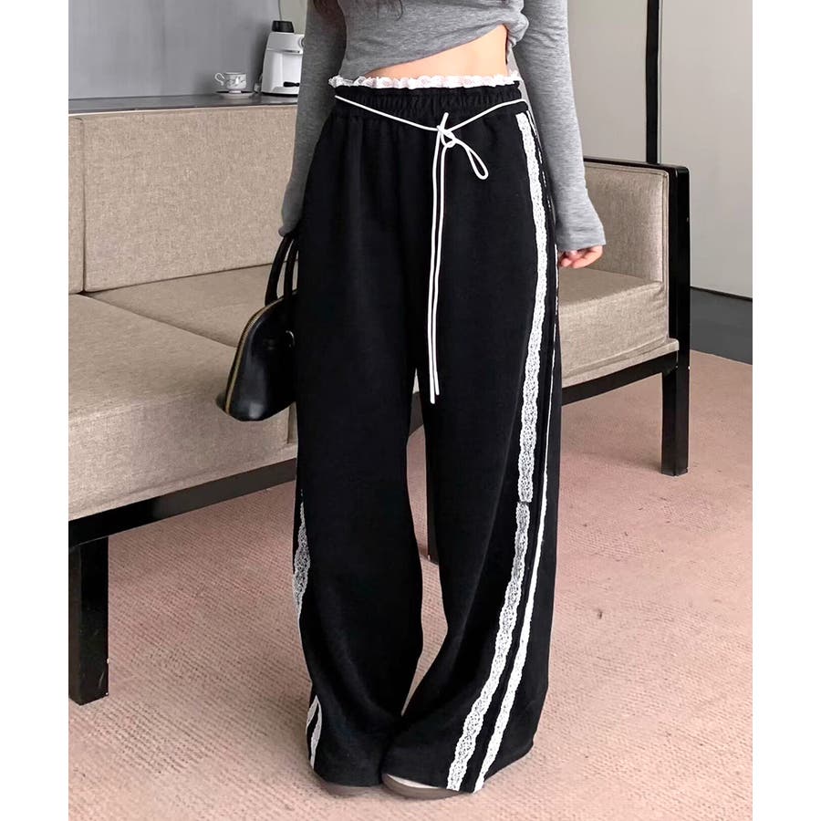 ウエストサイドレースワイドパンツ サイド刺繍 イージーパンツ