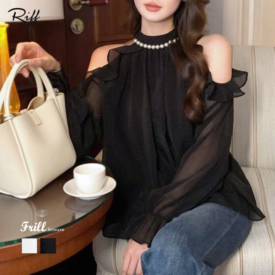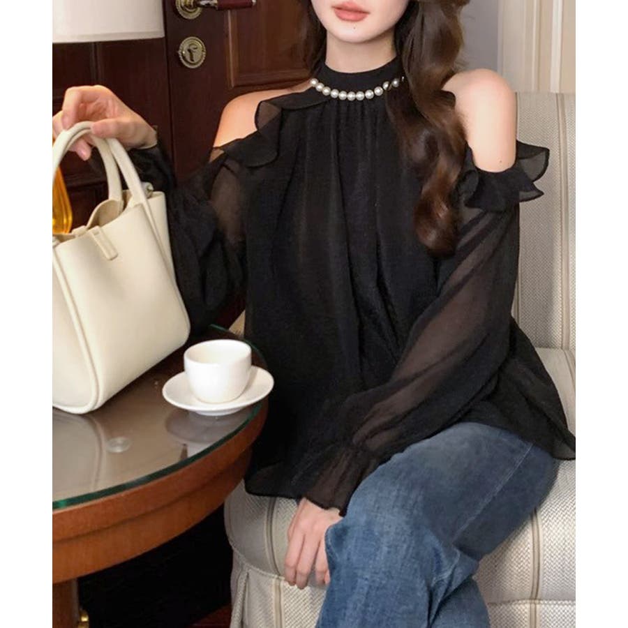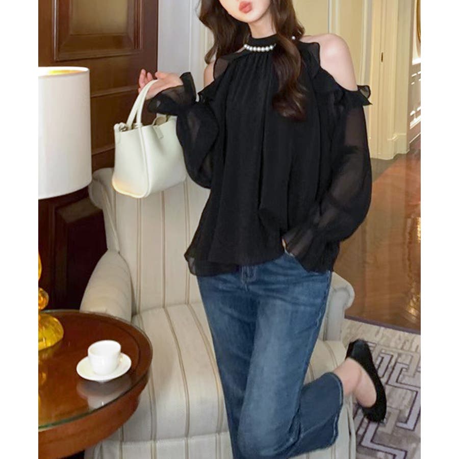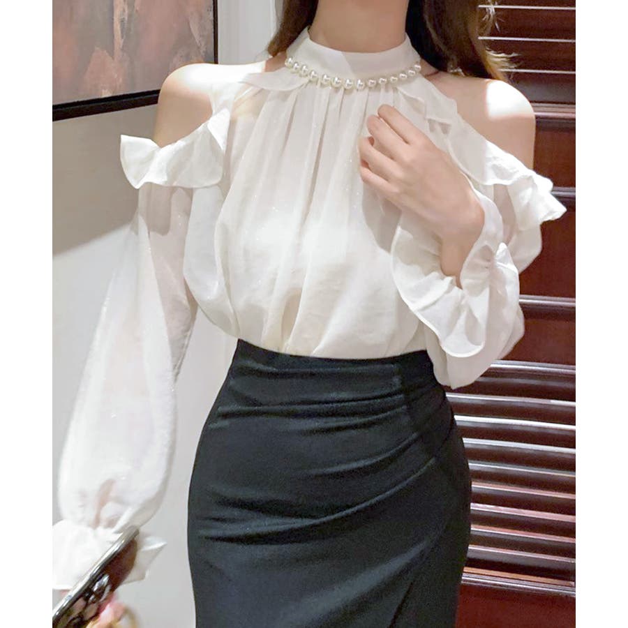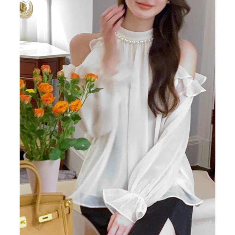 パールネックオープンショルダーシフォンブラウス フリル 肩開き
