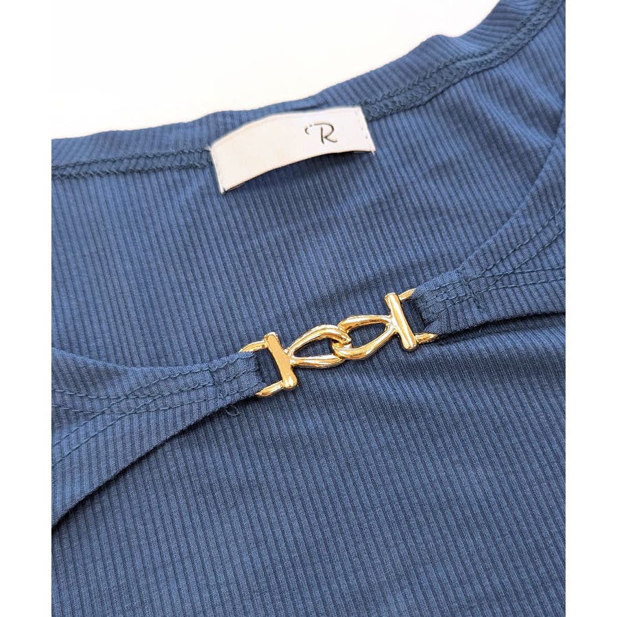 ・胸元のゴールドモチーフがアクセントになり、上品な印象に。