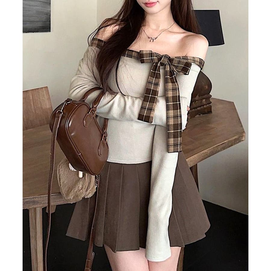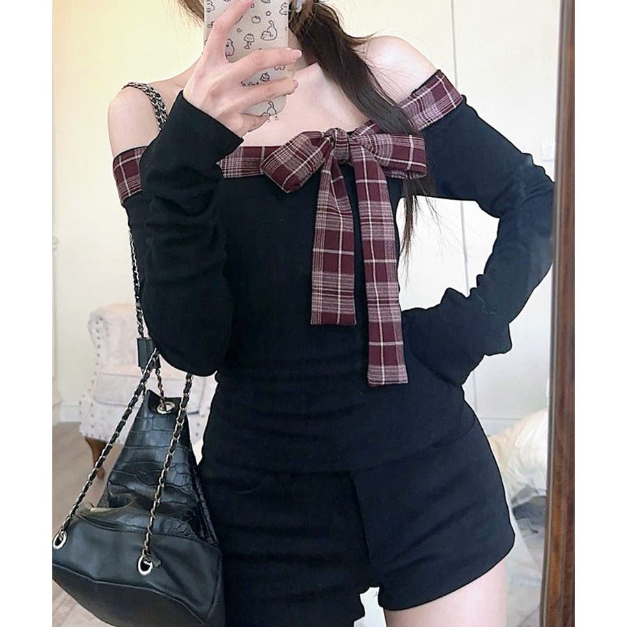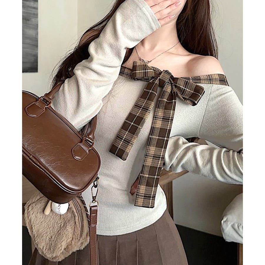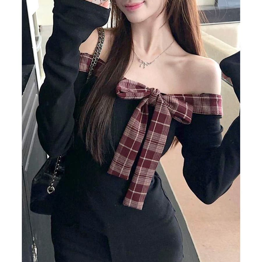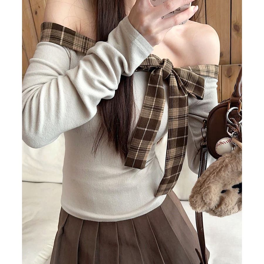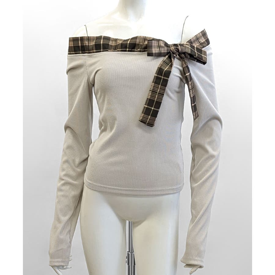 チェックリボンオフショルトップス