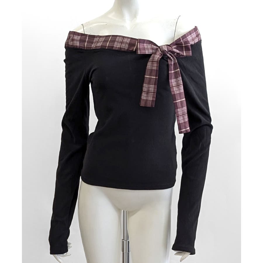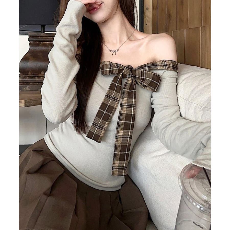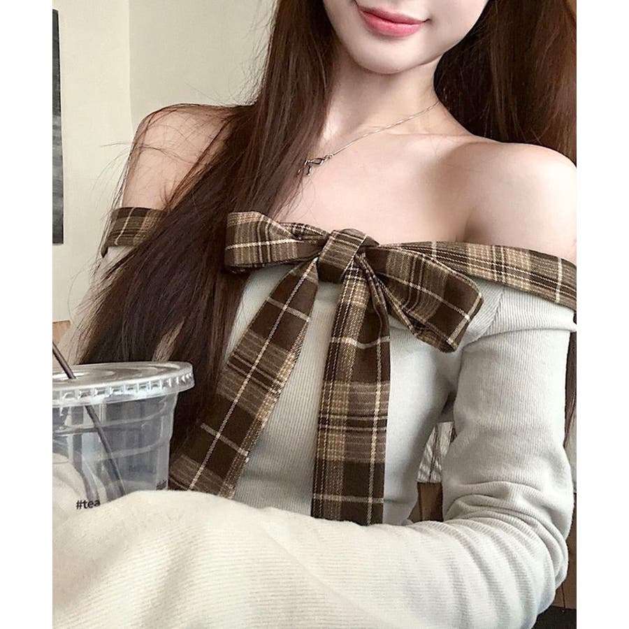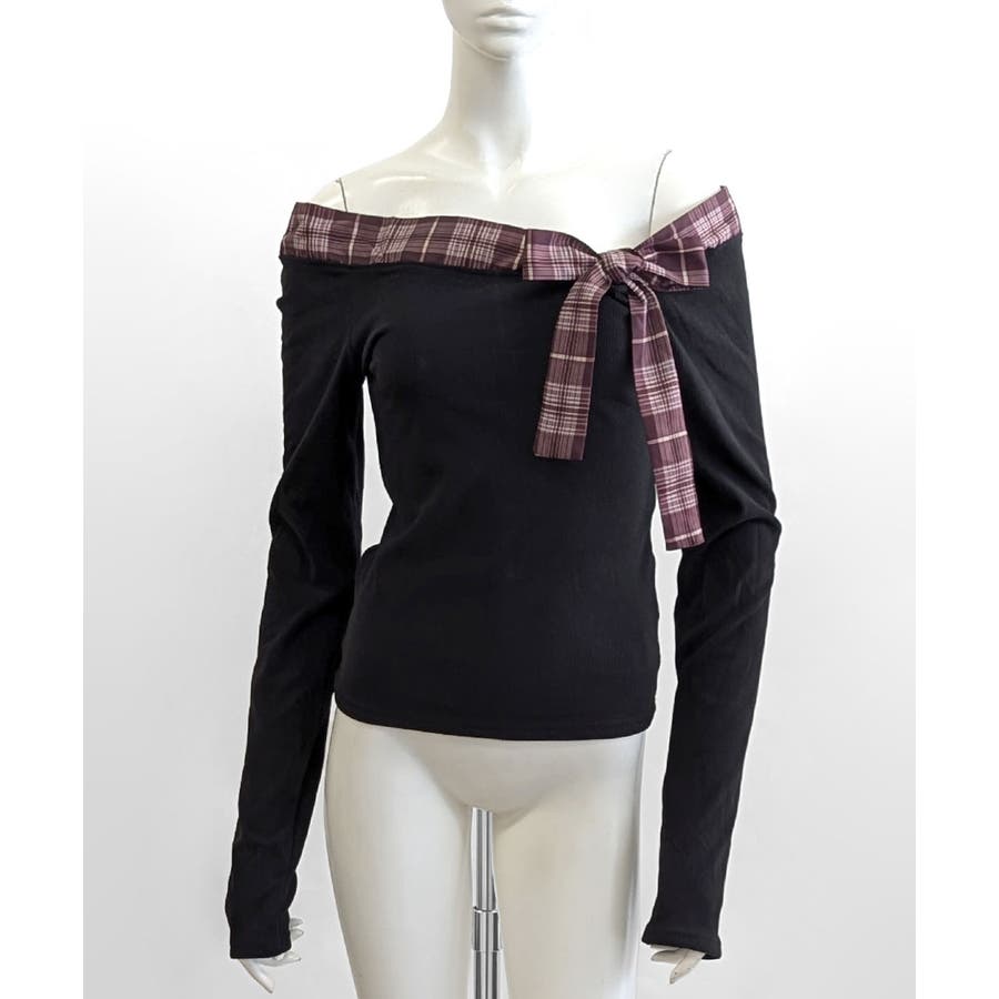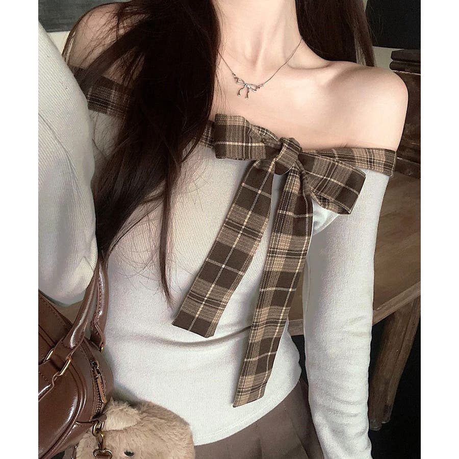 チェックリボンオフショルトップス オフショルダー Tシャツ