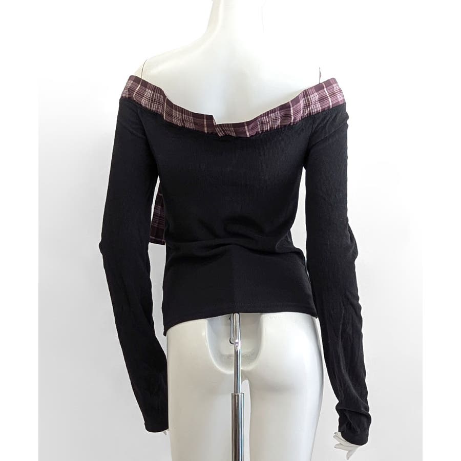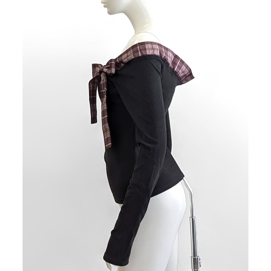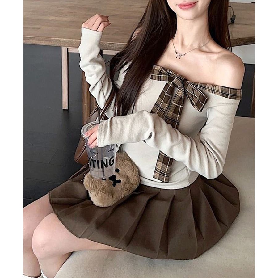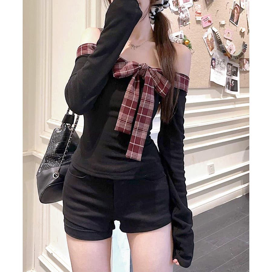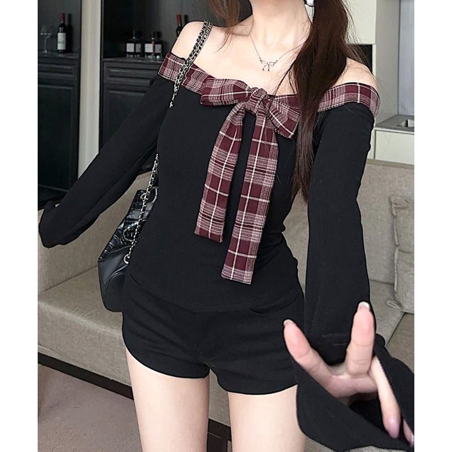 チェックリボンオフショルトップス オフショルダー Tシャツ